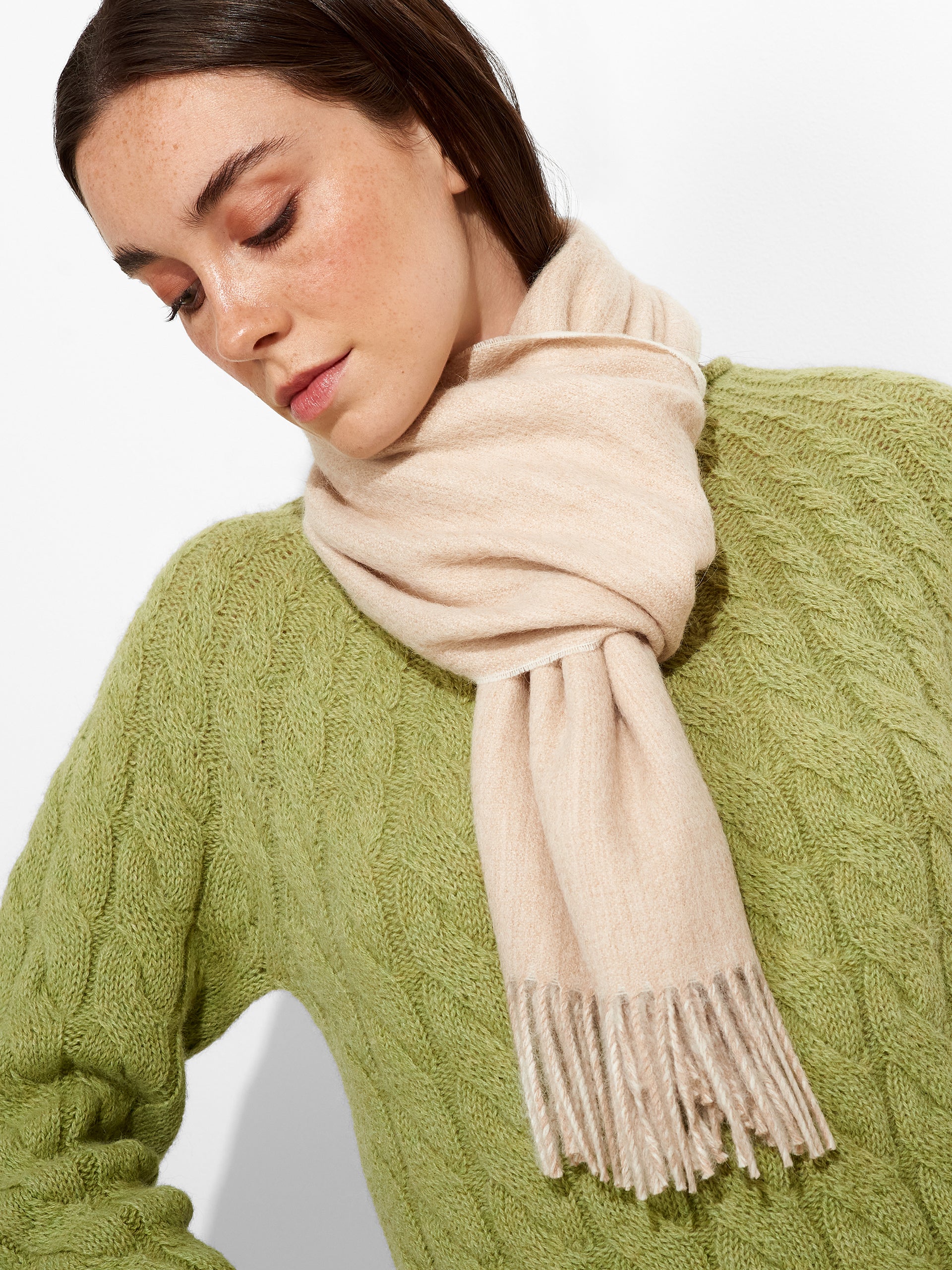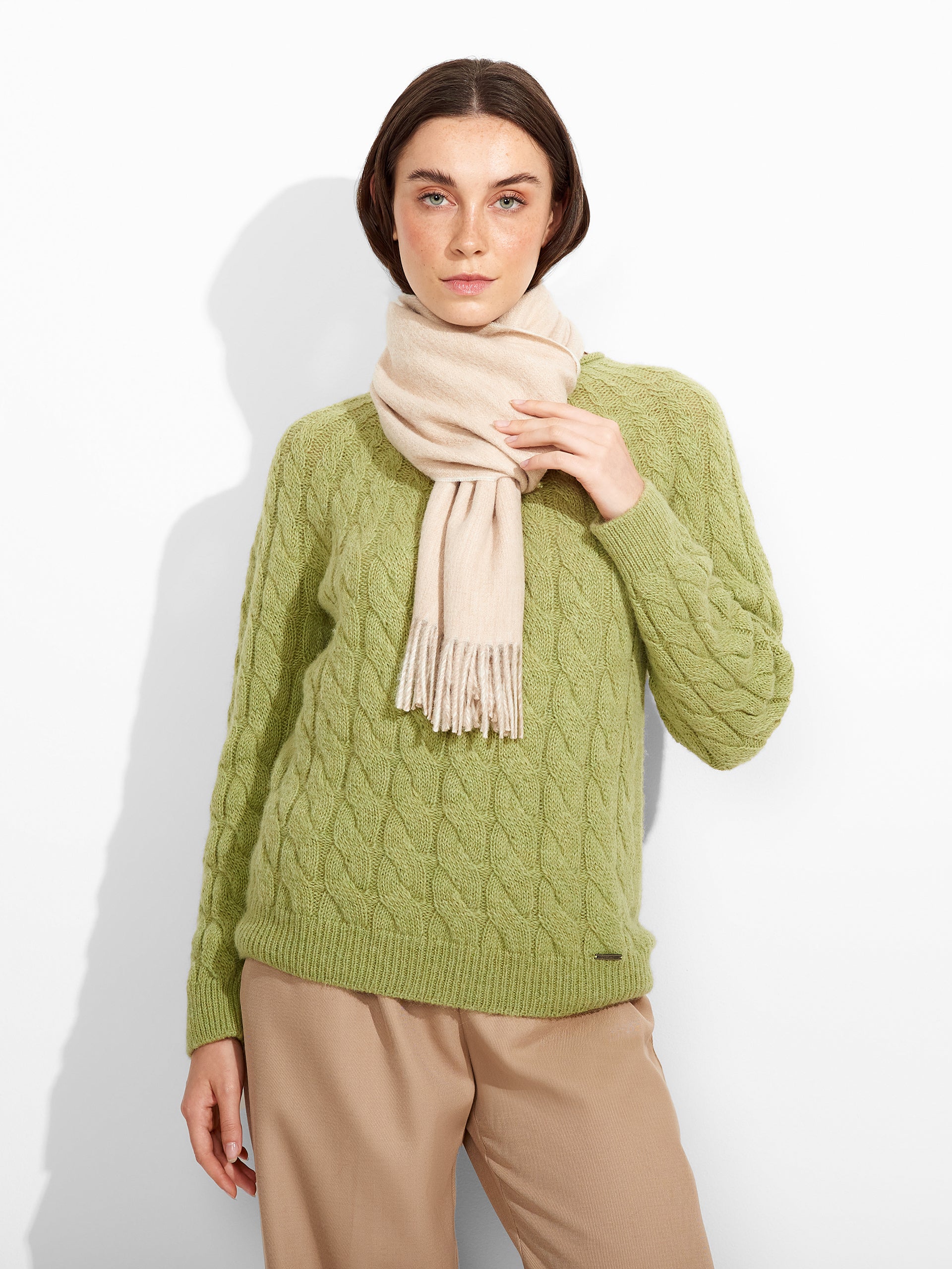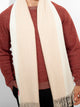 Chalina Tundra B en tonalidad beige, con diseño de doble cara que resalta dos colores predominantes. Acabada con bordes de flecos gruesos. Confeccionada en baby alpaca eco, brinda calidez y suavidad. | Material predominante: Baby Alpaca