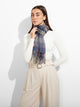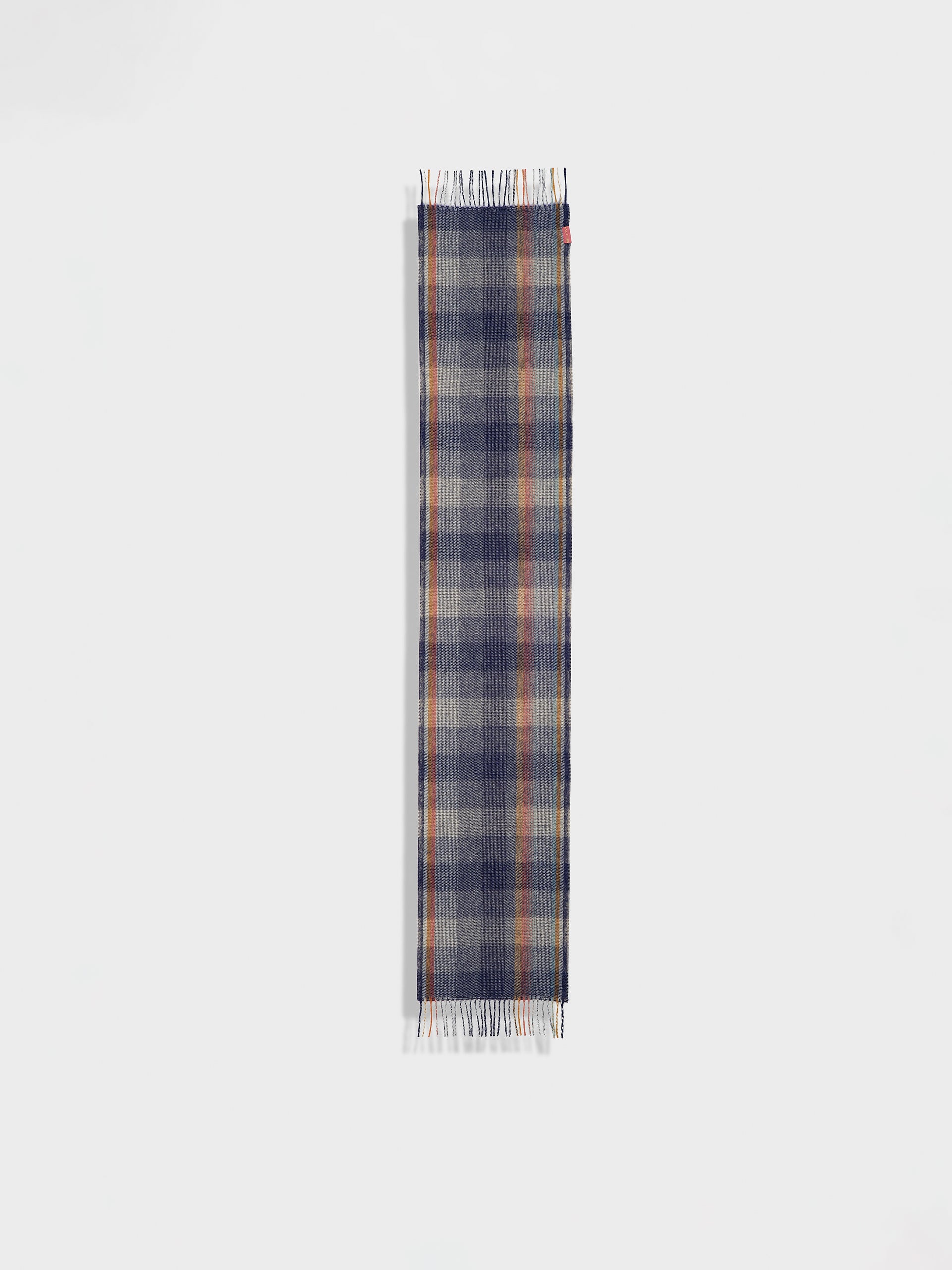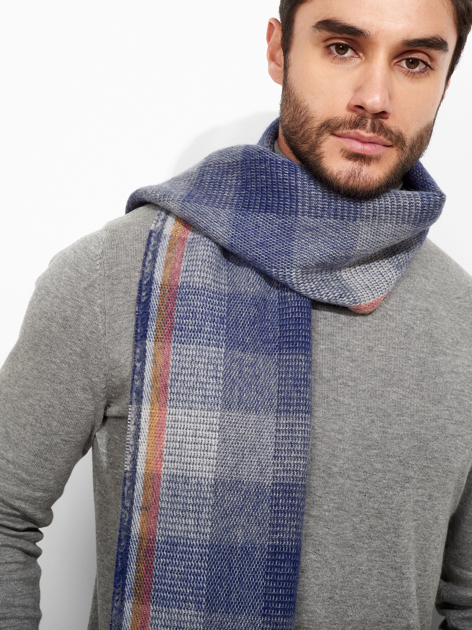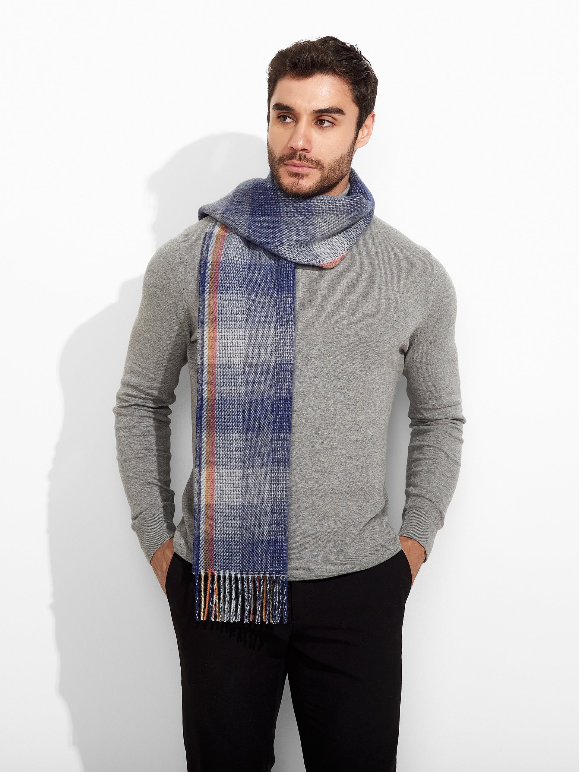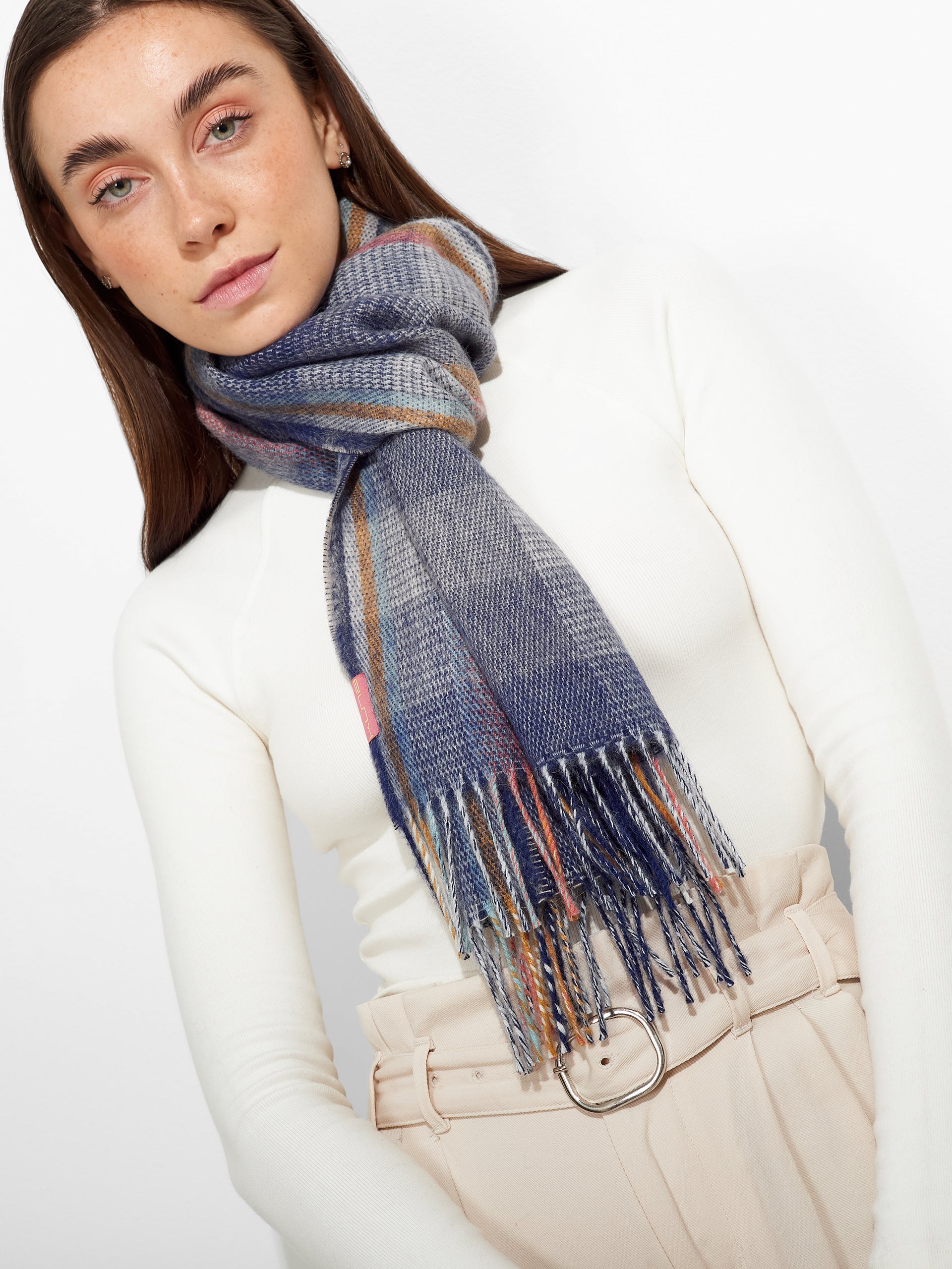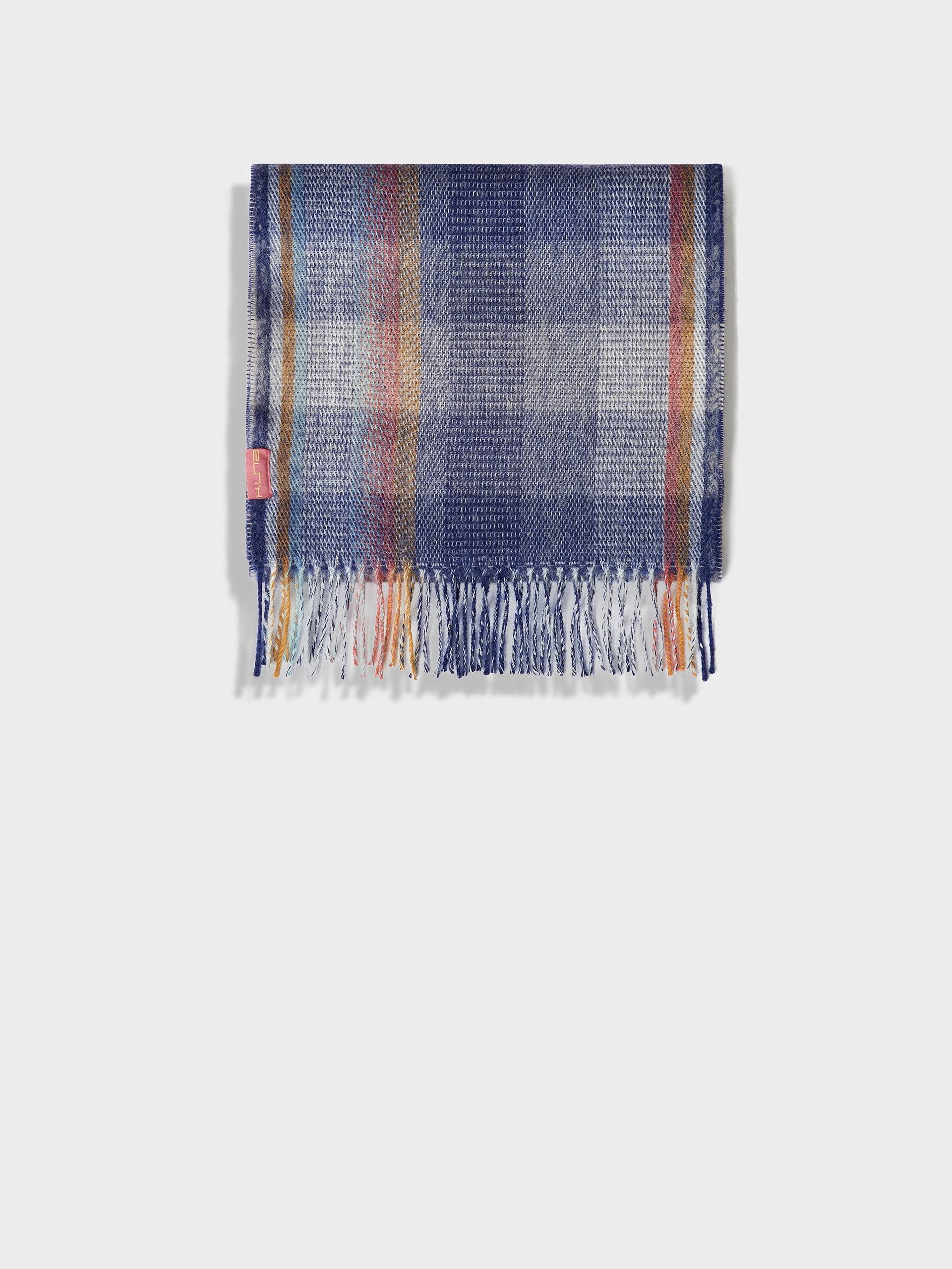 Chalina Zamery en tonalidad azul, con un patrón de cuadros grandes que incorpora un sutil efecto degradado, presenta bordes con flecos finos. Confeccionada en baby alpaca, brinda calidez y suavidad. | Material predominante: Baby Alpaca