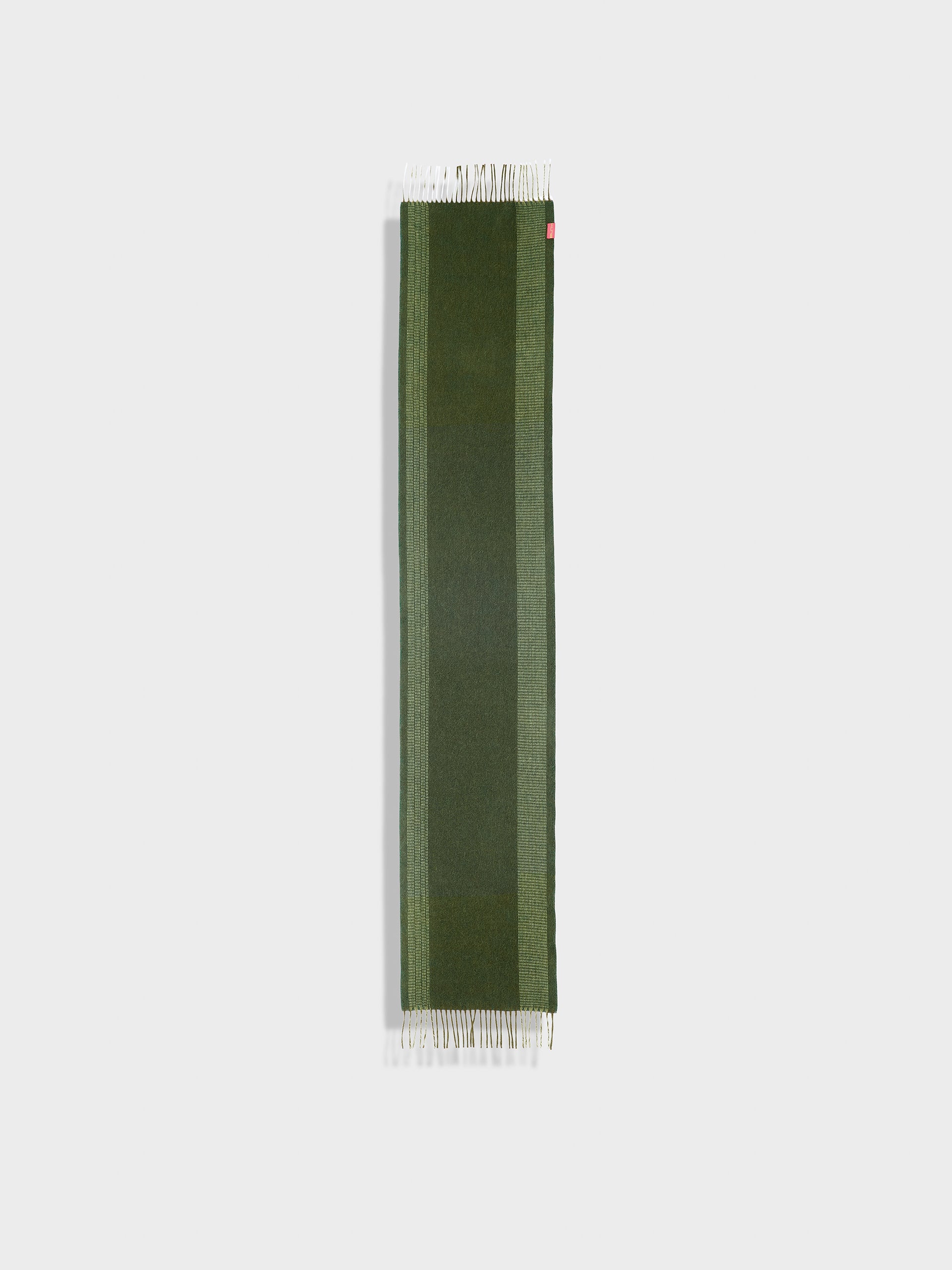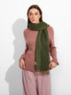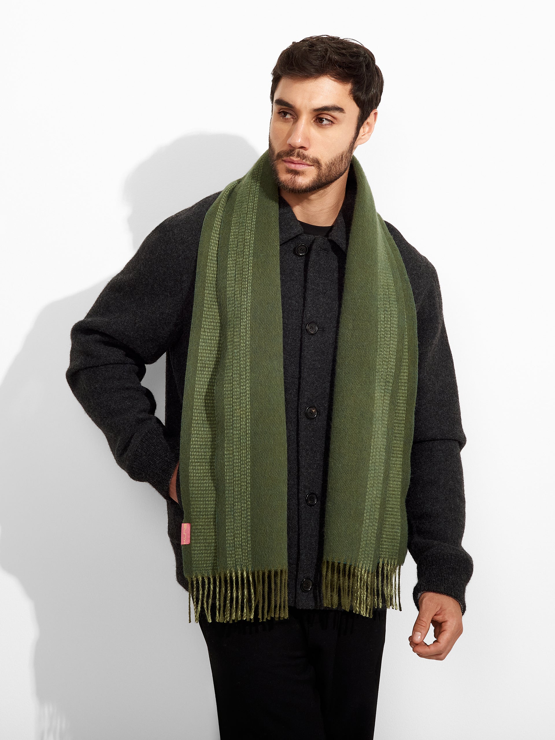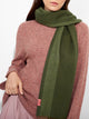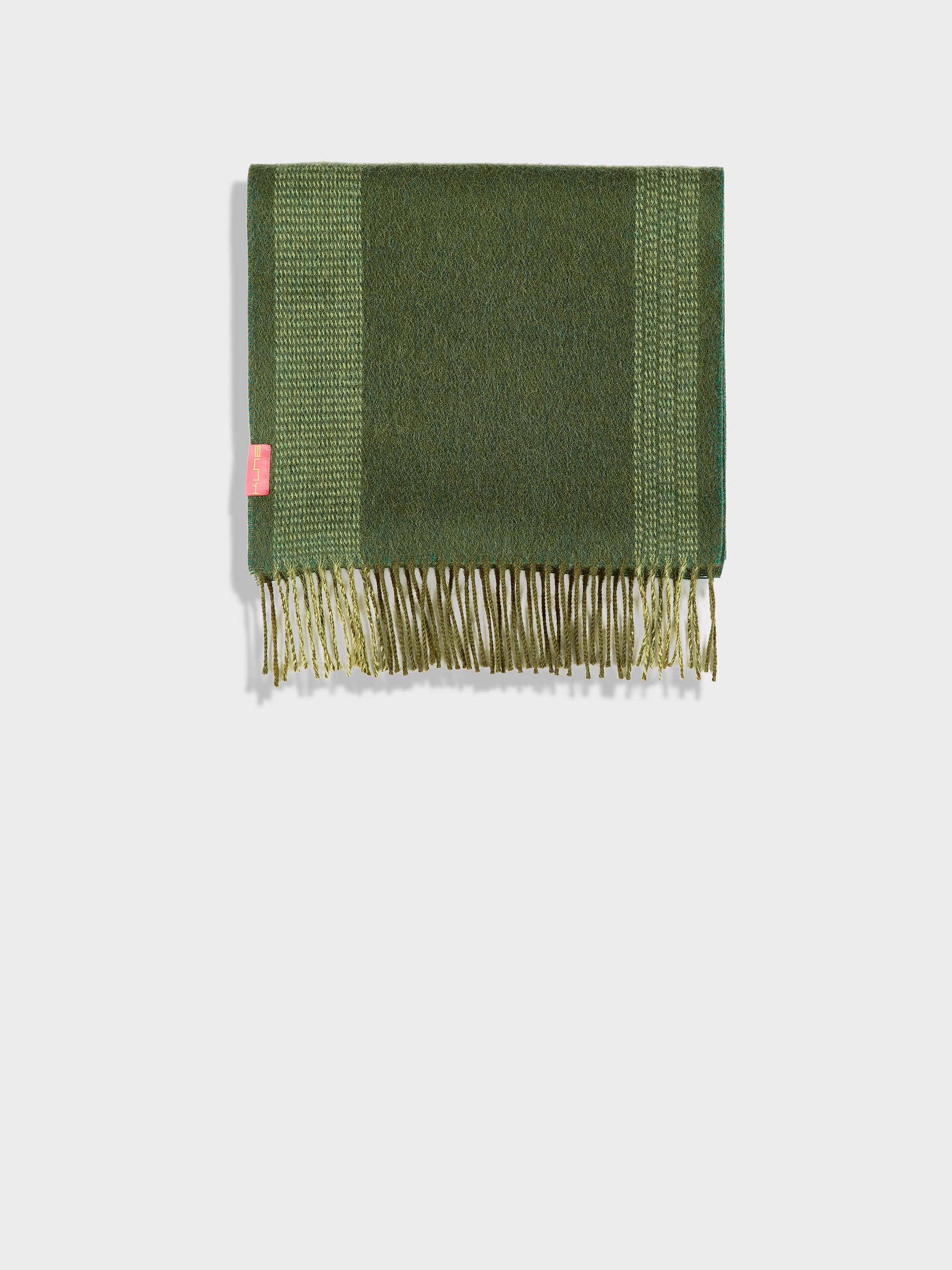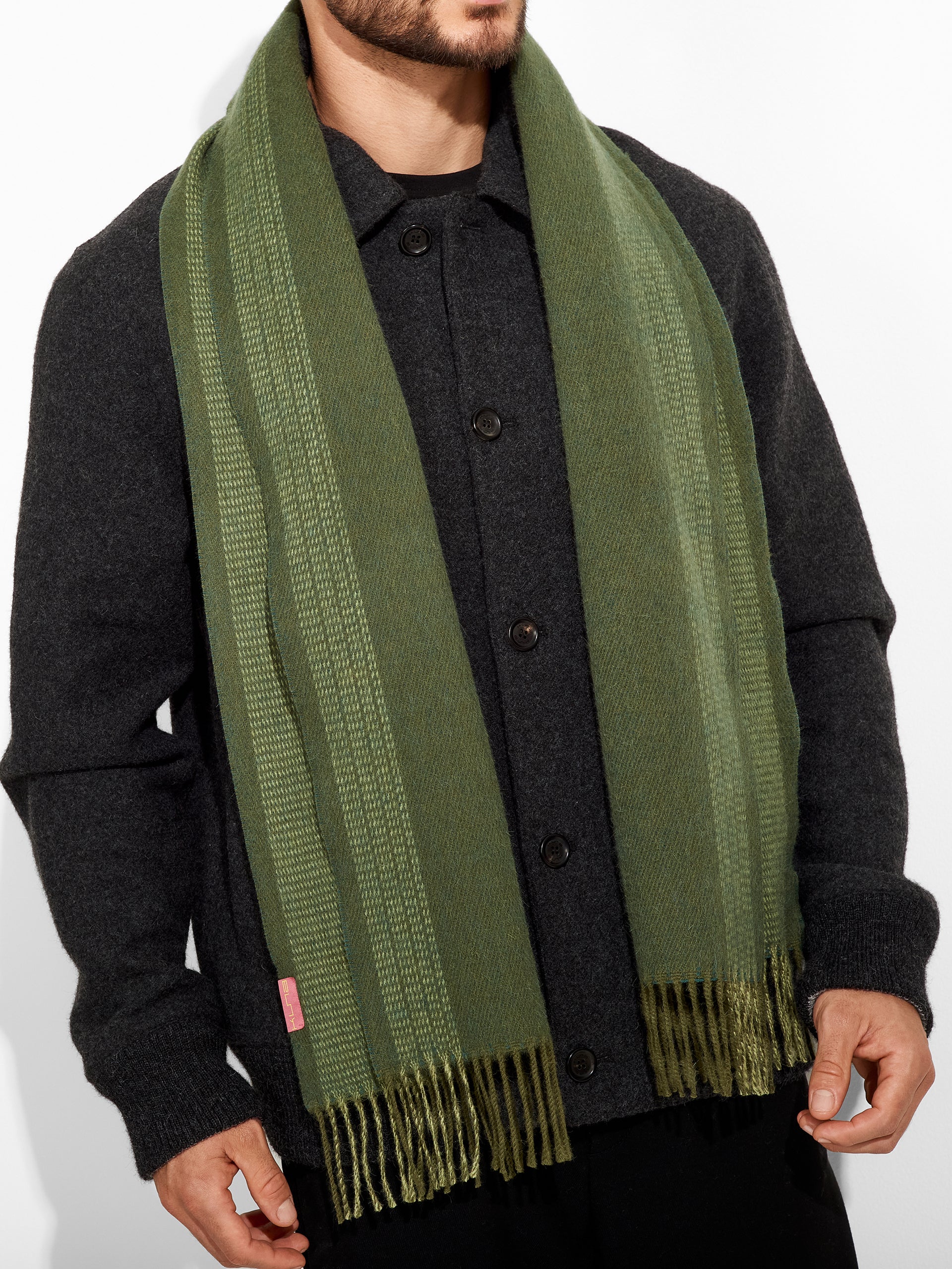 Chalina Zarick en tonalidad verde, con diseño de rayas verticales anchas. Los bordes presentan flecos gruesos de doble color. Confeccionada en baby alpaca, brinda calidez y suavidad. | Material predominante: Baby Alpaca