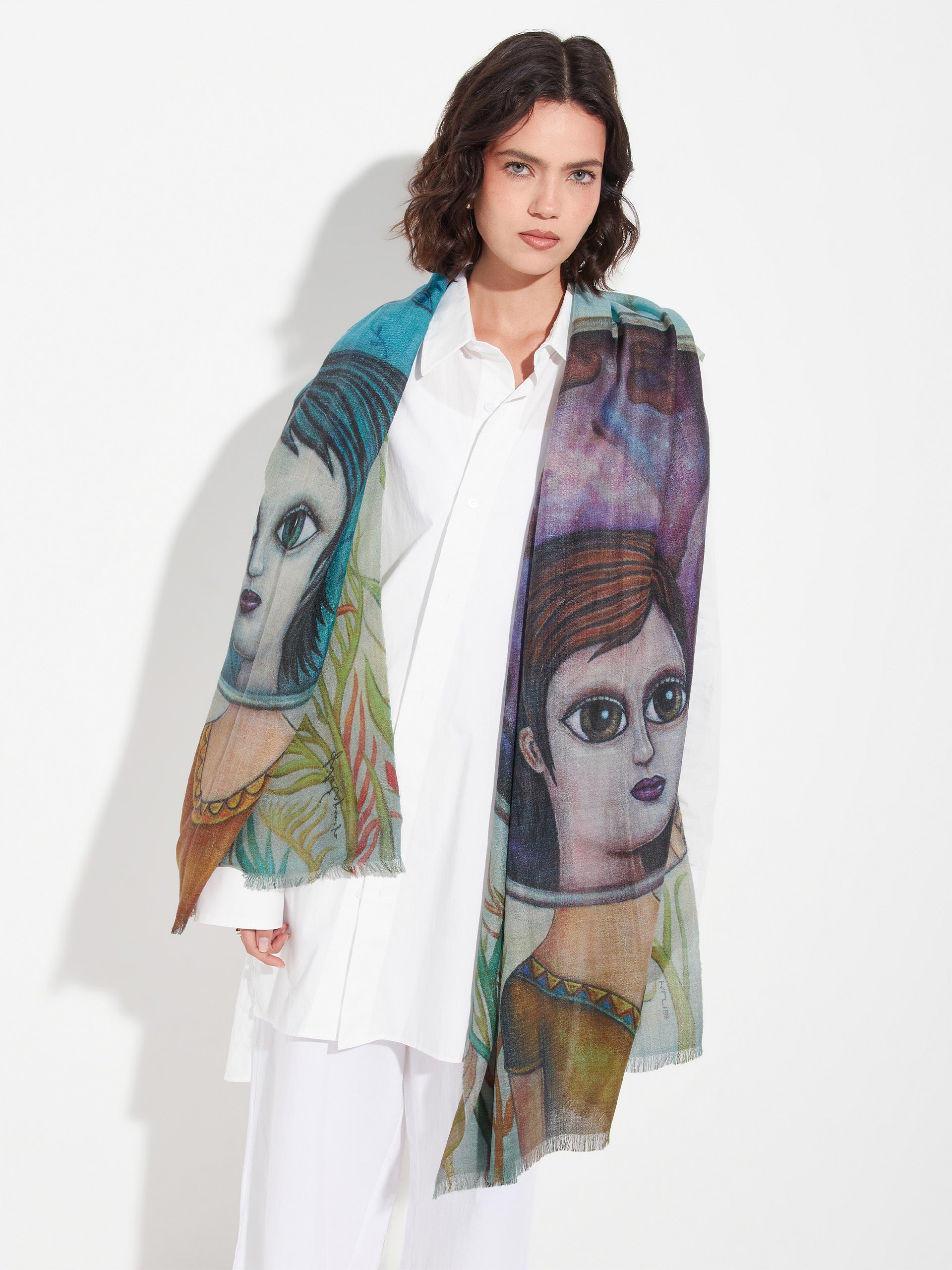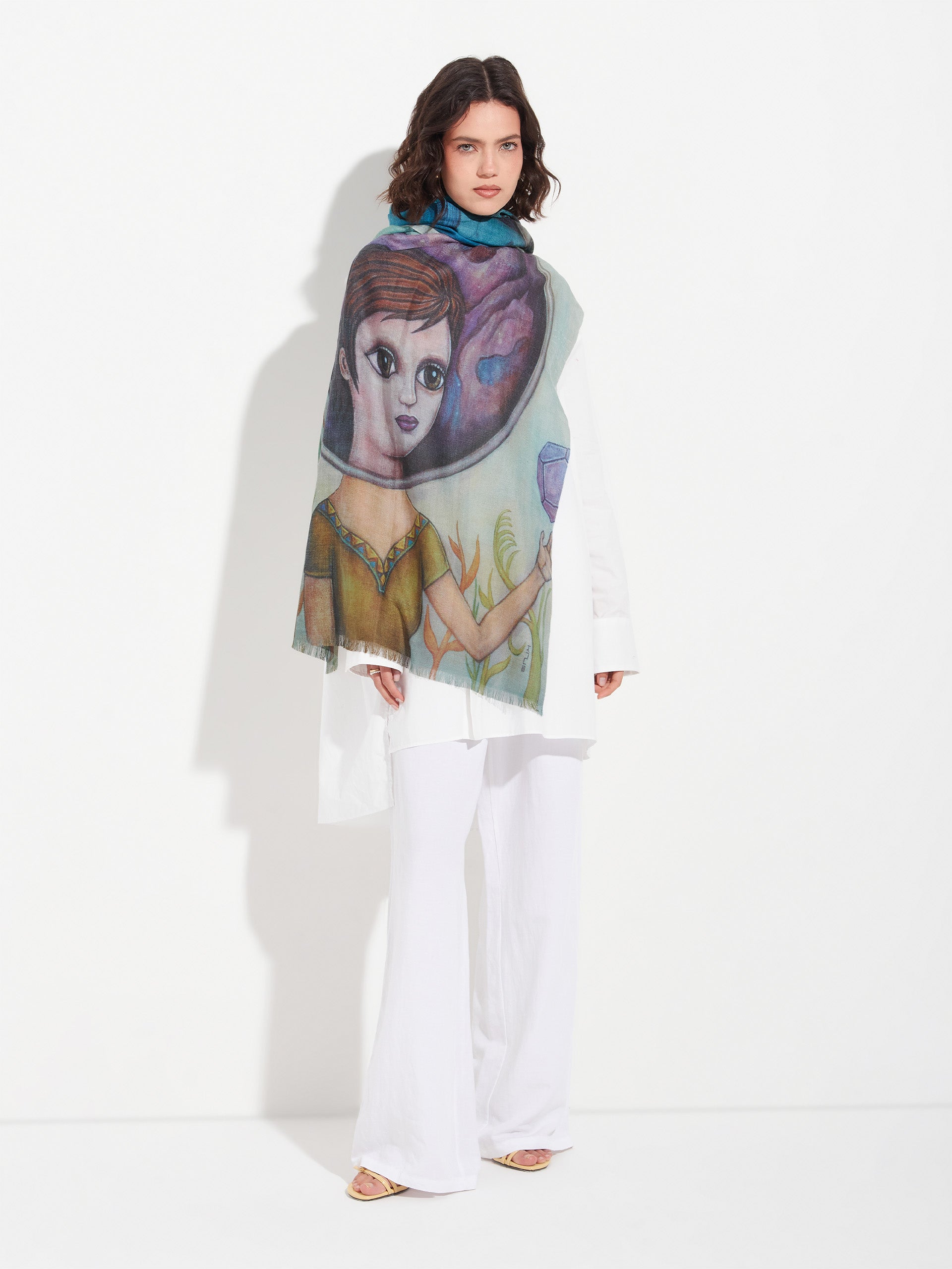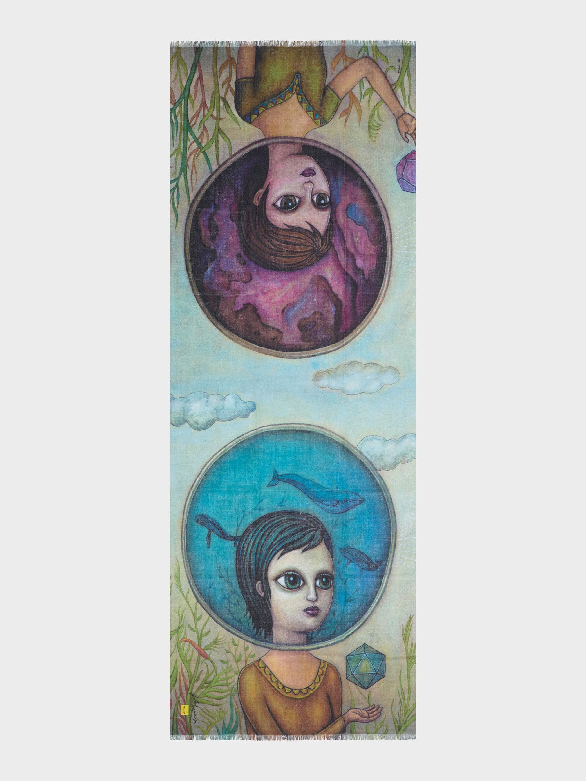Dos mundos interiores de un mismo ser se revelan en equilibrio mostrando su naturaleza dual. Océano y cosmos, agua y éter, representan el elemento primigenio del cual emerge la vida en todas sus manifestaciones. Esta exquisita estola ha sido inspiración de nuestro artista Fito Espinoza, elaborada en baby alpaca y seda. | Material predominante: Baby Alpaca
