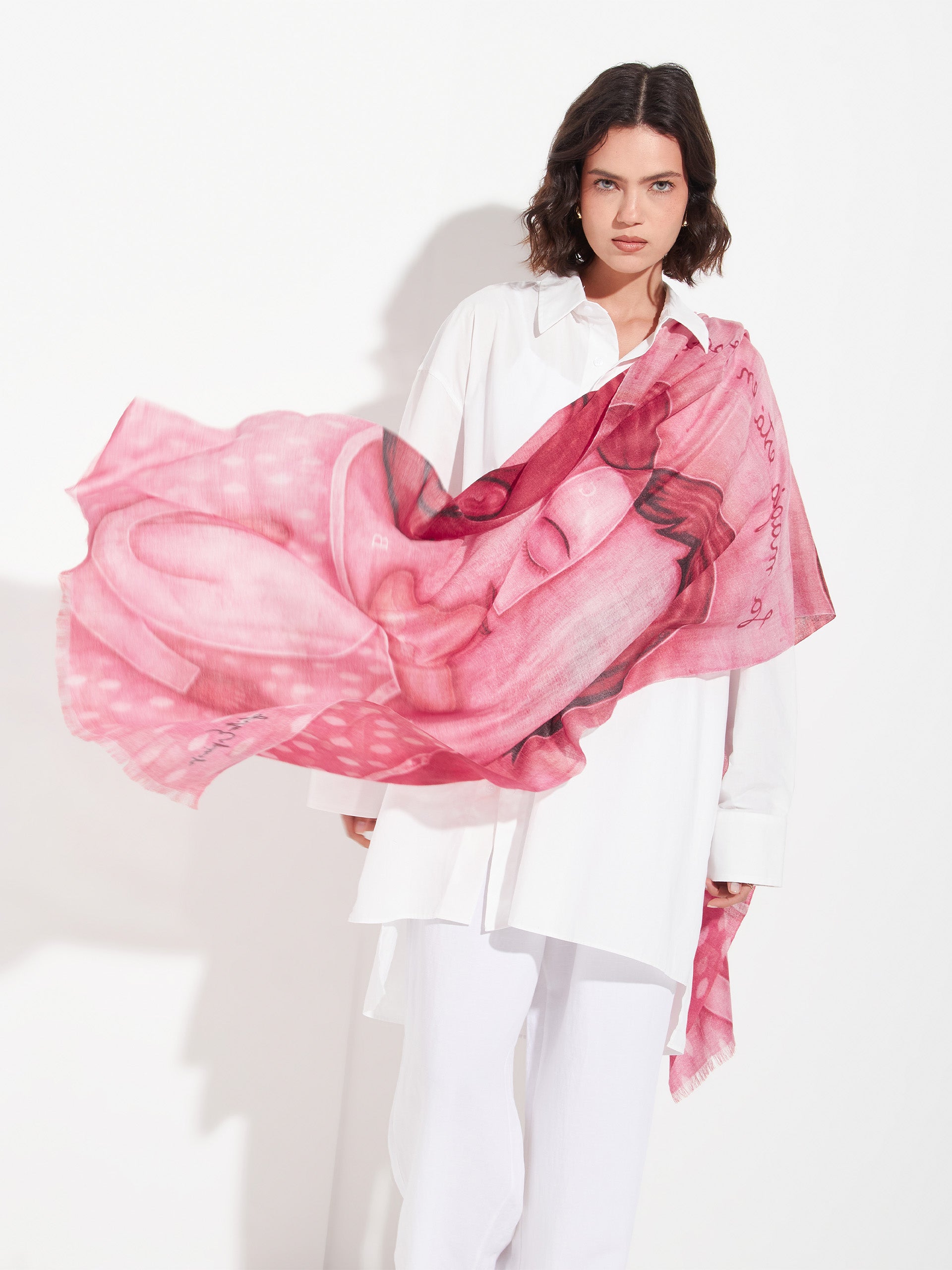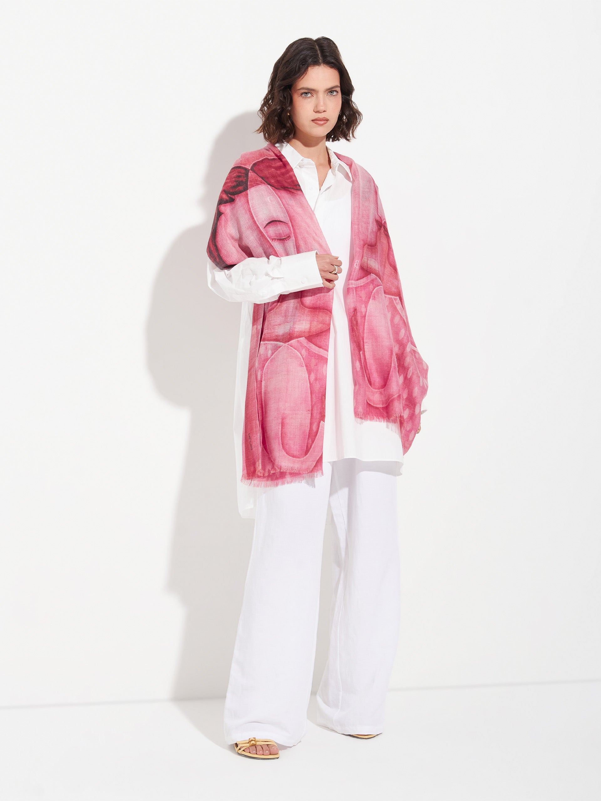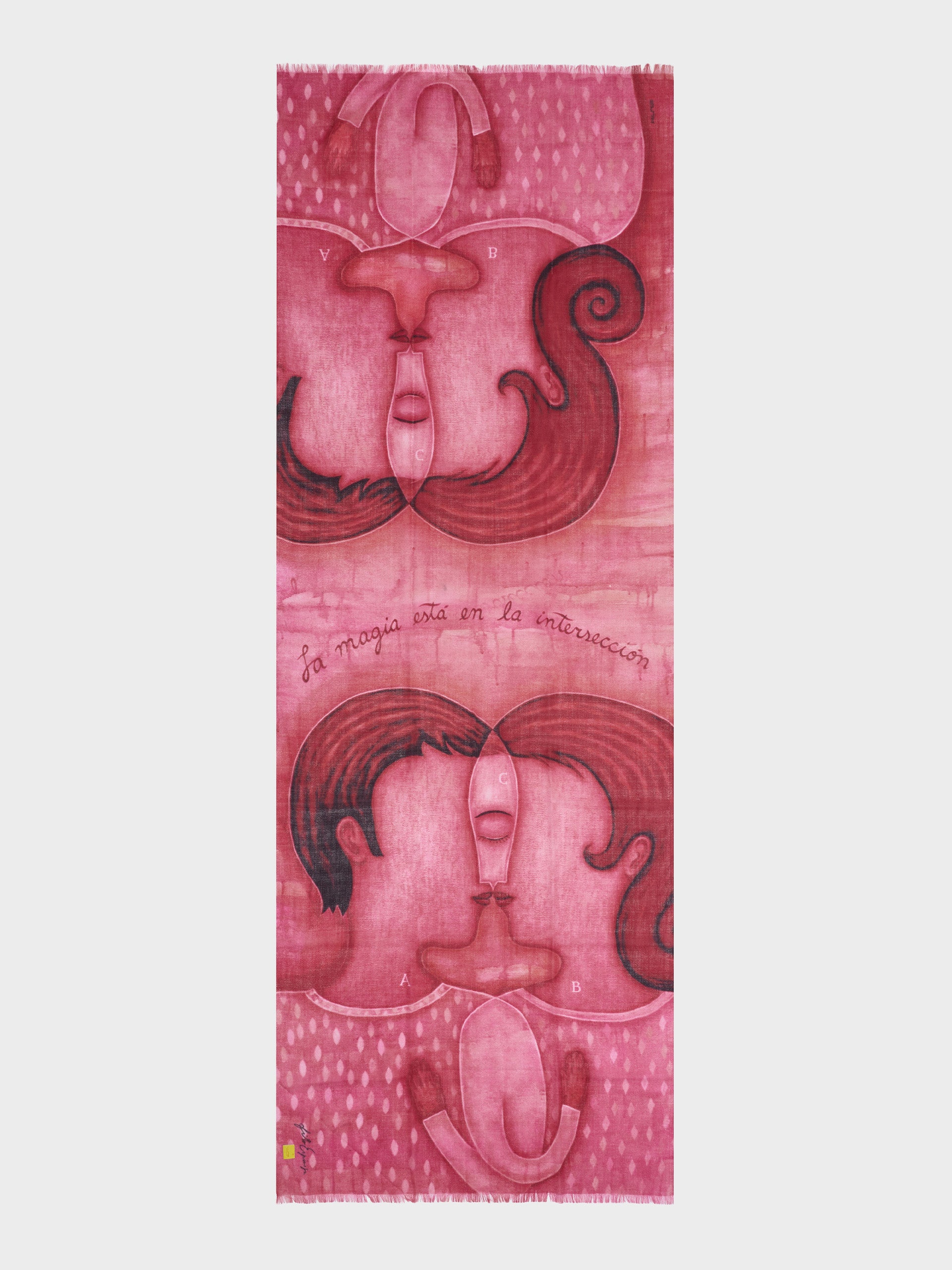 La magia surge en la intersección, el espacio compartido. Es una mirada intermedia que se da en el vínculo con el otro y permite la creatividad en conjunto para el nacimiento de algo nuevo. Esta fina estola ha sido inspiración de nuestro artista Fito Espinoza, elaborada en baby alpaca y seda. | Material predominante: Baby Alpaca