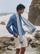 Estola Zabila en tonalidad celeste, elaborada en baby alpaca, seda y lino. Presenta líneas horizontales en panamá sobre fondo tafetán y acabado desflecado. Su textura ligera y su diseño rayado aportan un toque de distinción. | Material predominante: Lino