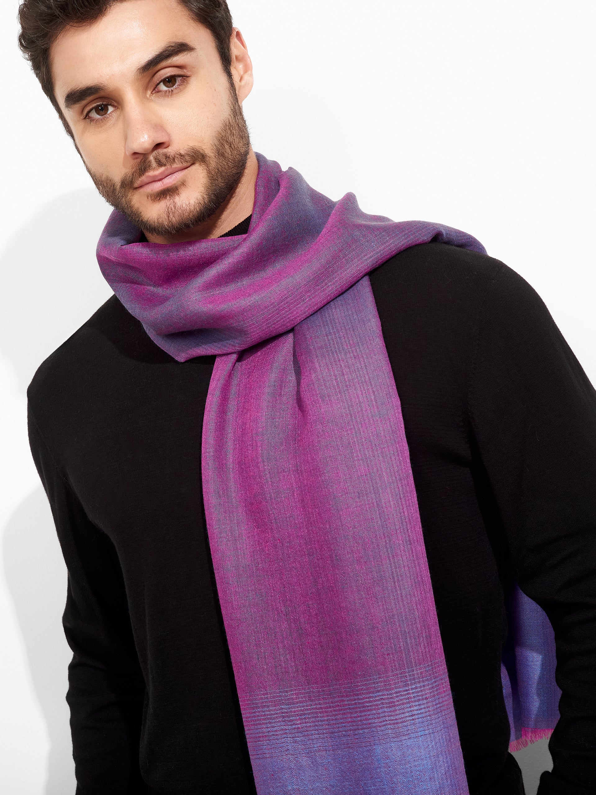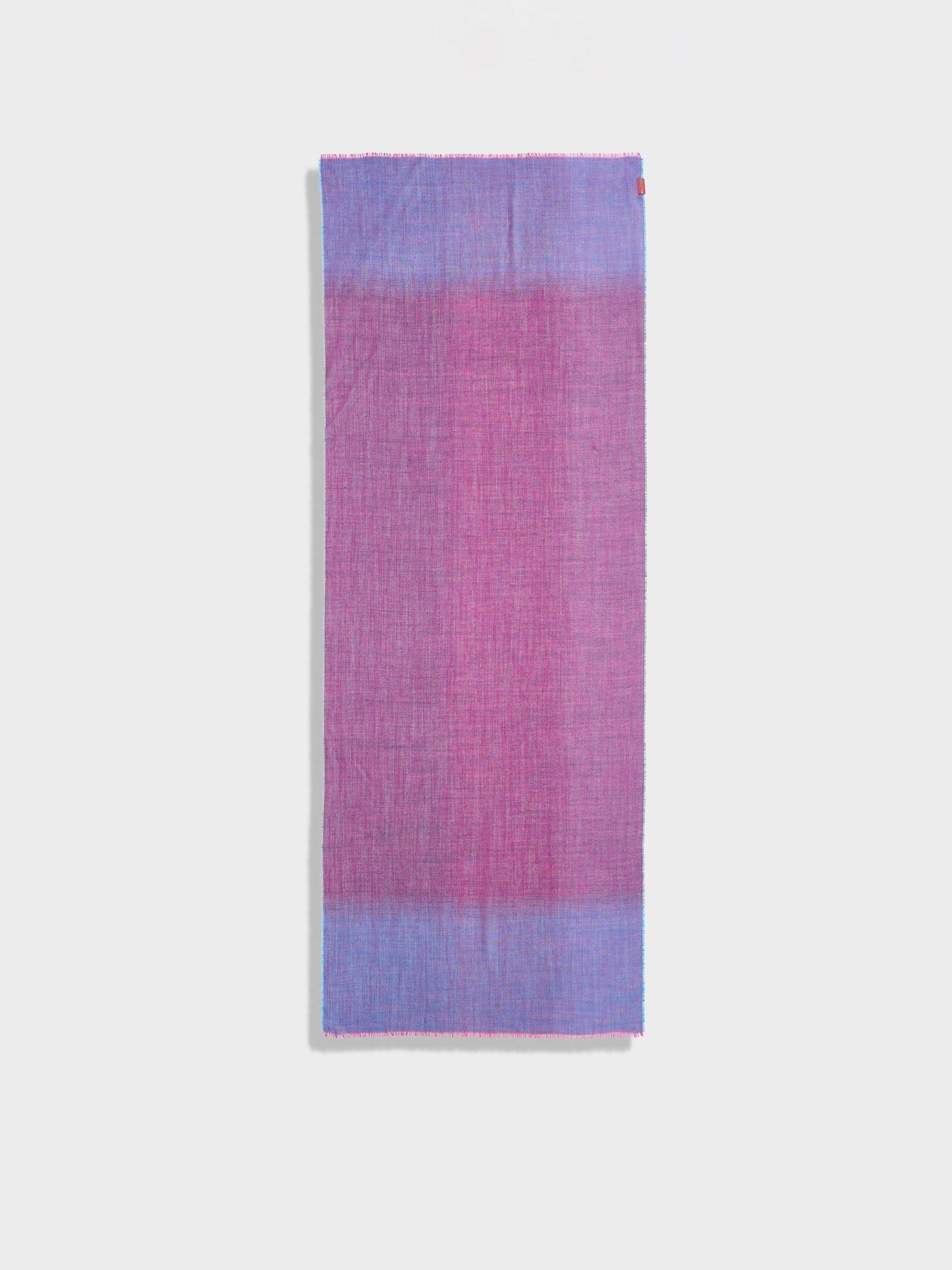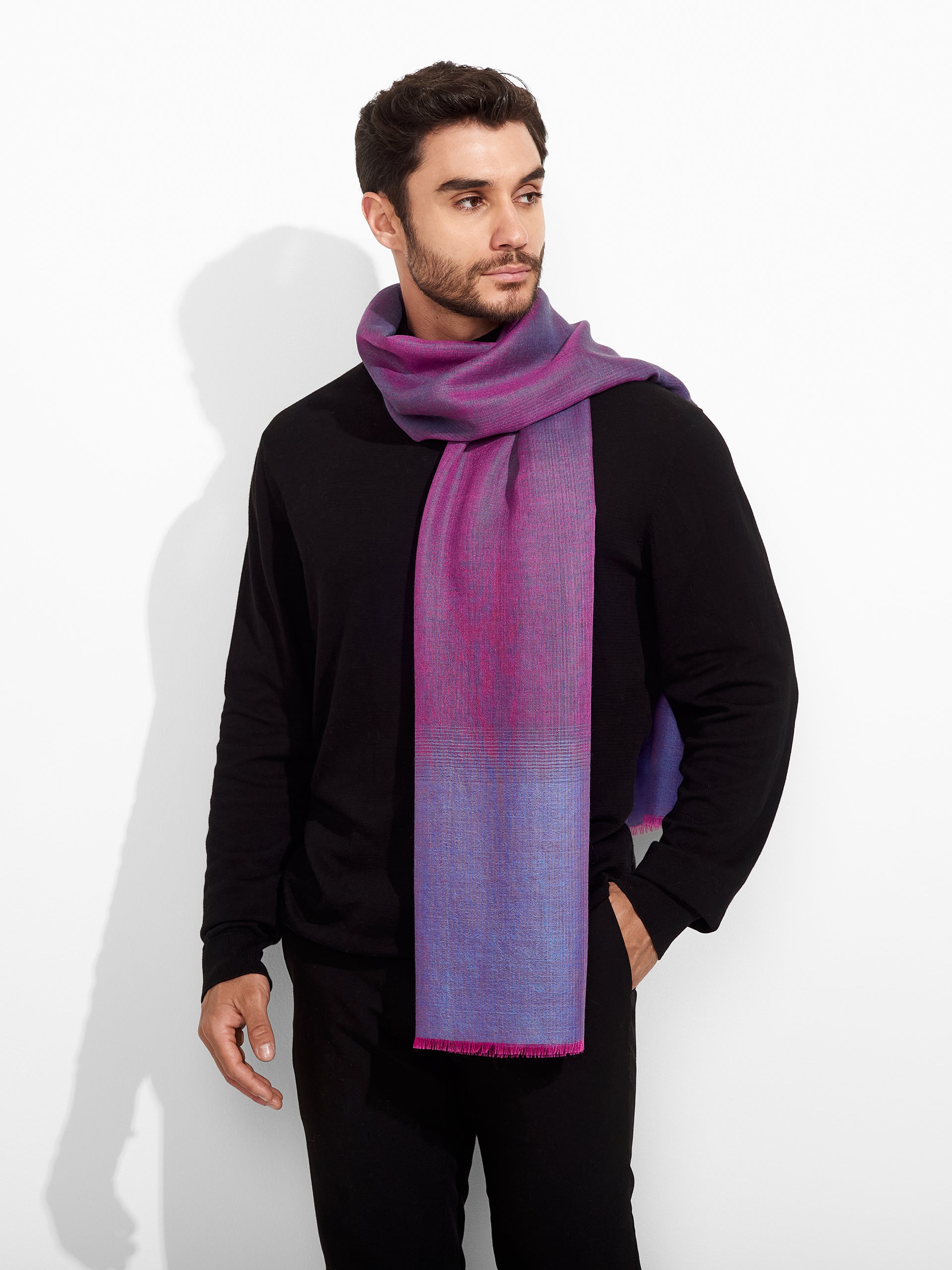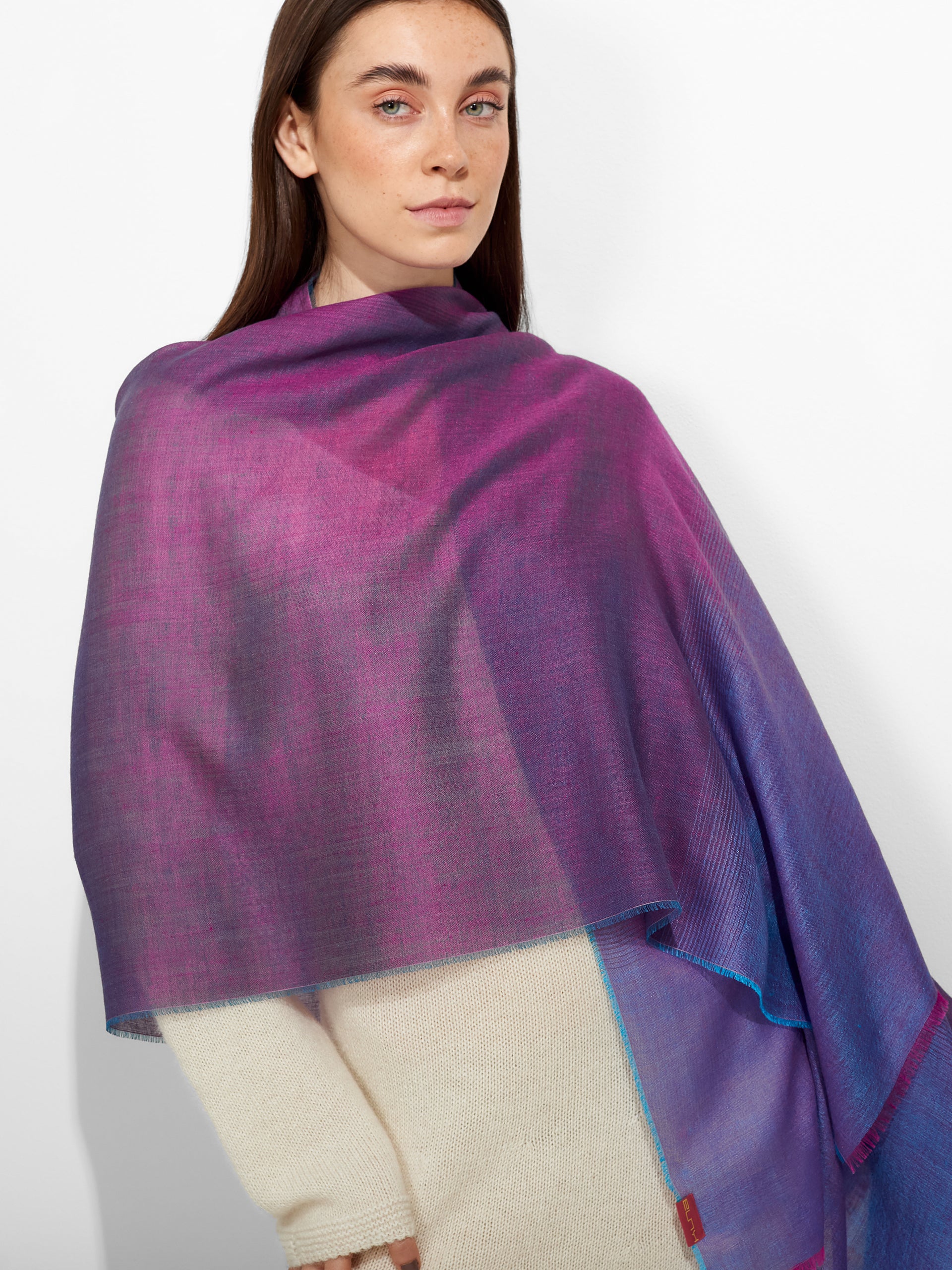 Estola Zulma en tonalidad morado, con un diseño de colores degradados, presenta bordes con flecos cortos. Confeccionada en baby alpaca y seda, combina ligereza y suavidad . | Material predominante: Baby Alpaca