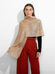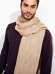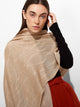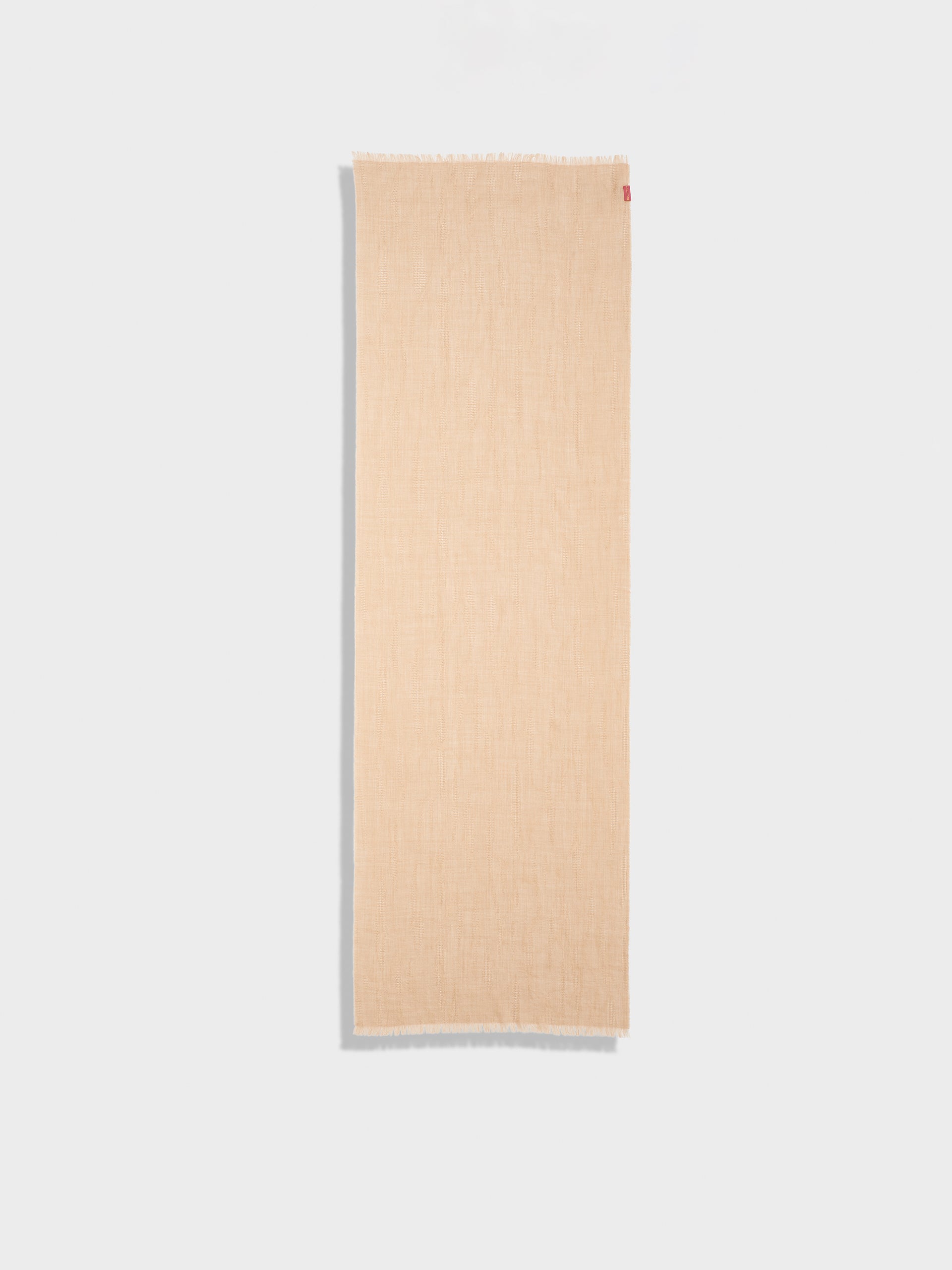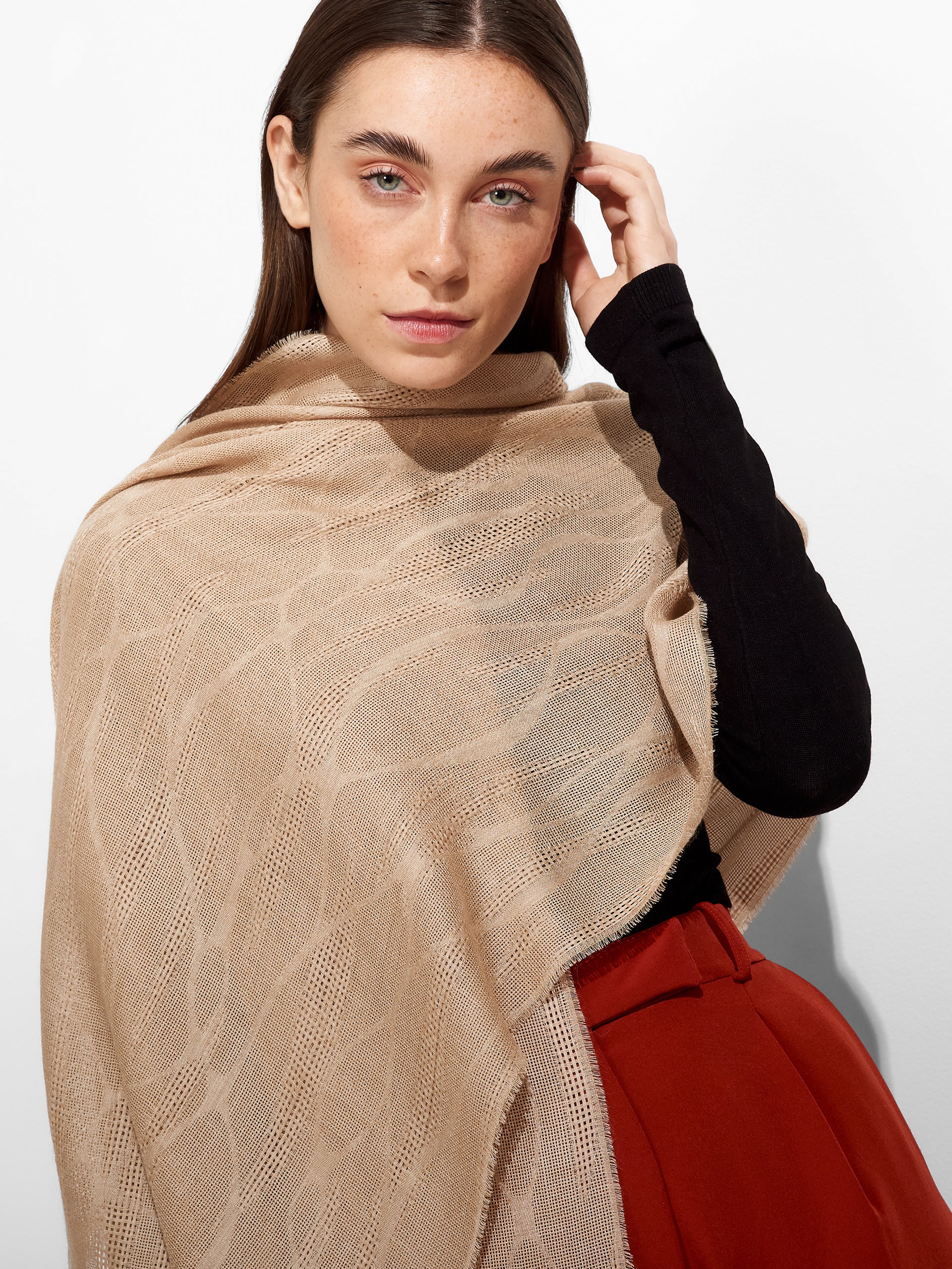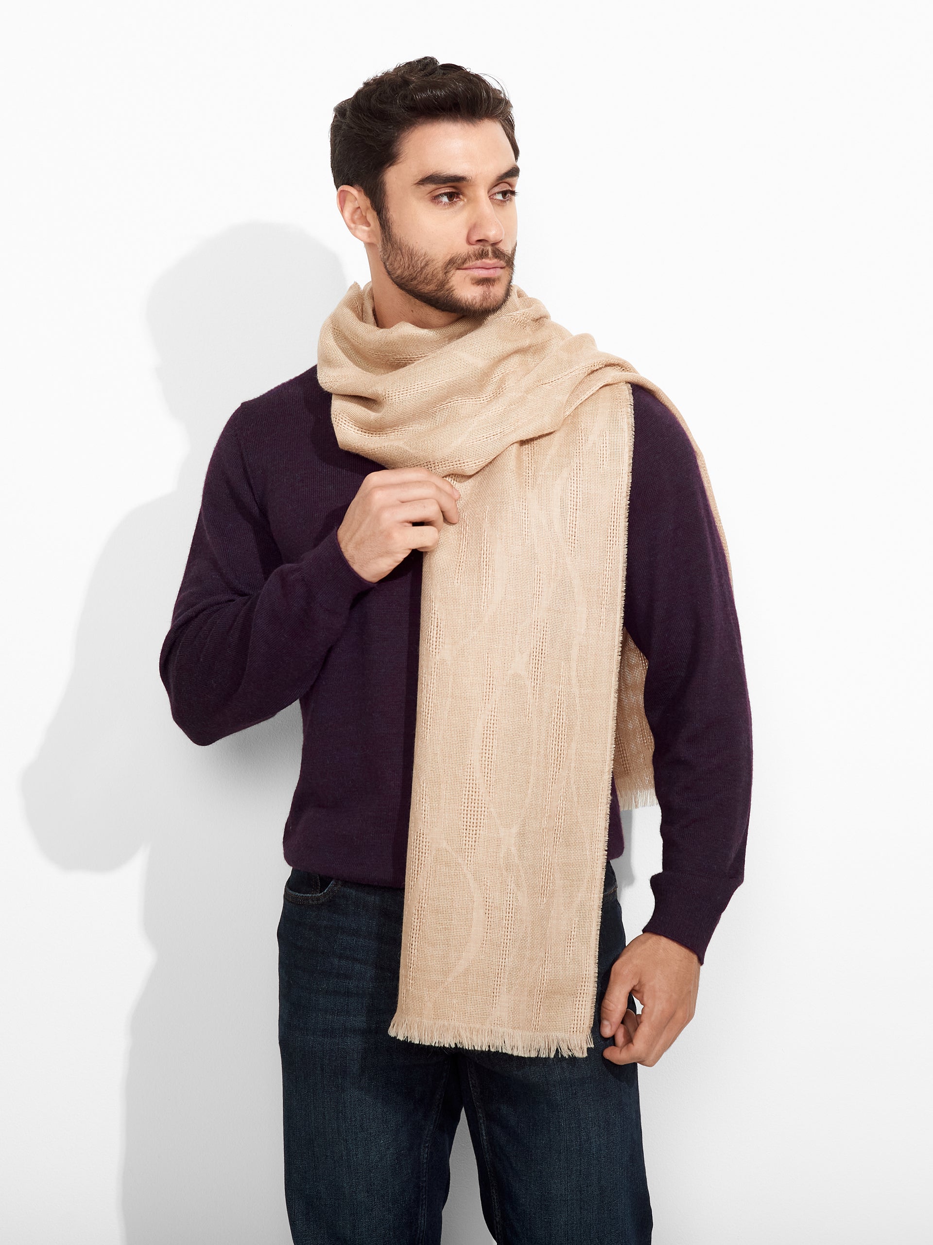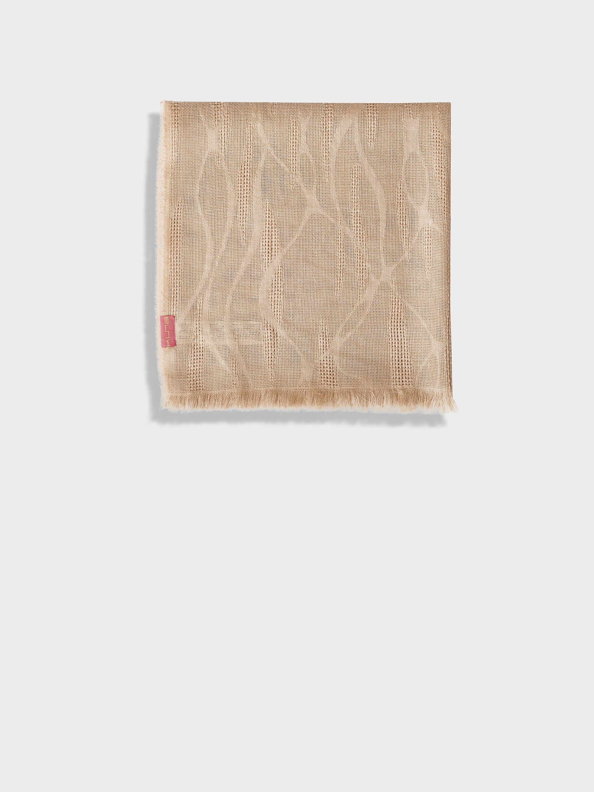 Estola Zuniga en tonalidad beige, de color entero y diseño de líneas onduladas que recorren toda la pieza, presenta bordes con flecos finos. Confeccionada en baby alpaca y seda | Material predominante: Baby Alpaca