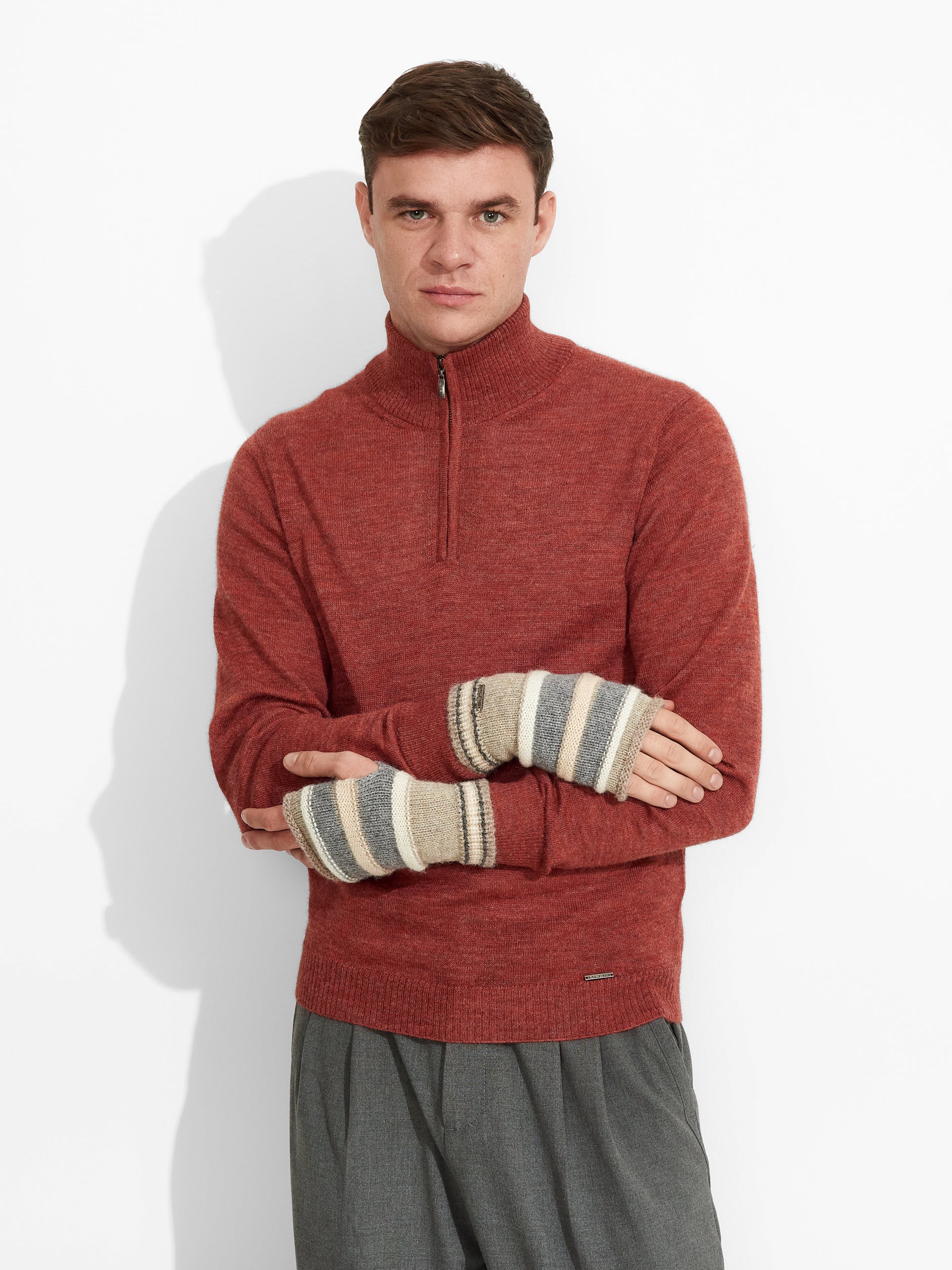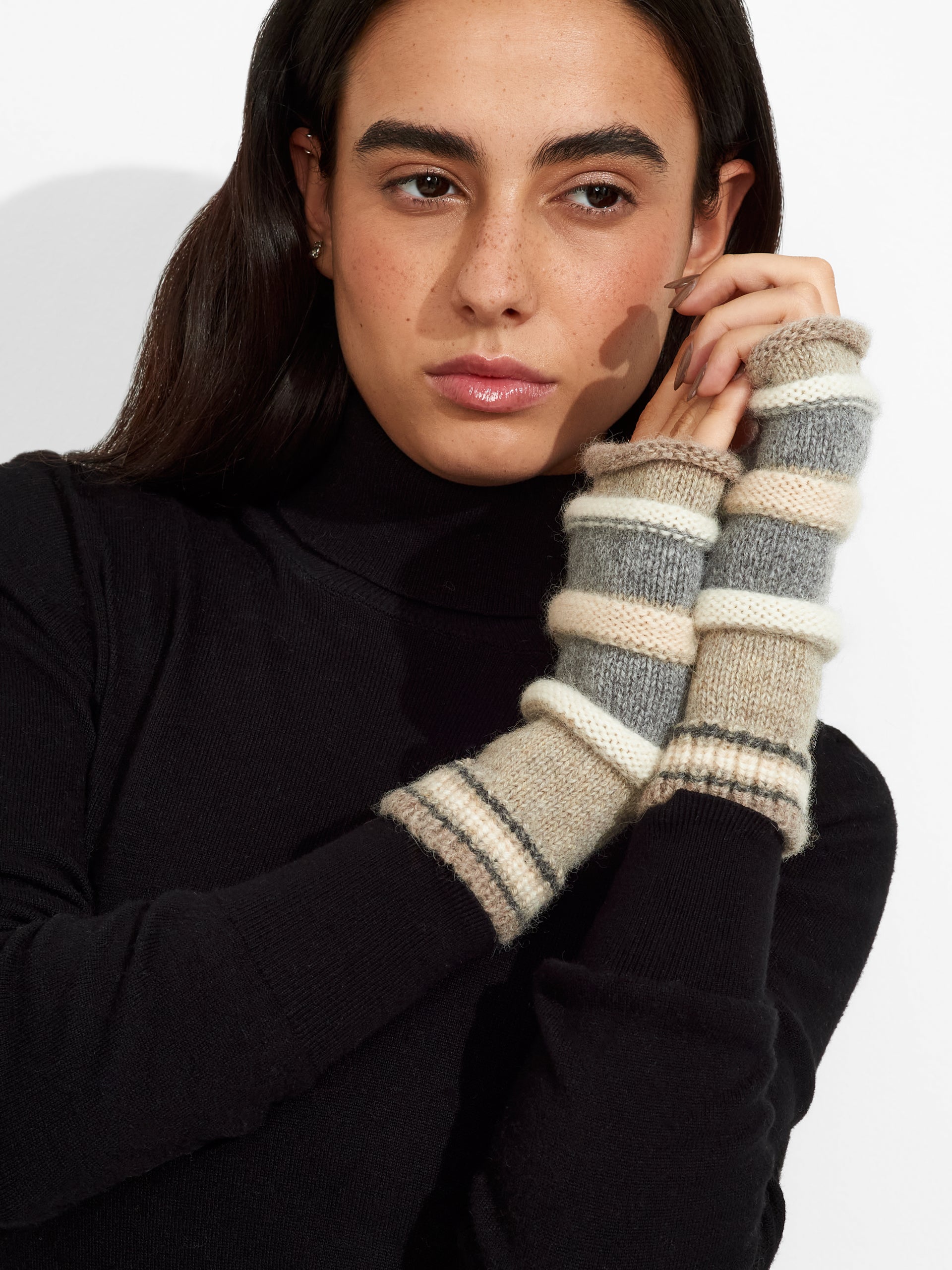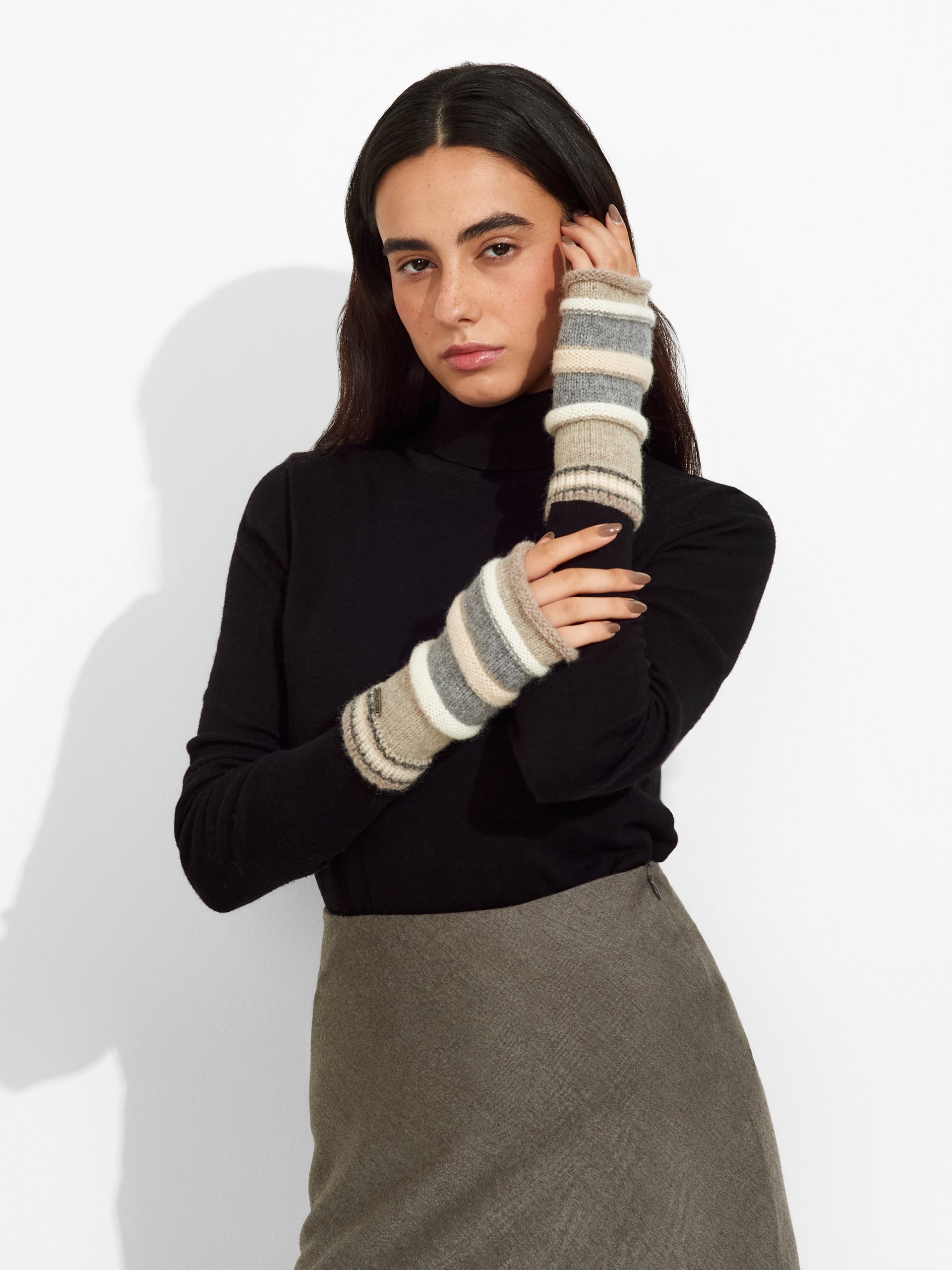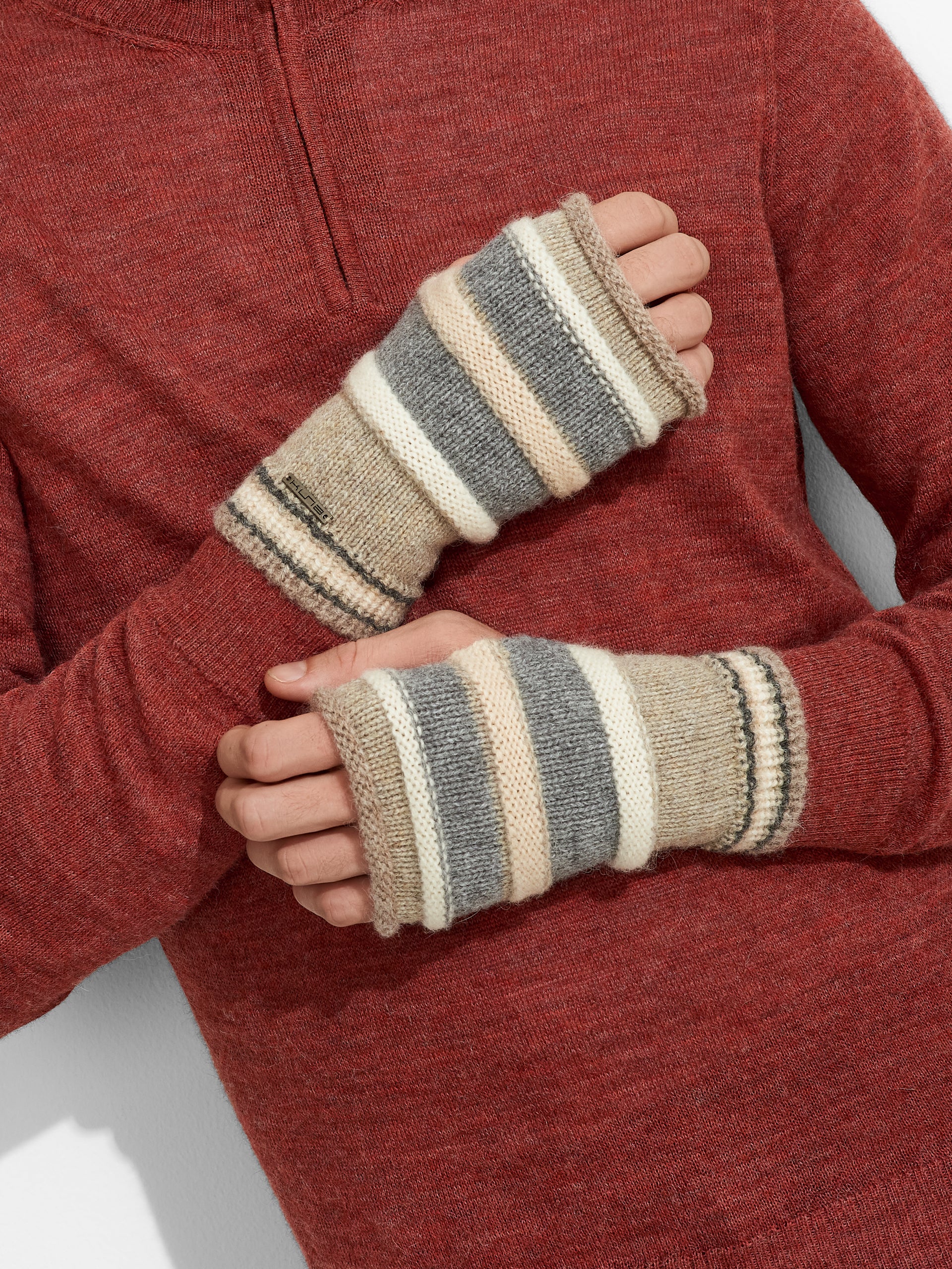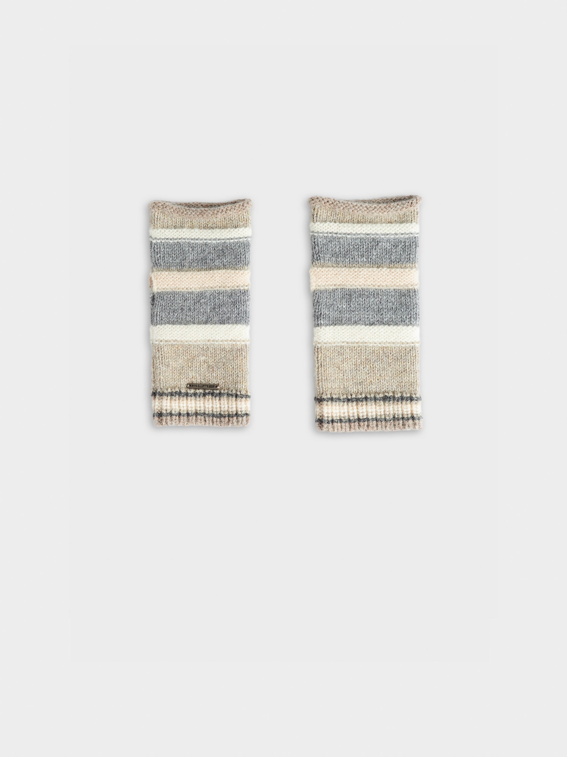 Guantes Zanni en tonalidad beige, con diseño de rayas horizontales que aportan un estilo distintivo. Presentan un ajuste ceñido. Confeccionados en baby alpaca, ofrecen suavidad, calidez y confort. | Material predominante: Baby Alpaca