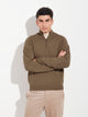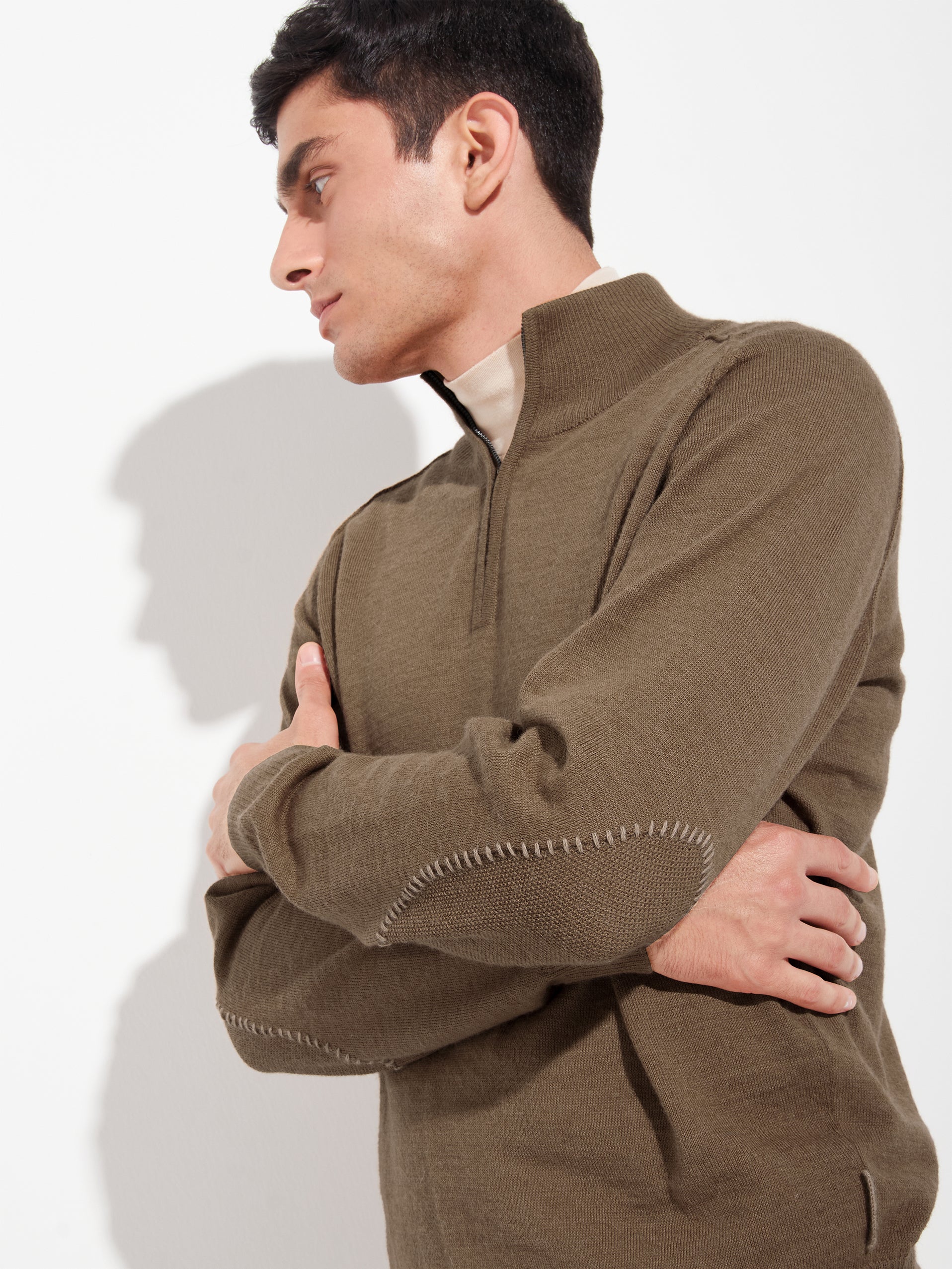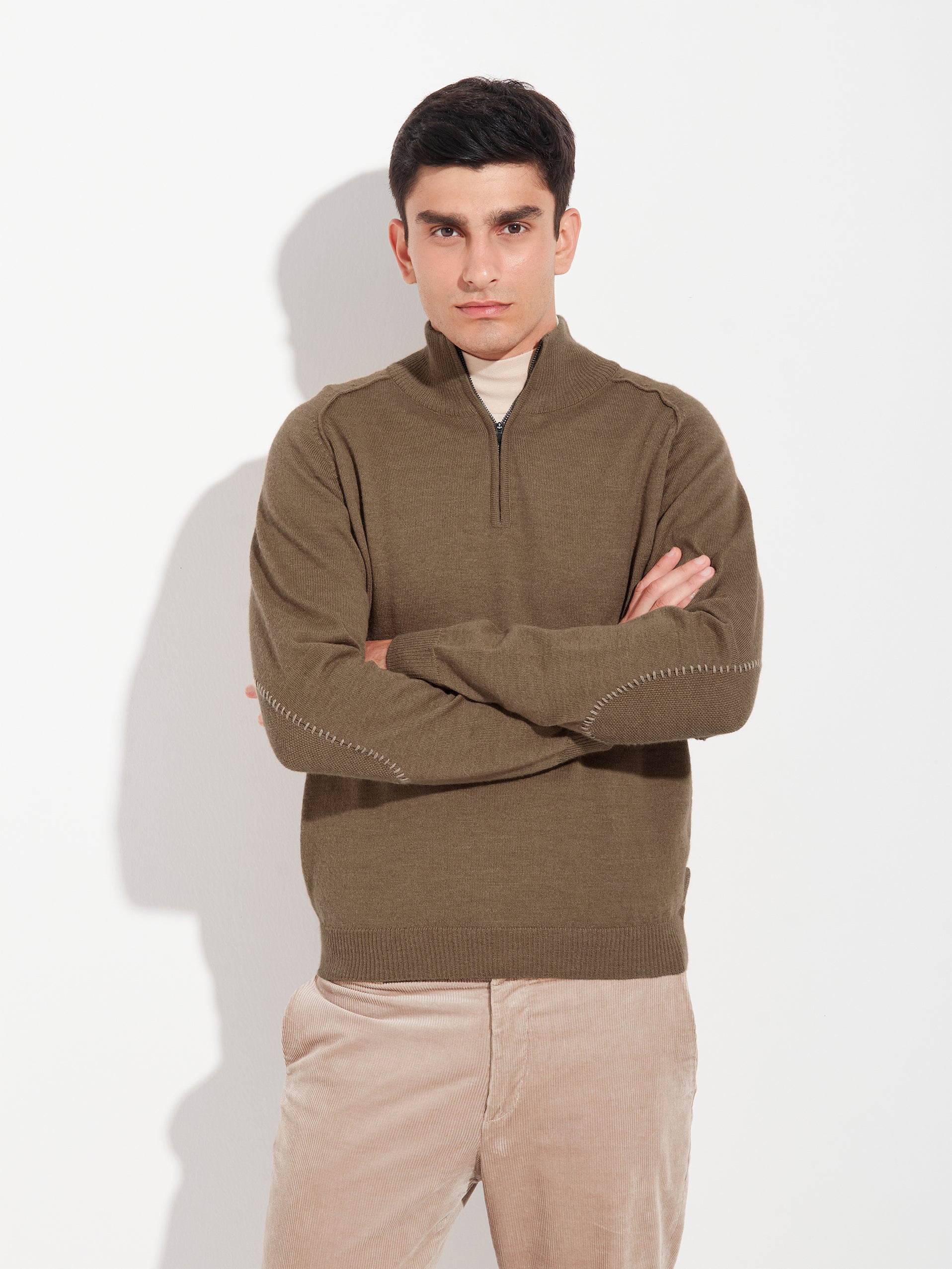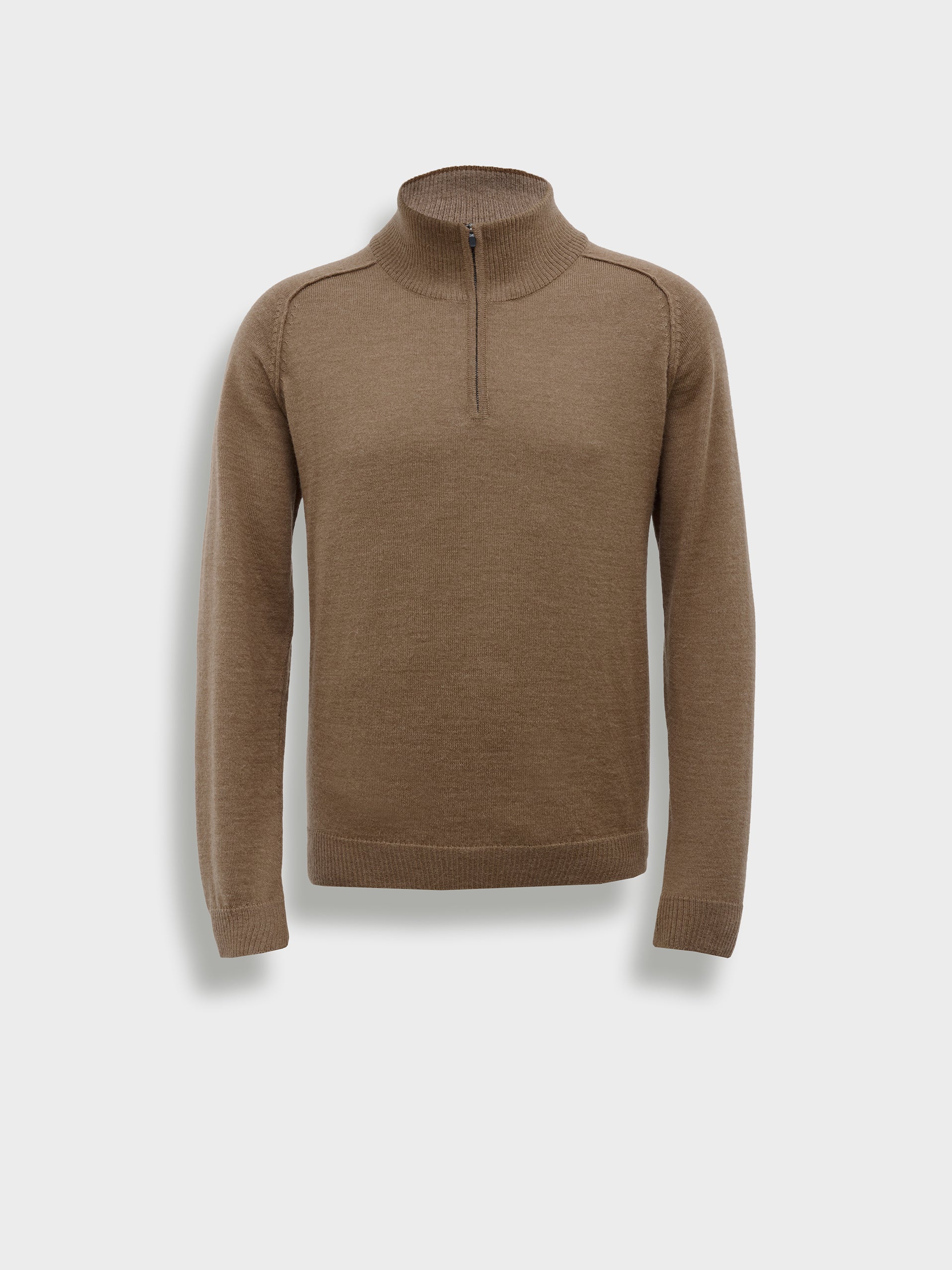 Suéter Bugatti en tonalidad camel, con cuello alto y cierre frontal. Confeccionado en 100% baby alpaca RAS y tejido en punto jersey. Presenta contraste de color en el interior del cuello y coderas integradas al tejido, que aportan un detalle funcional y distintivo. | Material predominante: Baby Alpaca