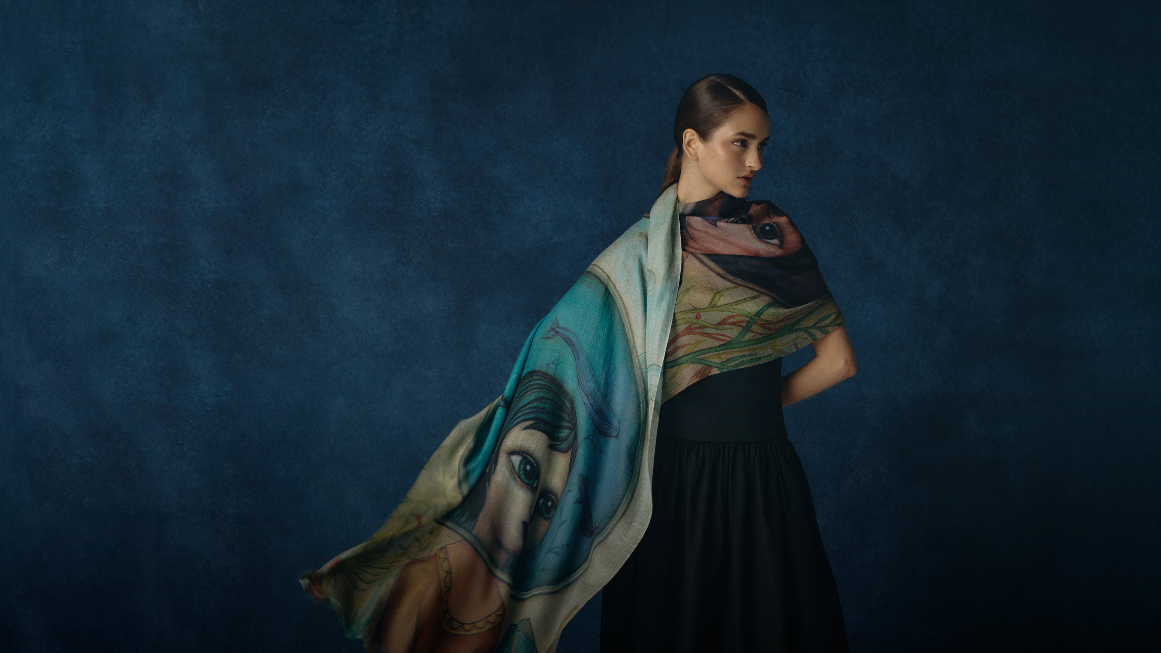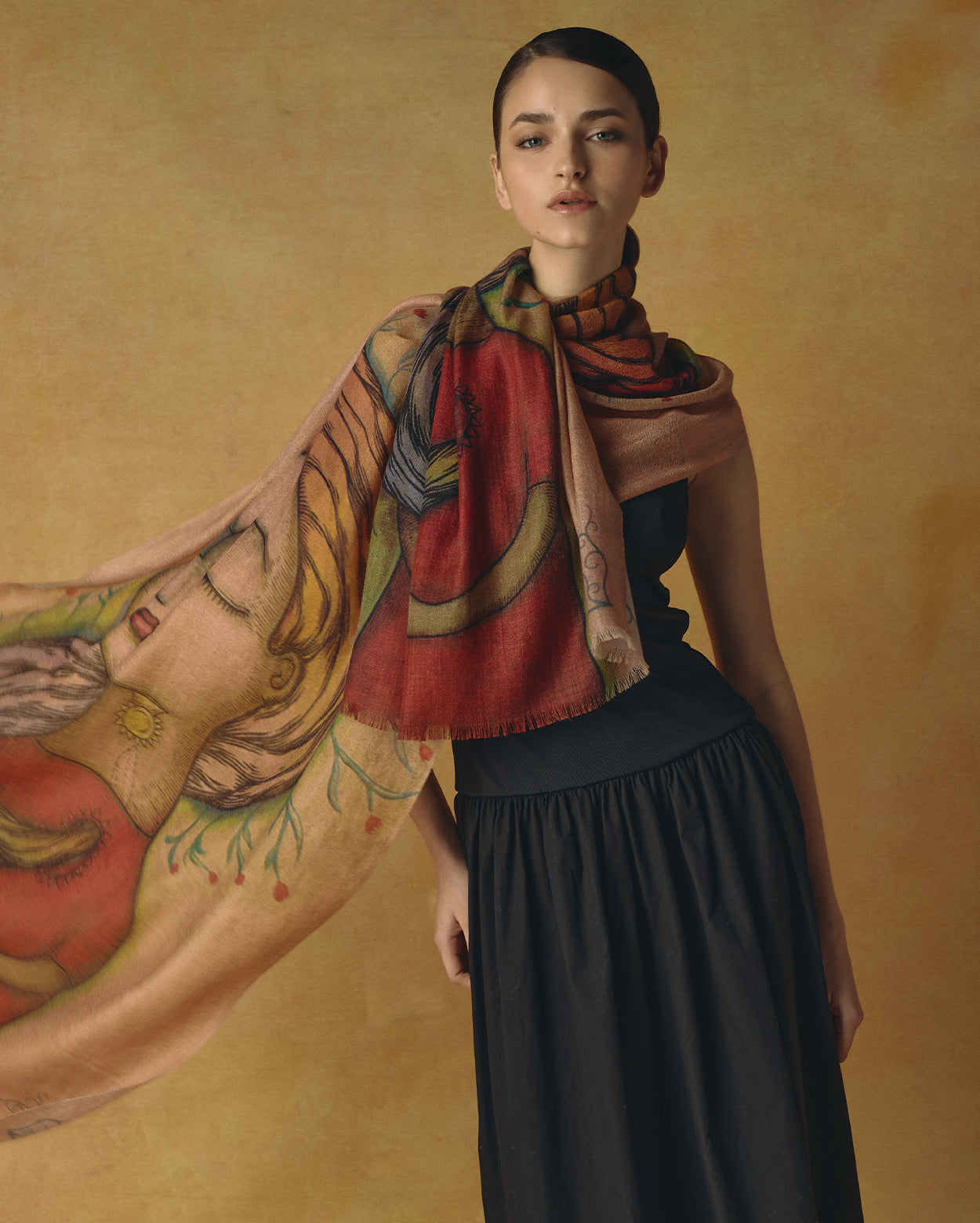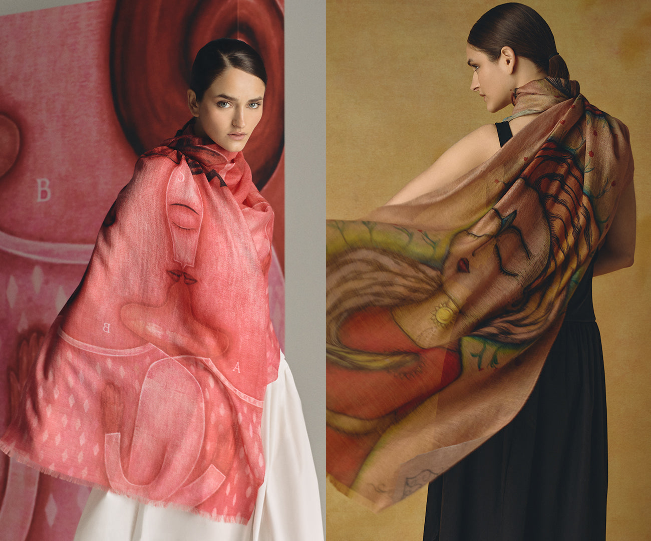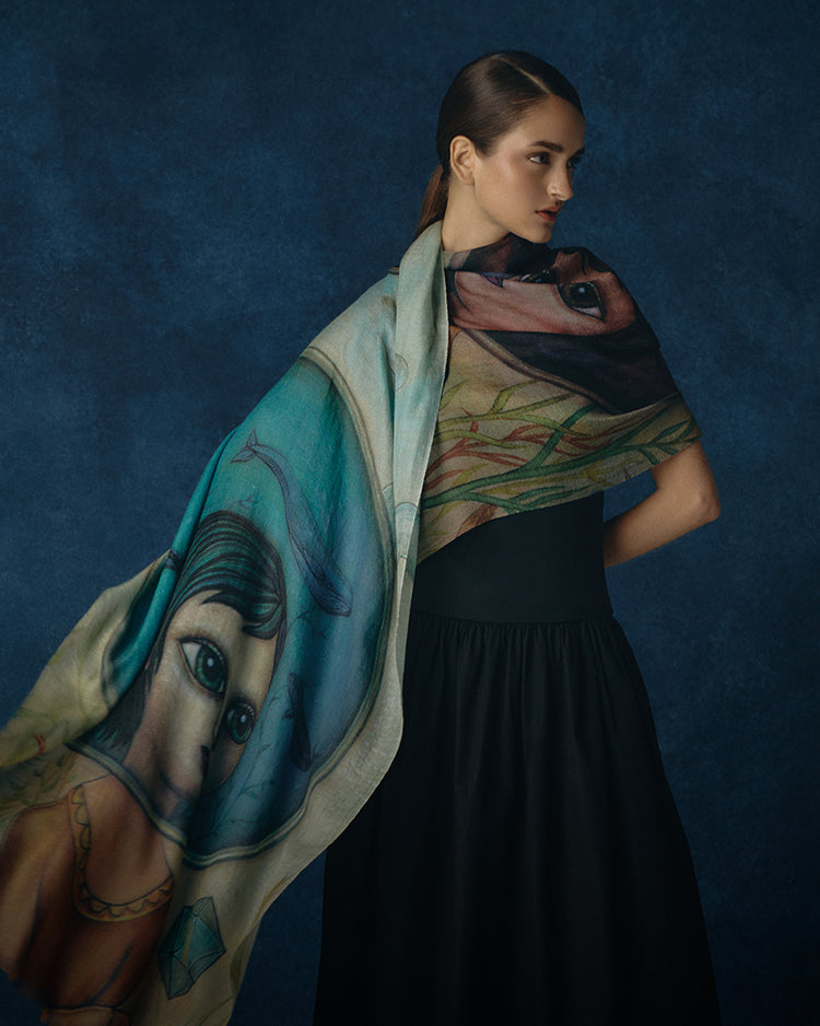 Pinturas originales de Fito Espinosa son reinterpretadas sobre estolas de baby alpaca y seda, transformando el lienzo en una experiencia que se lleva puesta. En ellas, la tradición textil andina se convierte en lienzo para un lenguaje visual que celebra lo invisible: la energía que nos une, la belleza que nos habita.