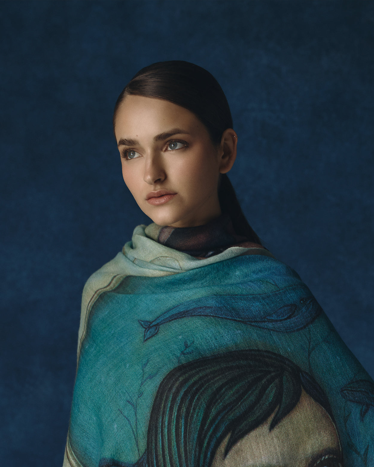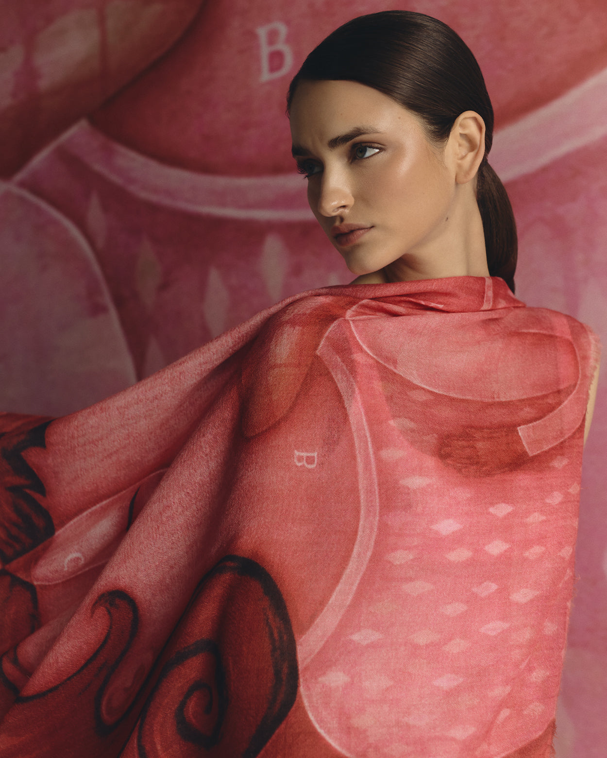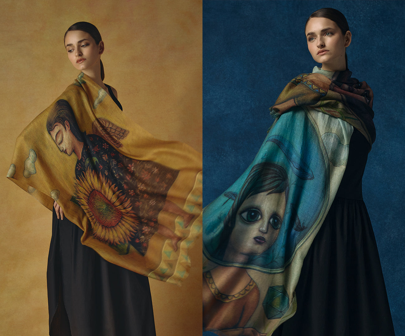 Pinturas originales de Fito Espinosa son reinterpretadas sobre estolas de baby alpaca y seda, transformando el lienzo en una experiencia que se lleva puesta. En ellas, la tradición textil andina se convierte en lienzo para un lenguaje visual que celebra lo invisible: la energía que nos une, la belleza que nos habita.
