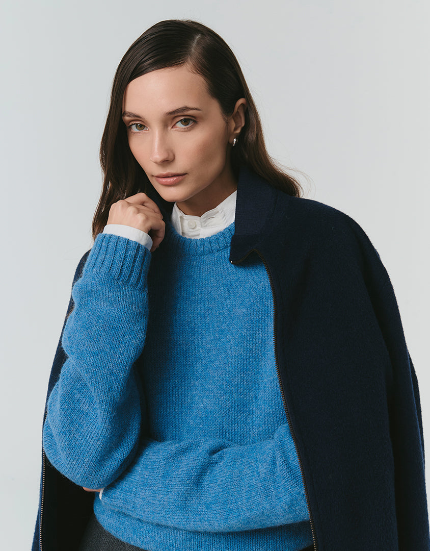 Suéter Zaeta en tonalidad azul, confeccionado en una mezcla de baby alpaca y seda. Es...