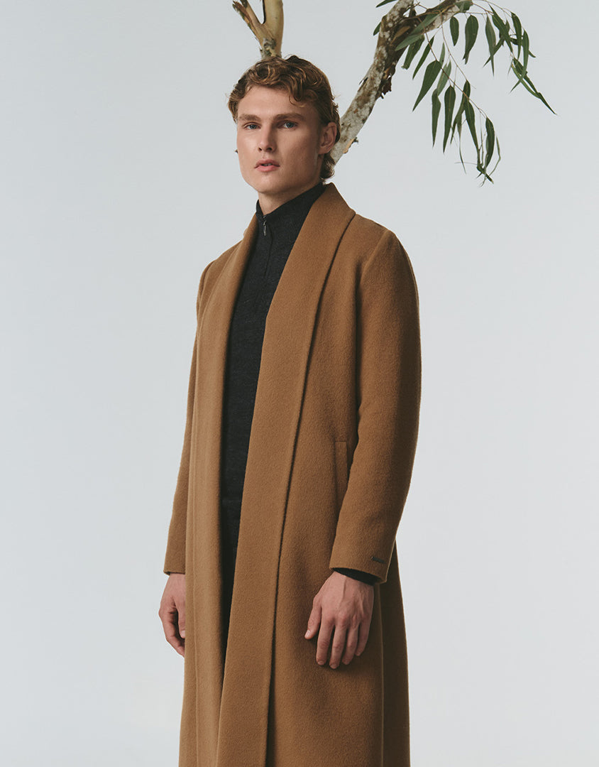 Abrigo Zen en tonalidad beige, de largo clásico y corte princesa que estiliza la silueta....