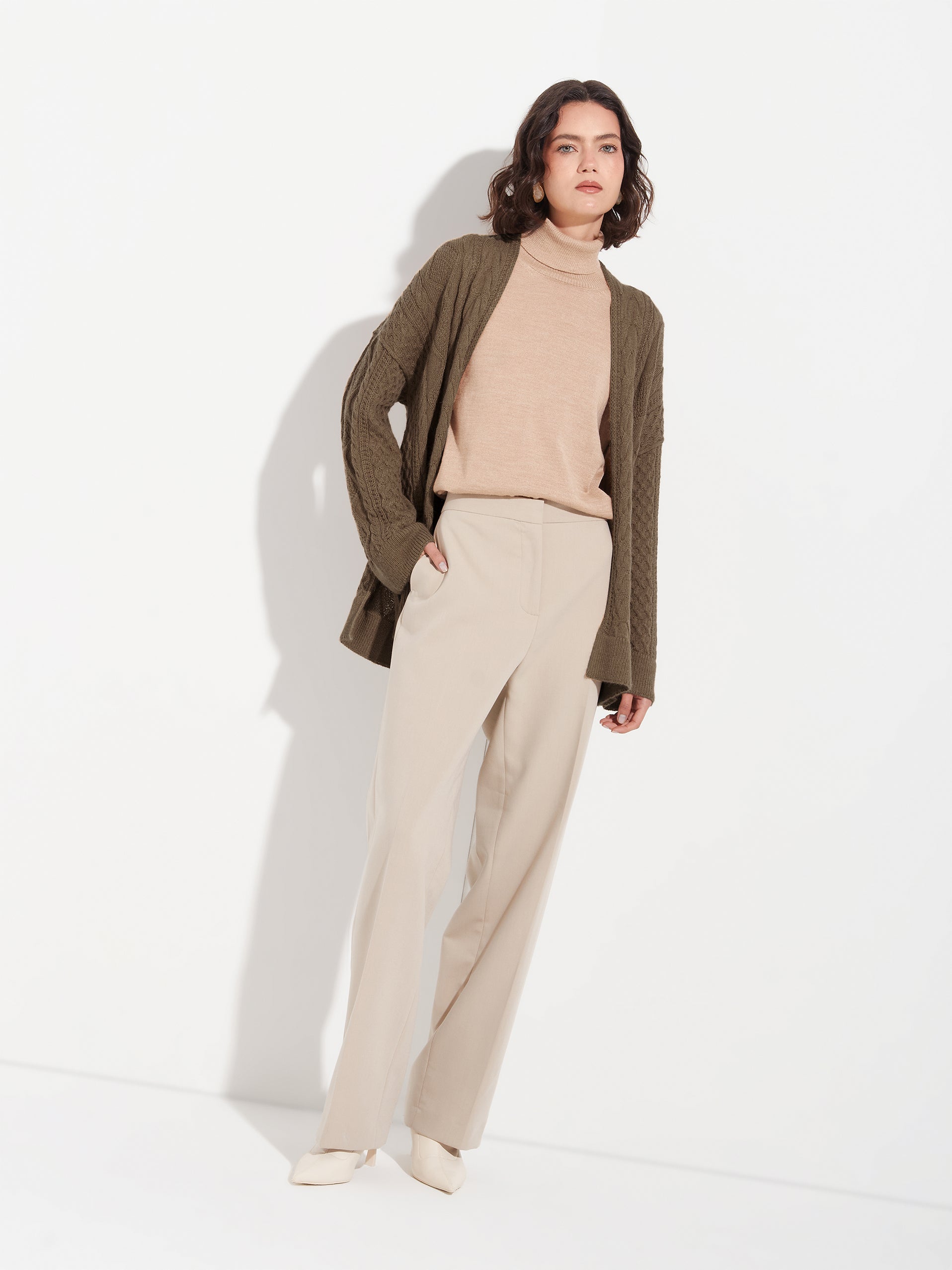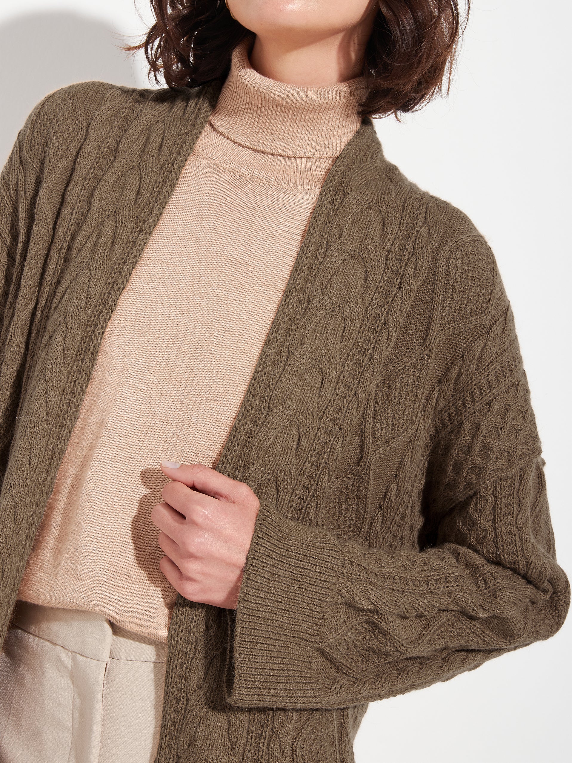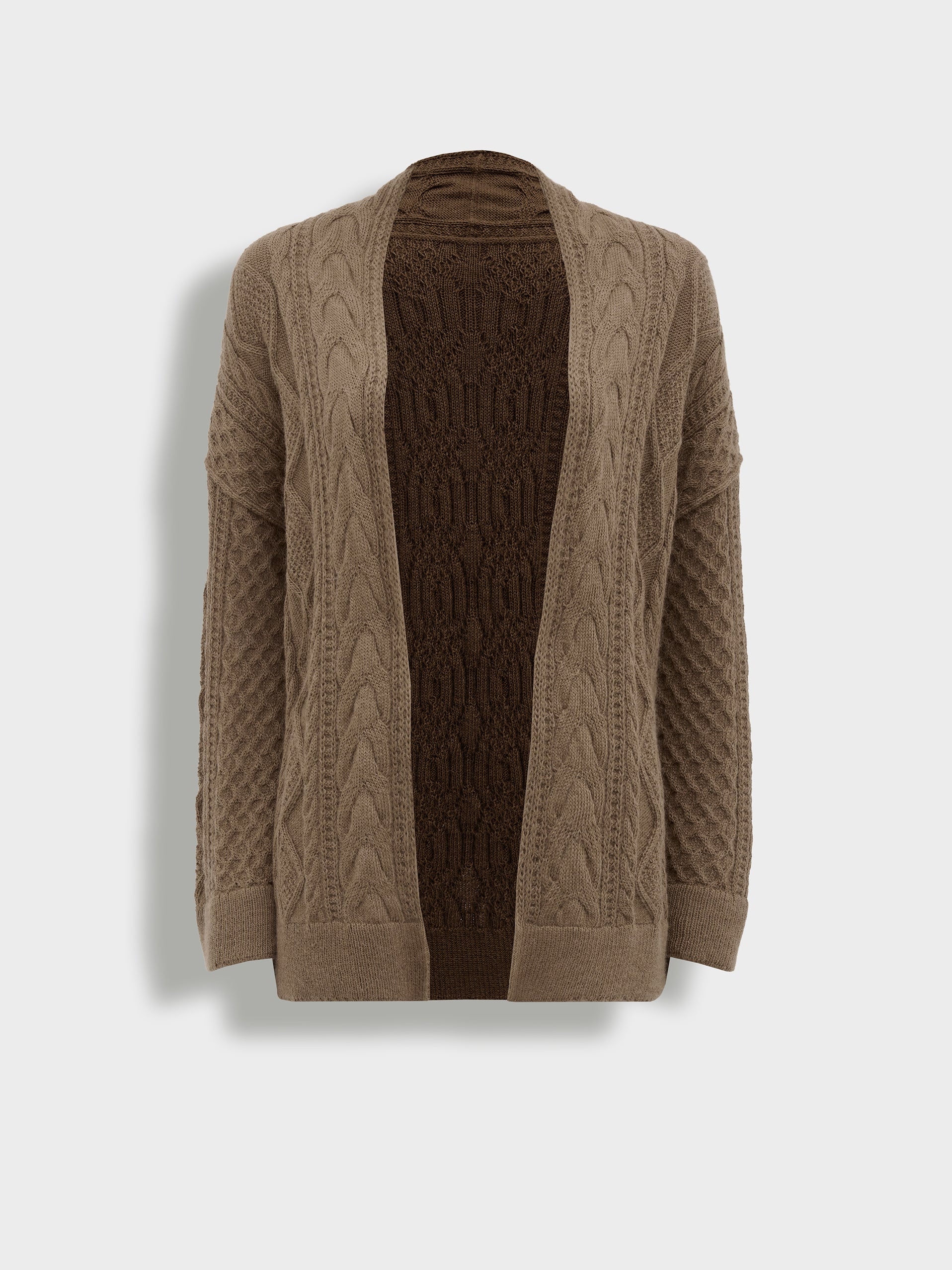 Cardigan Bertha en tonalidad camel, con cuello shawl y mix de trenzas que aportan textura y estilo. Elaborado en 100% baby alpaca RAS, presenta aberturas laterales para mayor comodidad y movimiento. | Material predominante: Baby Alpaca