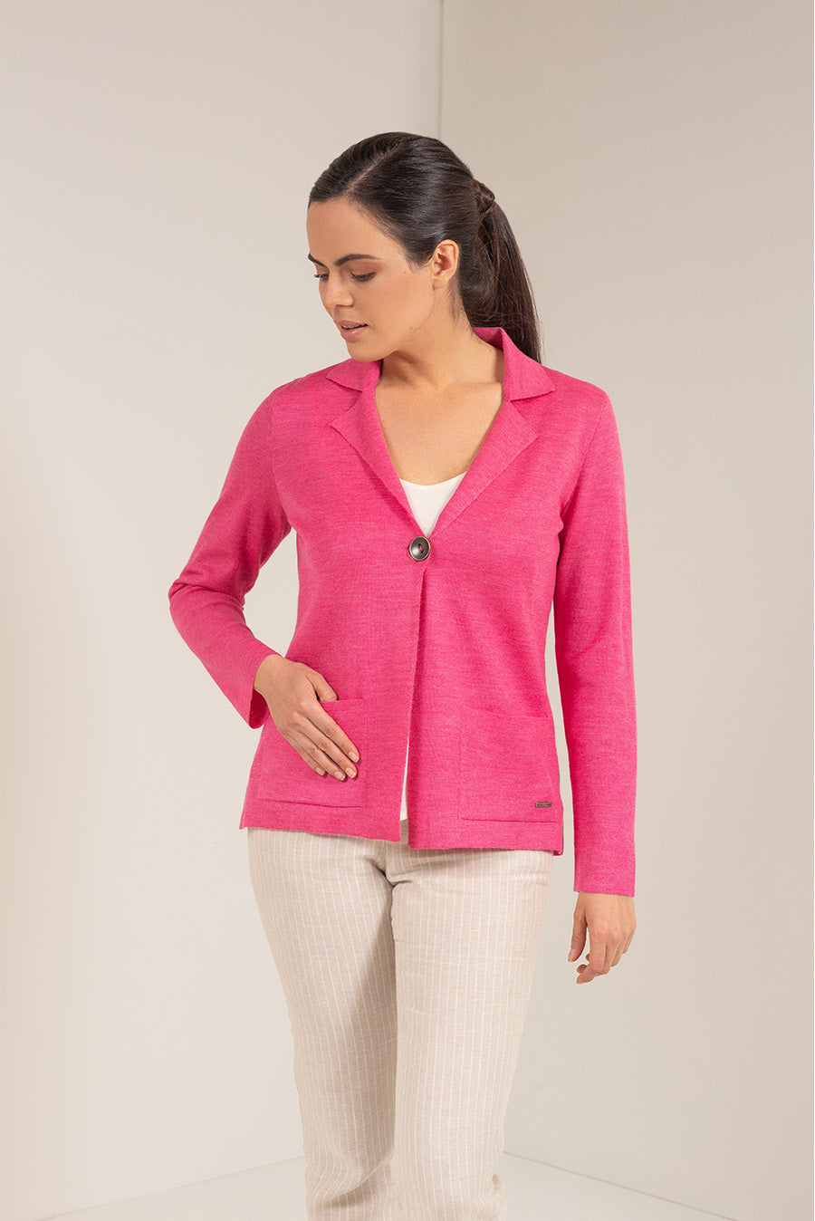 Una silueta que no pasa de moda esta vez en tejido punto de baby alpaca y seda. Complementa tus looks preferidos con este elegante saco con de solapa, bolsillos delanteros y botón central. | Material predominante: Baby Alpaca