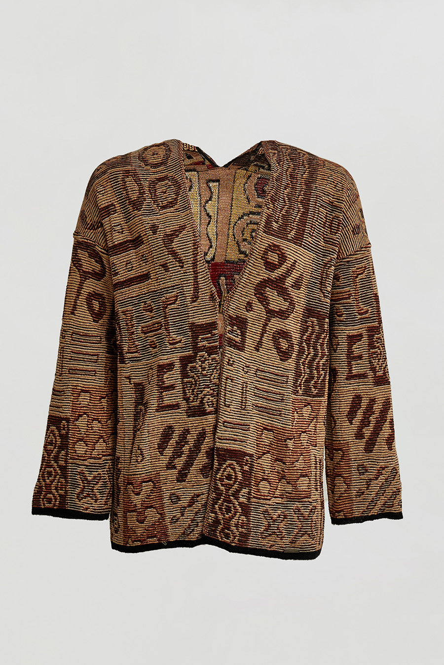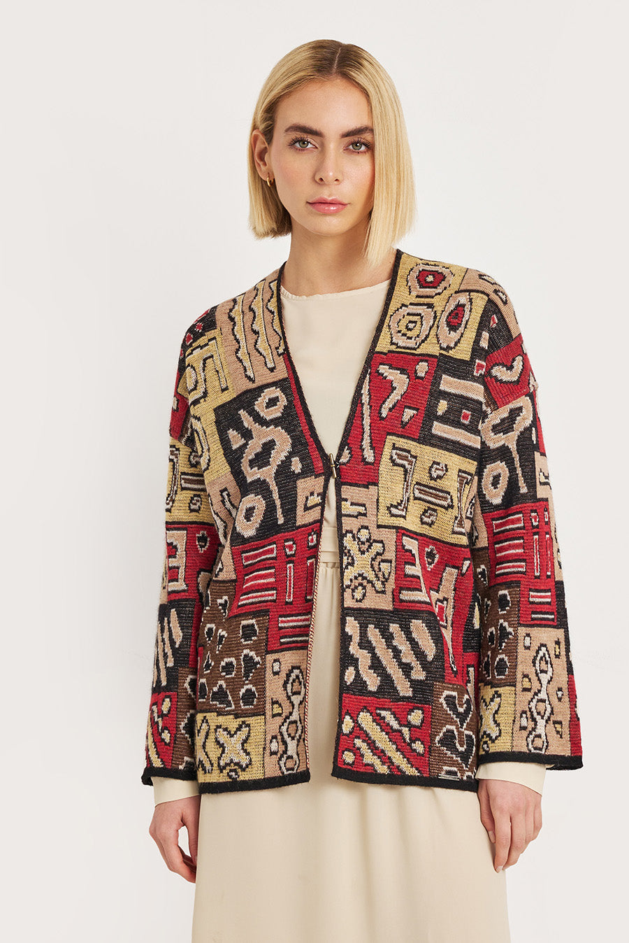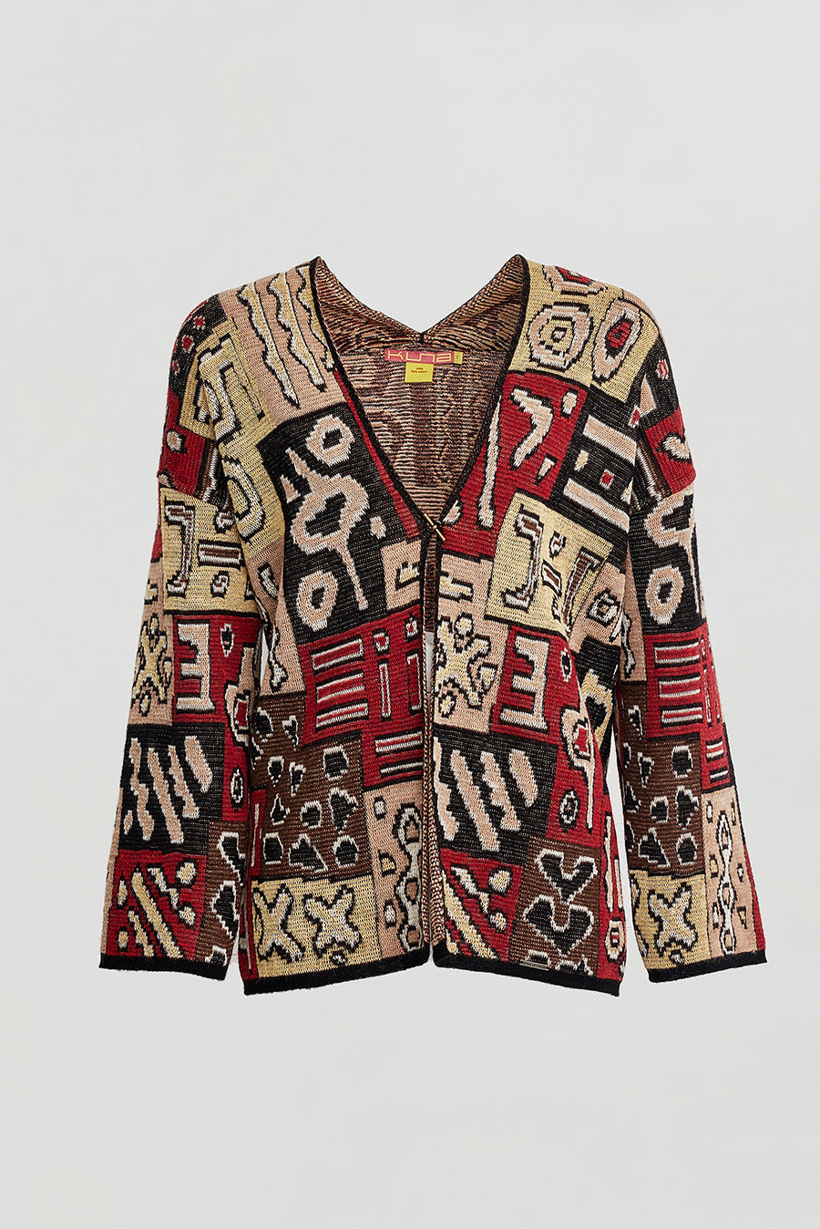 Una de las prendas mas representativas de esta colección, nuestro cárdigan reversible Wanikia, está copado de gráficos inspirados en AFROPERU. Deja que este colorido diseño te convierta en el centro de atención siempre que lo uses. | Material predominante: Baby Alpaca