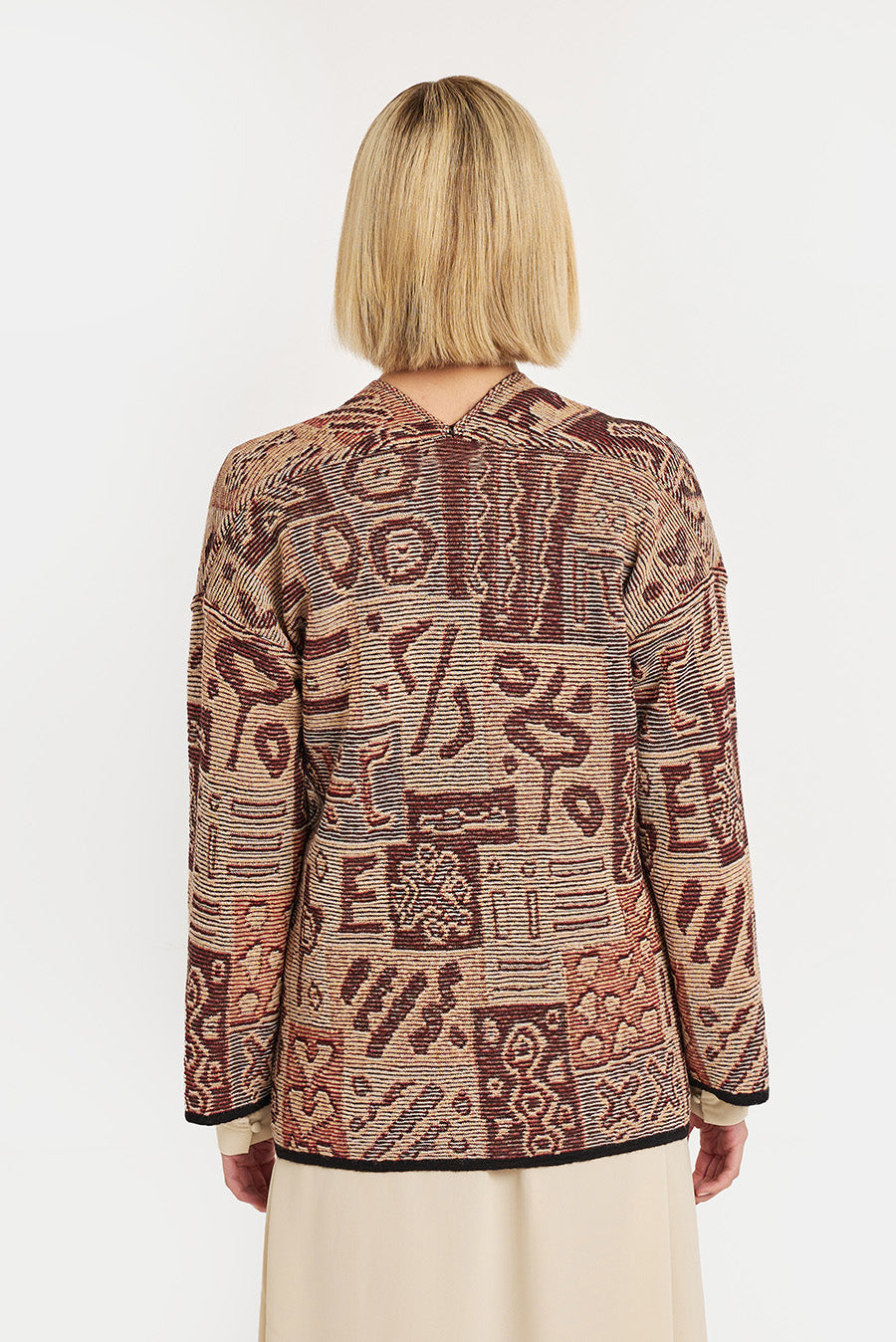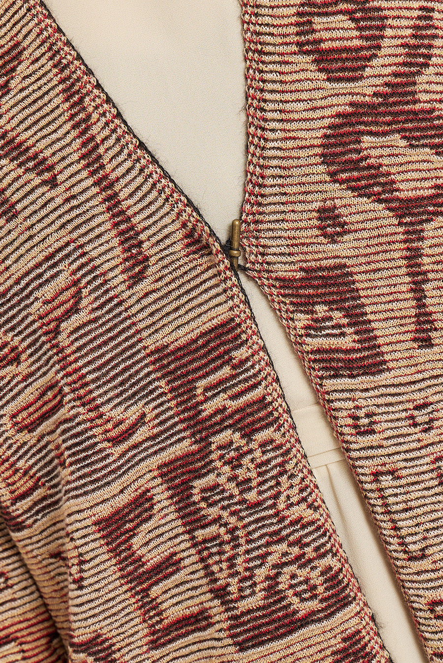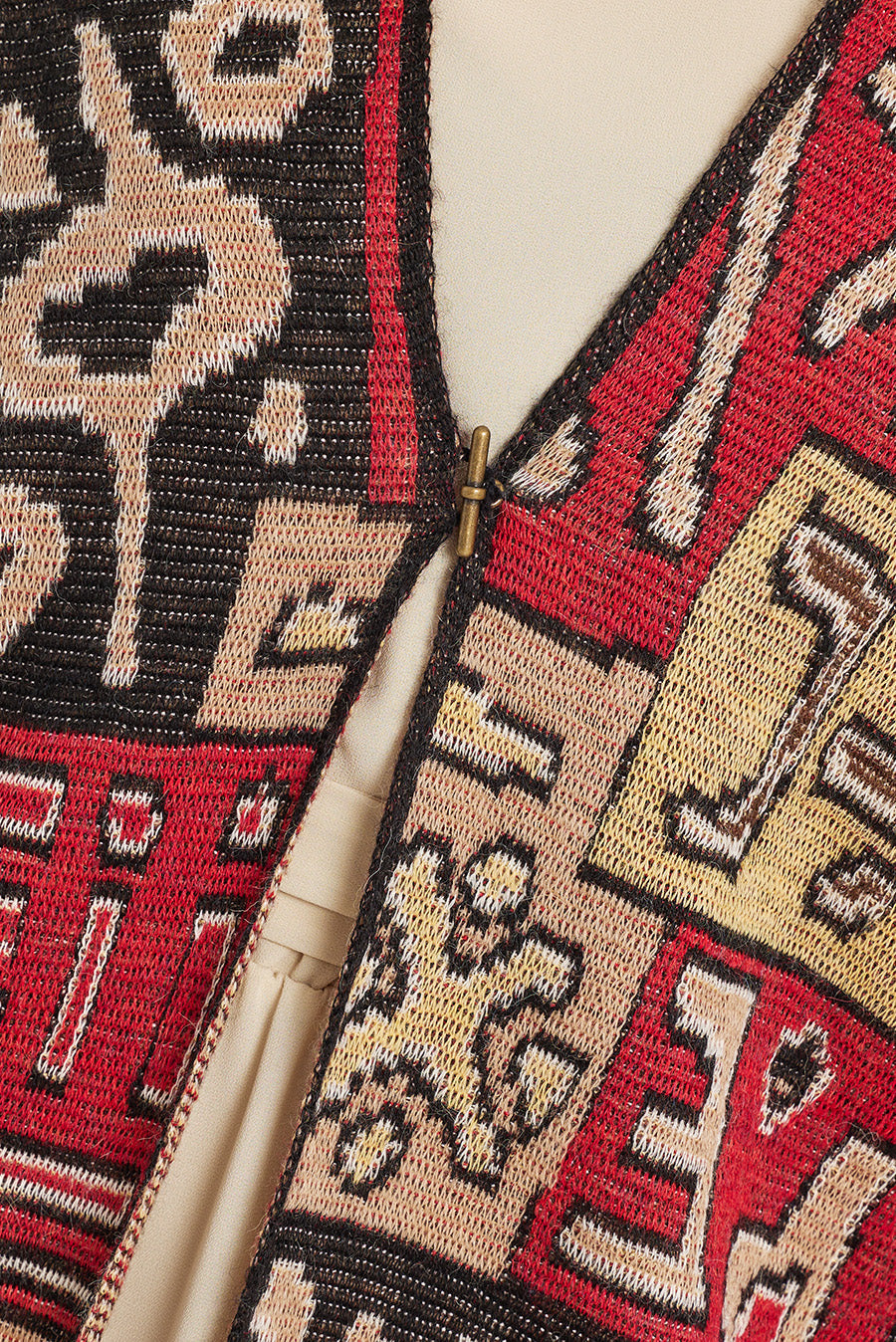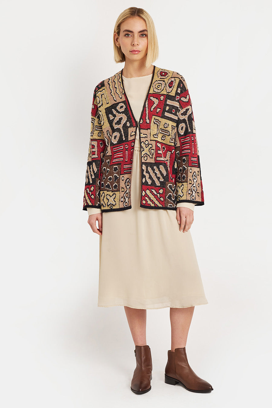Una de las prendas mas representativas de esta colección, nuestro cárdigan reversible Wanikia, está copado de gráficos inspirados en AFROPERU. Deja que este colorido diseño te convierta en el centro de atención siempre que lo uses. | Material predominante: Baby Alpaca