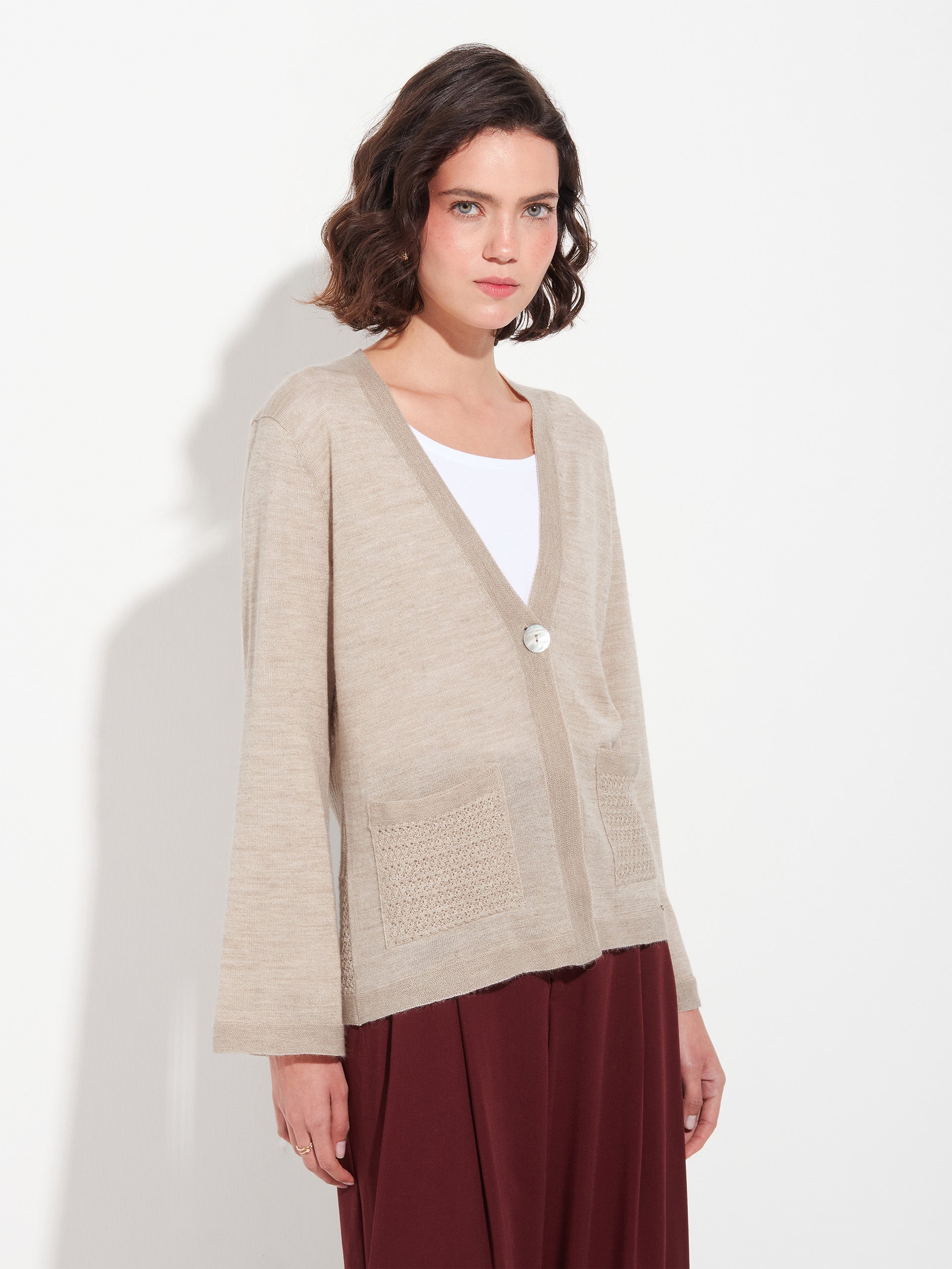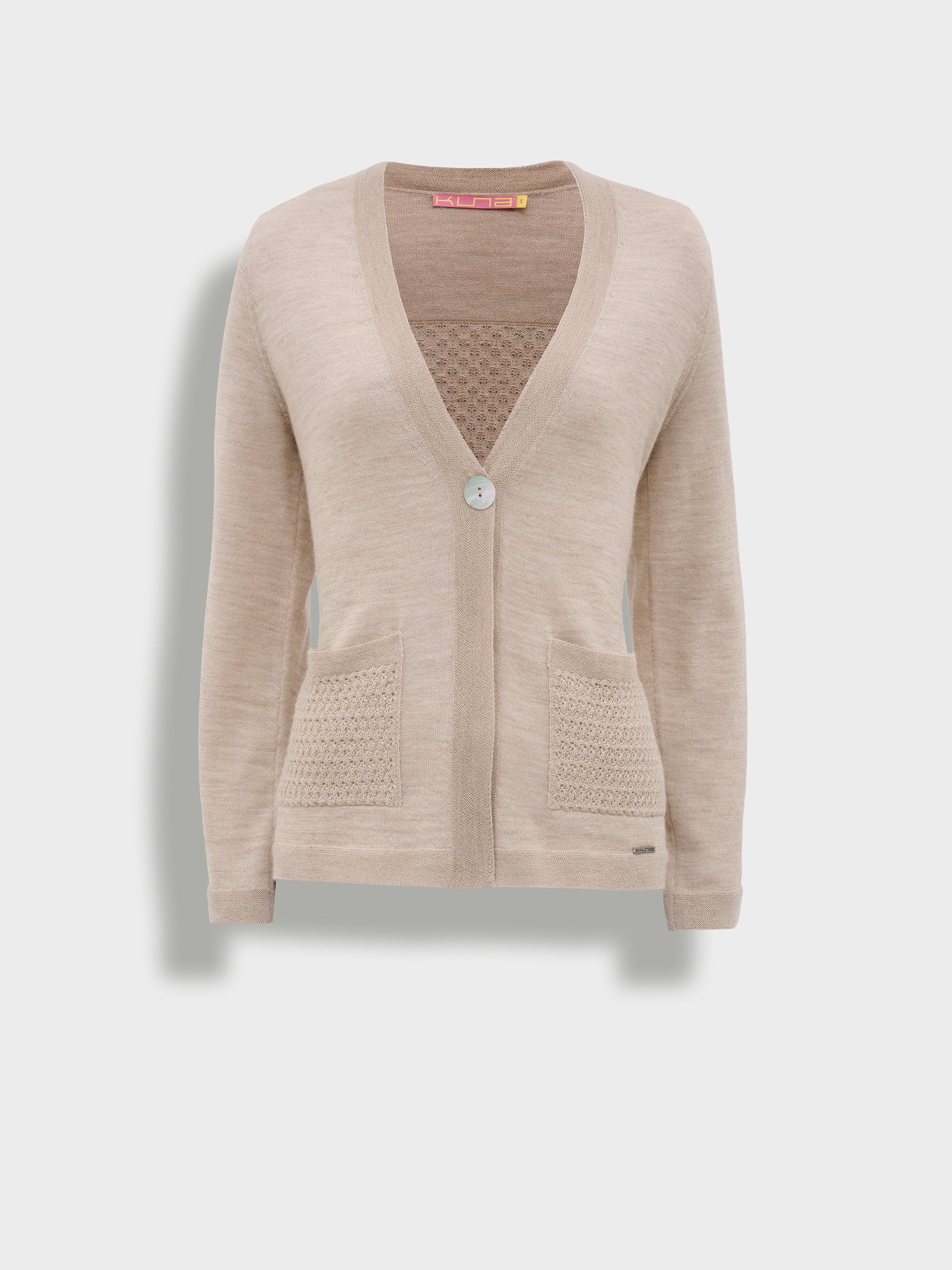 Cardigan Zanzibar en tonalidad beige, confeccionado en baby alpaca y seda. Presenta cuello en “V” con botones, punto llano en la parte delantera y delicados puntos pointelle en la espalda. Cuenta con bolsillos funcionales y un acabado elegante que equilibra confort y estilo. | Material predominante: Baby Alpaca