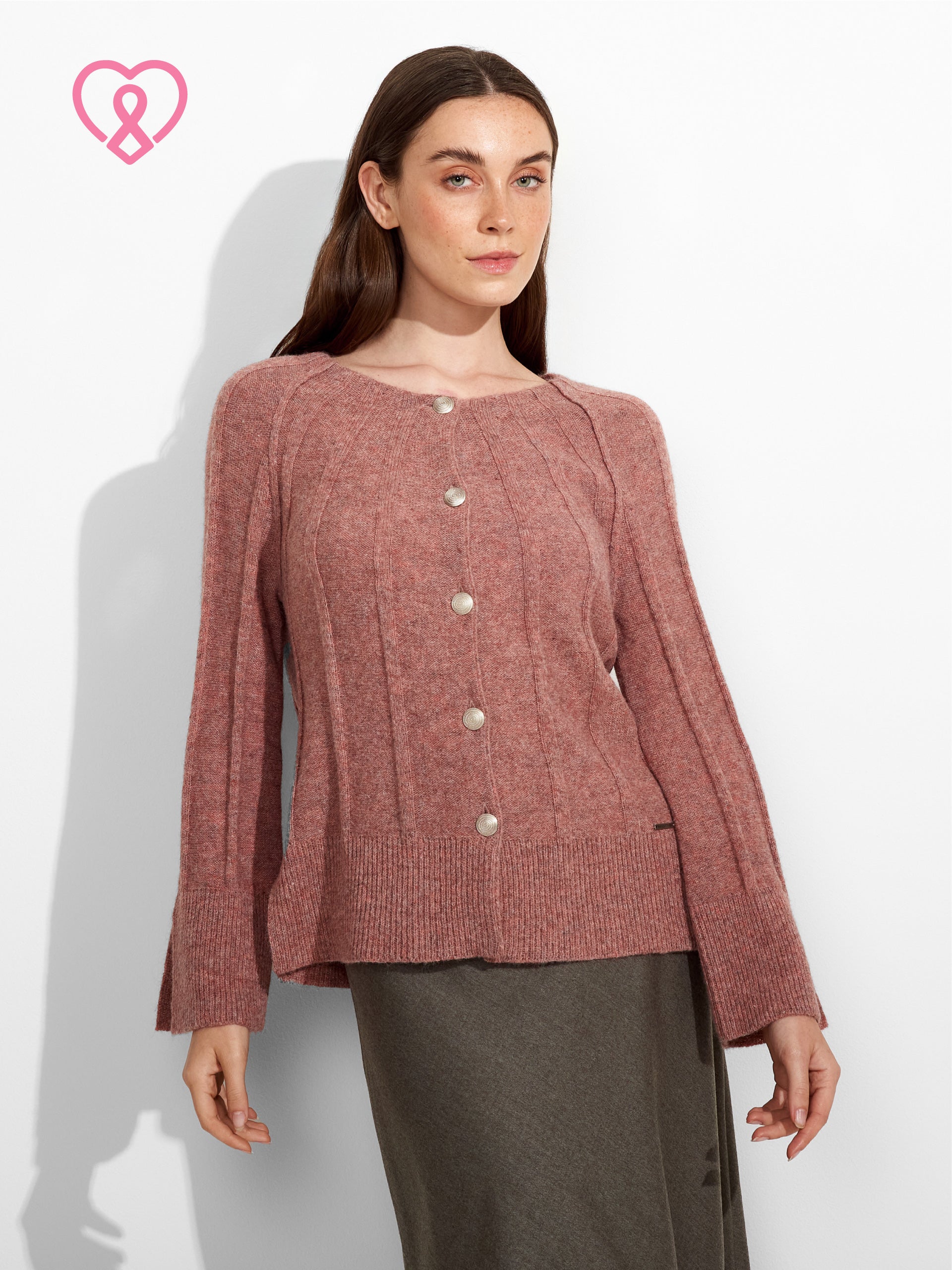 Cárdigan Zephir en tonalidad rosado, diseñado con cuello redondo y botones metálicos. Confeccionado en baby alpaca, brinda calidez y suavidad. | Material predominante: Baby Alpaca