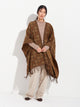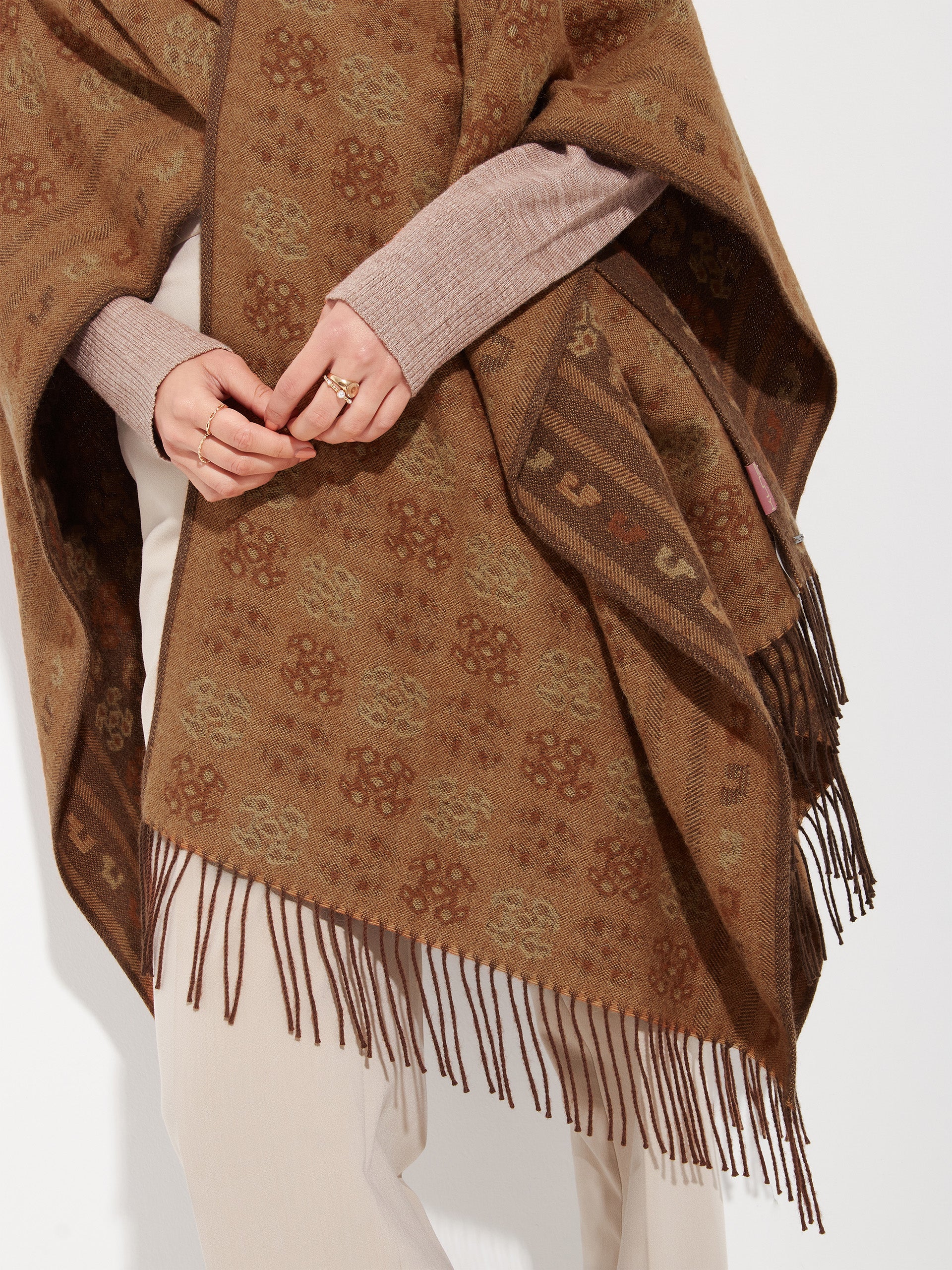 Poncho Chancay 35 en tonalidad marrón, elaborado en 100% baby alpaca con técnica Jacquard en doble cara. Es una prenda reversible, inspirada en la Cultura Chancay, que mantiene viva la tradición ancestral en un diseño representativo de la identidad cultural. | Material predominante: Baby Alpaca