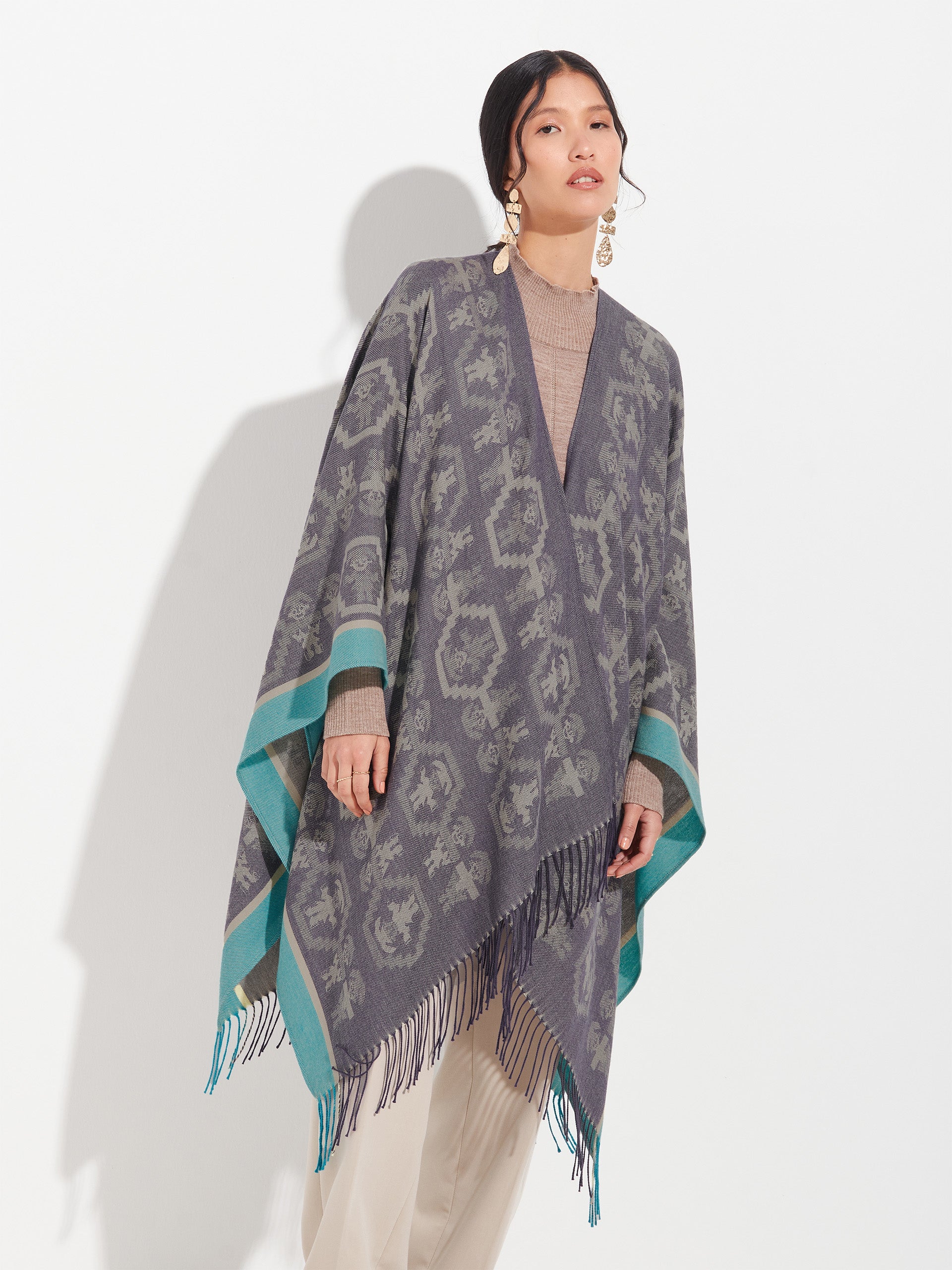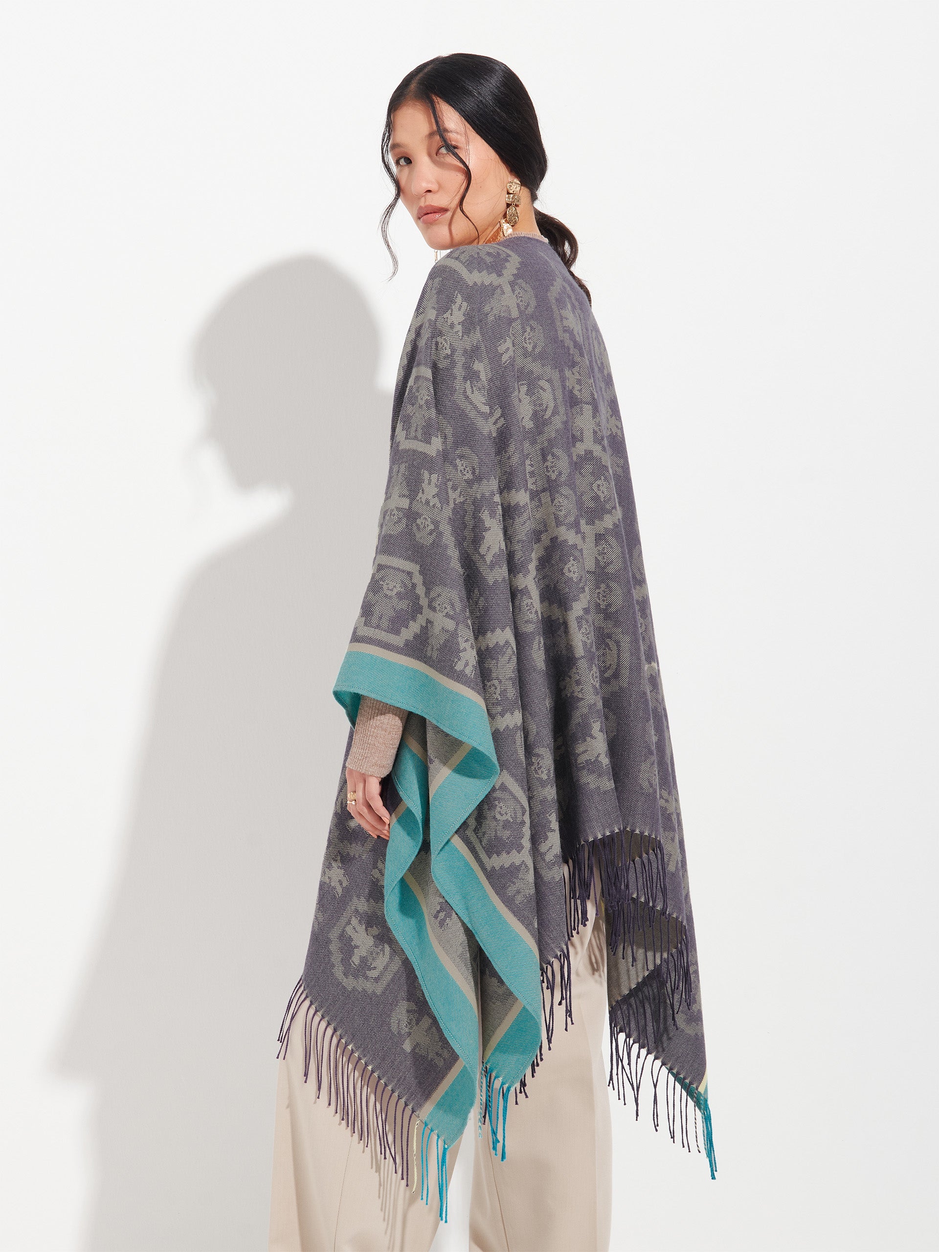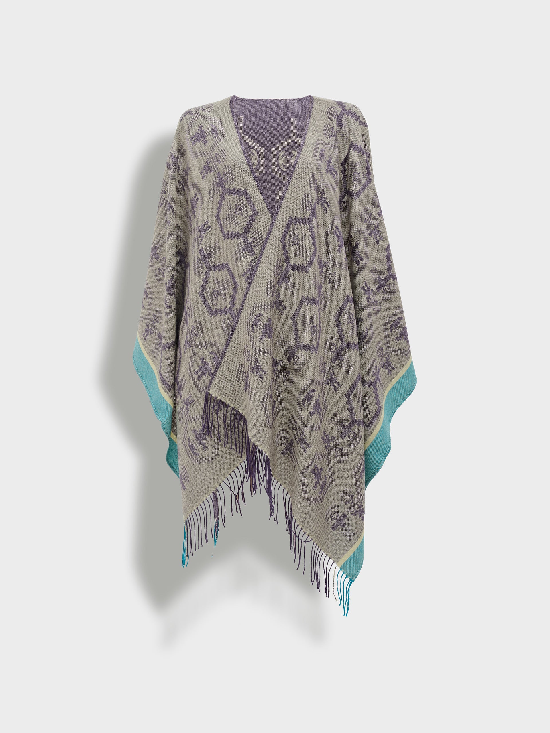 Poncho Chimu 12 en tonalidad morado, elaborado en 100% Alpaca Royal con técnica Jacquard satín (tela simple). Es una prenda reversible, inspirada en la Cultura Chimú, que refleja el valor de la tradición ancestral a través de un diseño lleno de identidad cultural. | Material predominante: Royal Alpaca