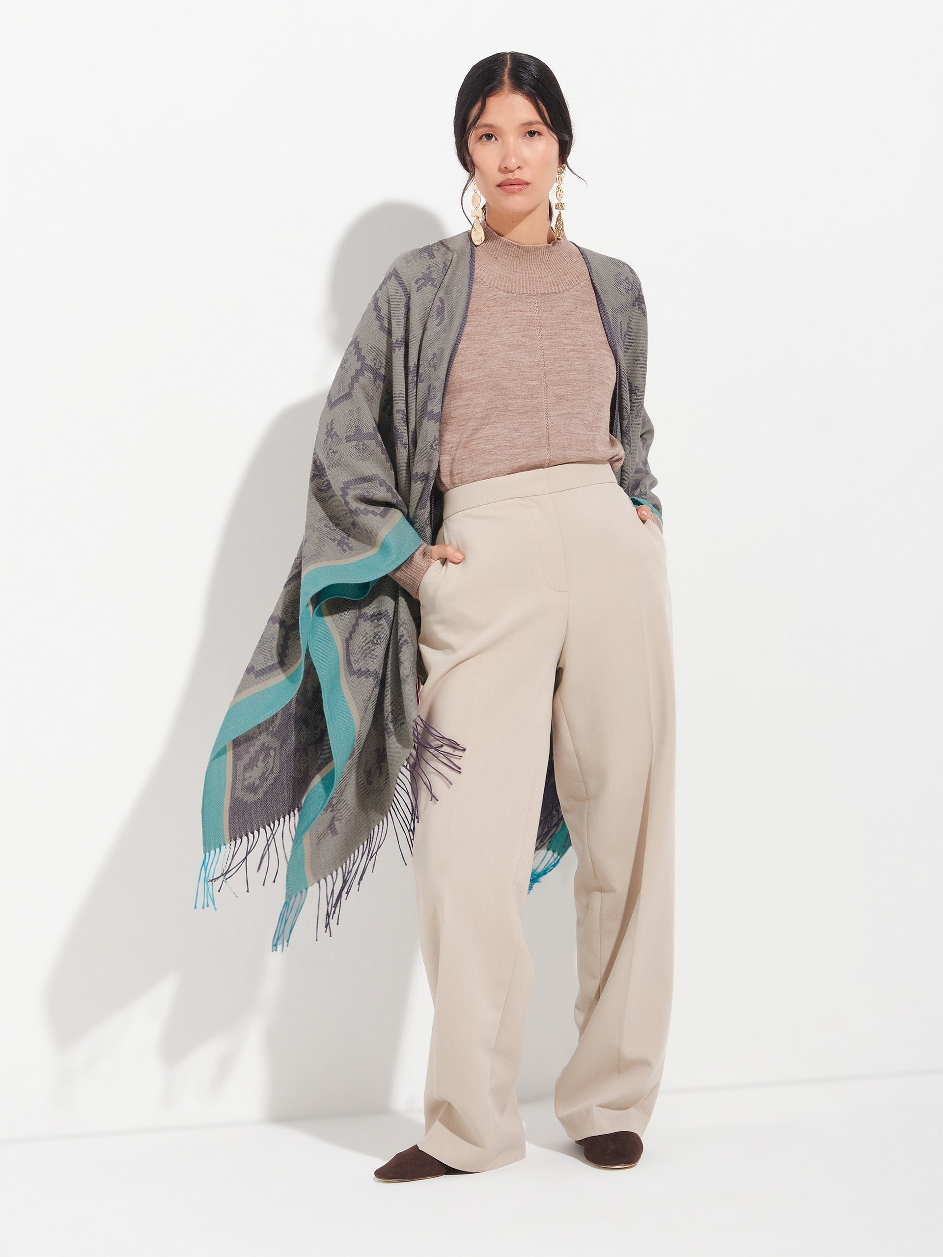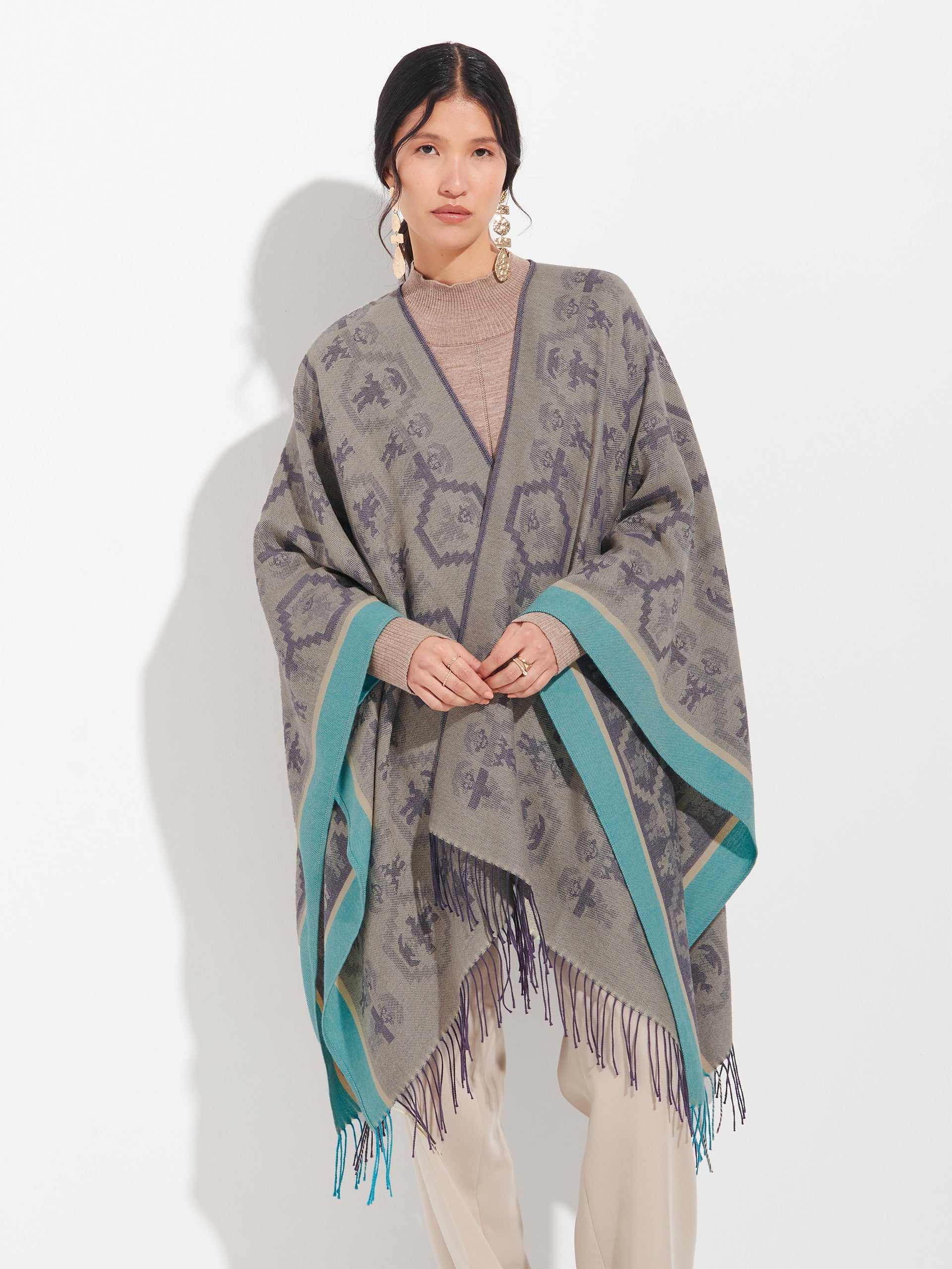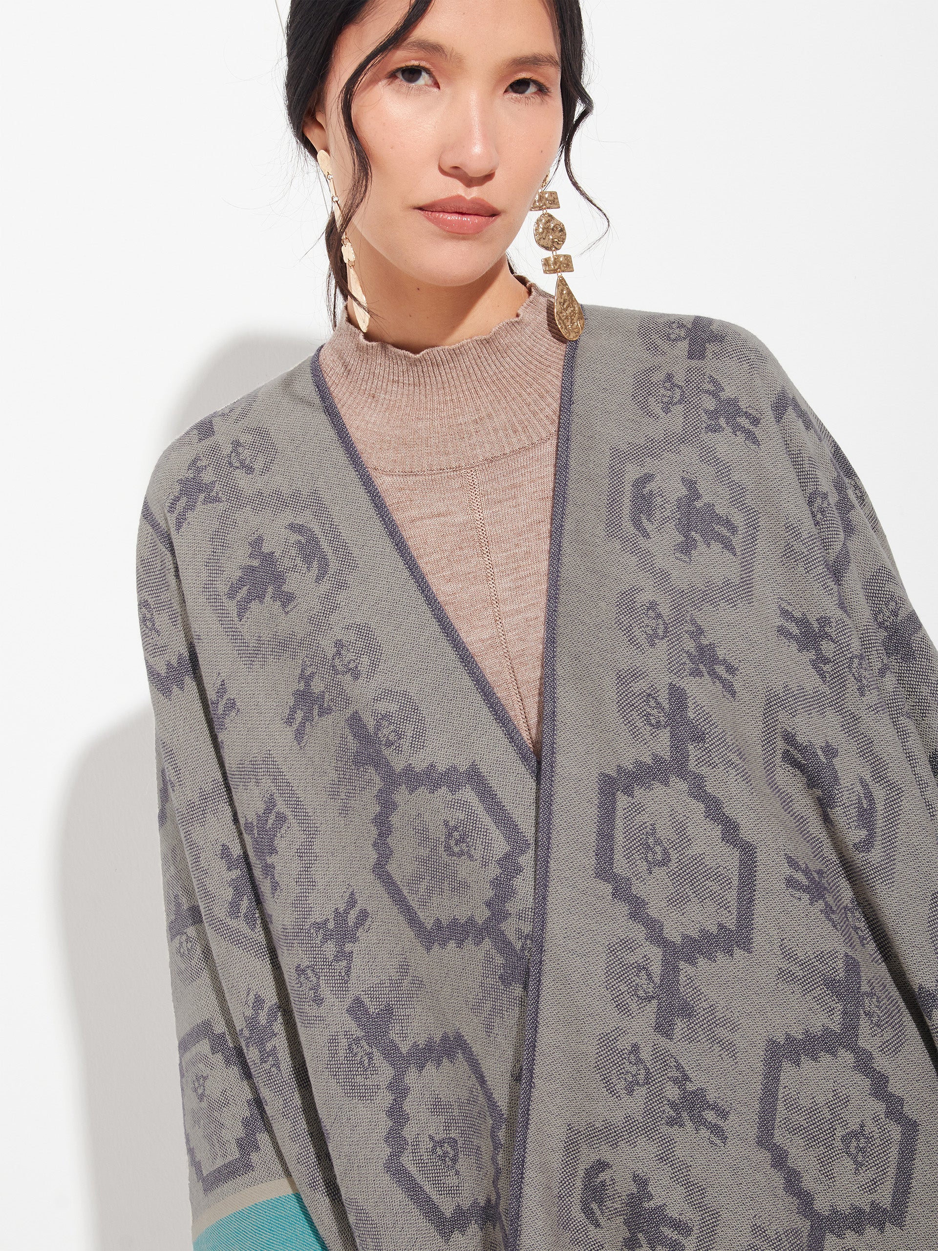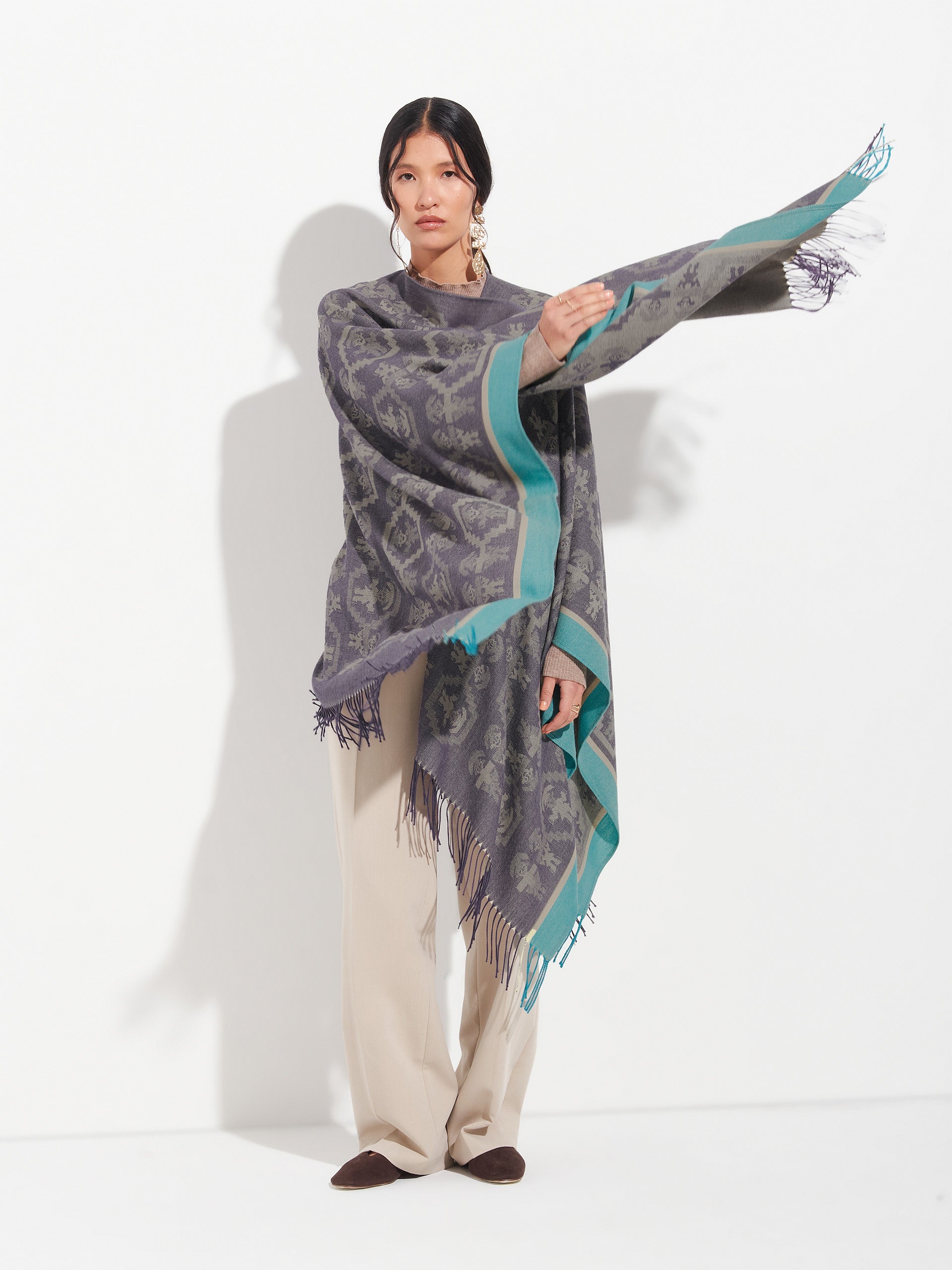 Poncho Chimu 12 en tonalidad morado, elaborado en 100% Alpaca Royal con técnica Jacquard satín (tela simple). Es una prenda reversible, inspirada en la Cultura Chimú, que refleja el valor de la tradición ancestral a través de un diseño lleno de identidad cultural. | Material predominante: Royal Alpaca