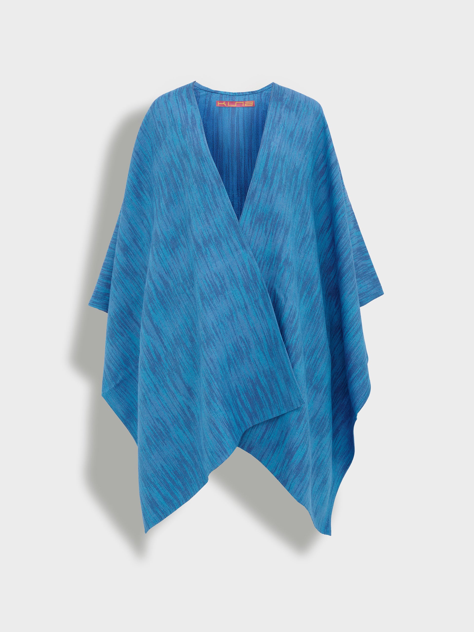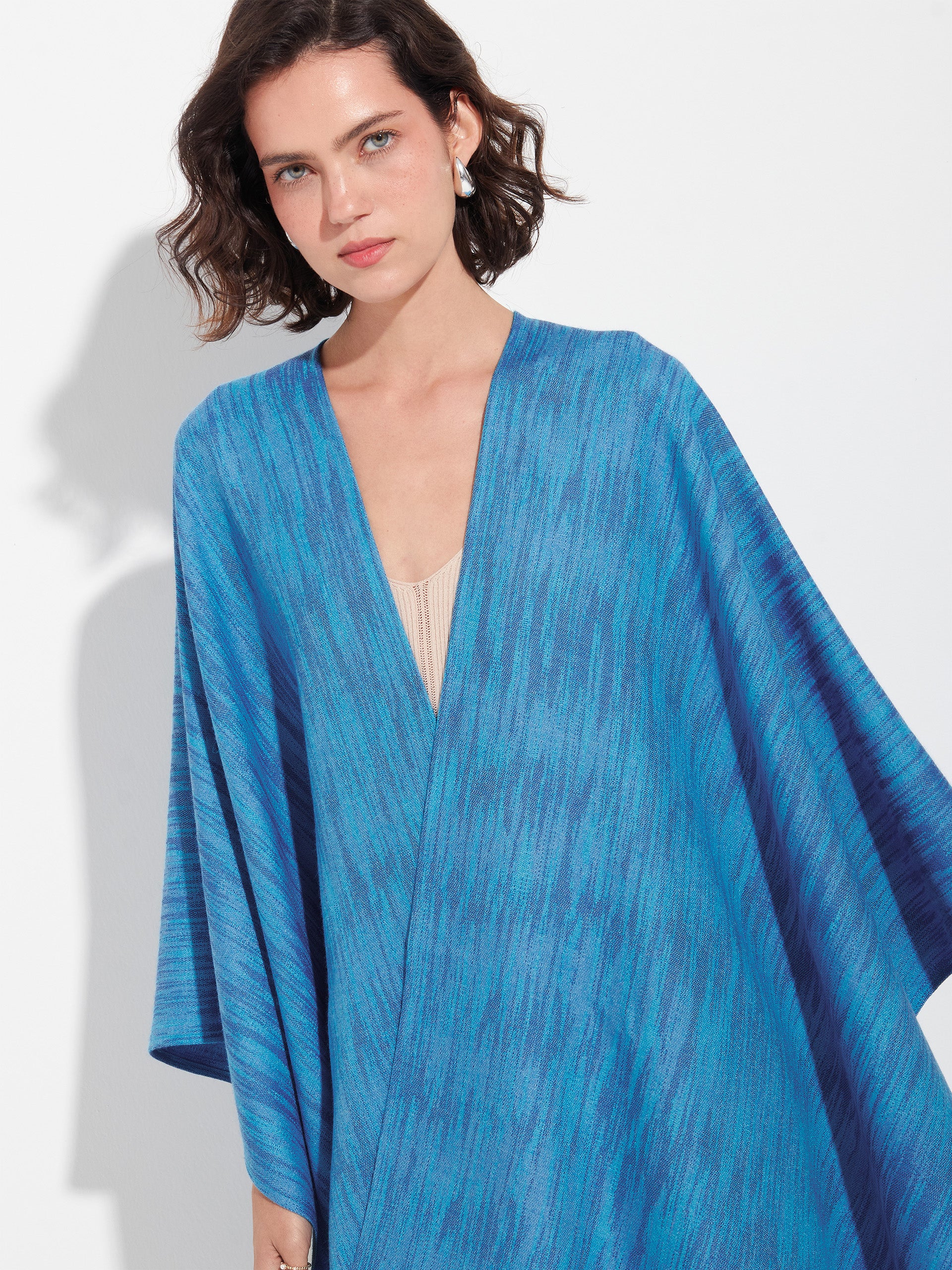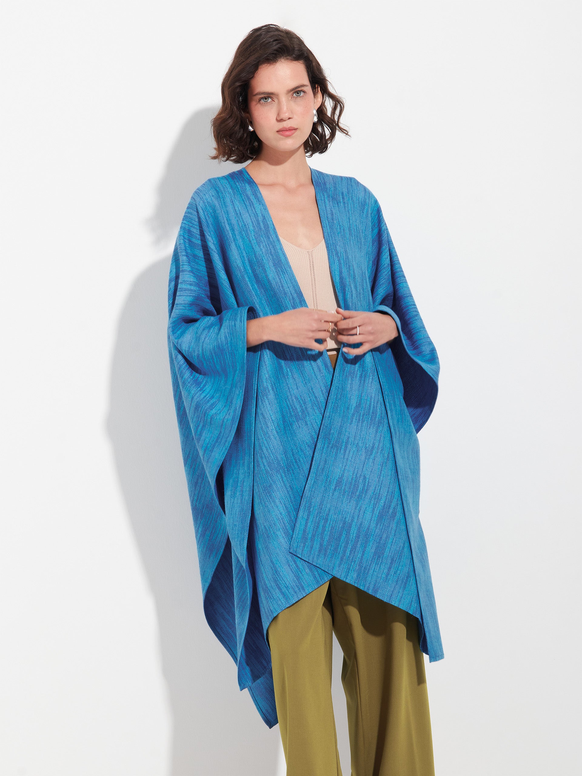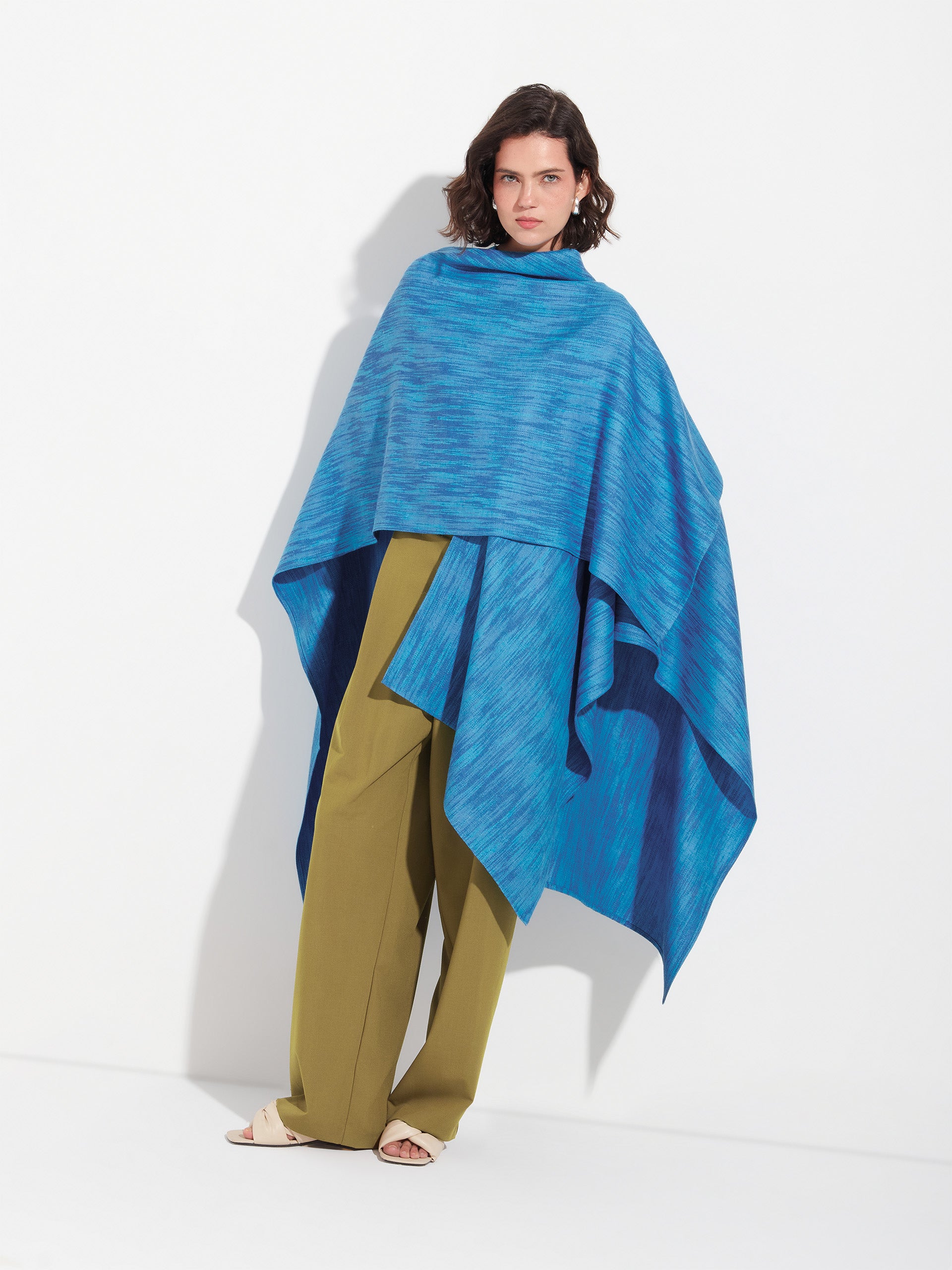 Capa Zareli en tonalidad morado, confeccionada en baby alpaca y seda. Es una capa doble faz con diseño jacquard a tres colores, que combina calidez, textura y elegancia atemporal. | Material predominante: Baby Alpaca