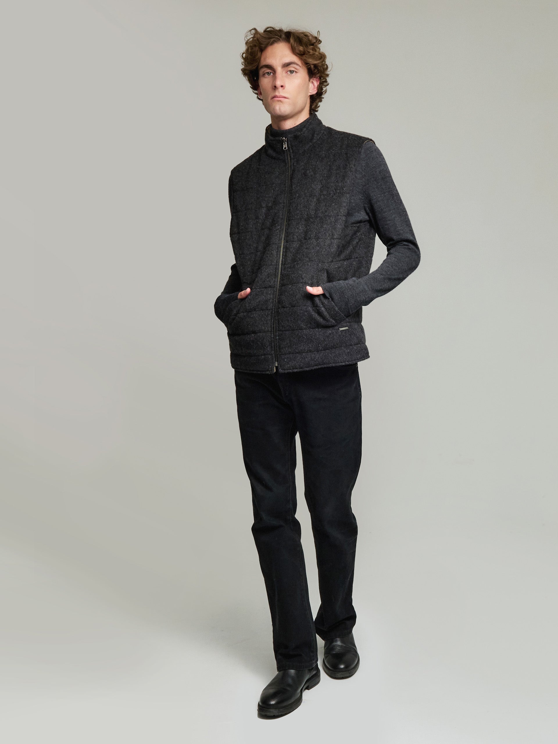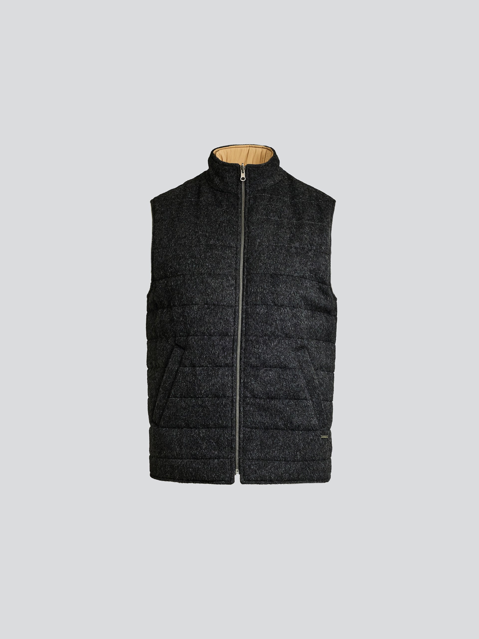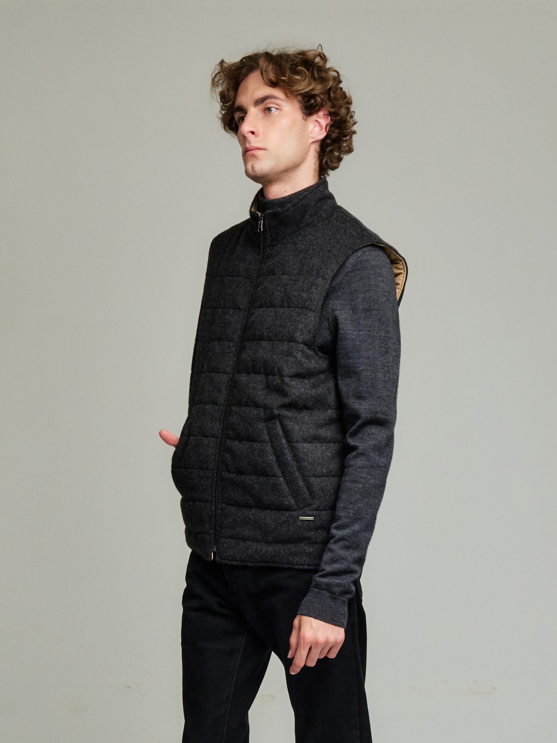 El chaleco reversible Yulian, una joya de versatilidad, deslumbra con su textura inigualable. Su cuello alto y cierre metálico añaden un toque sofisticado. Confeccionado magistralmente con una mezcla de baby alpaca y lana. La elección perfecta para infundir estilo y funcionalidad a tus conjuntos con un toque de distinción. | Material predominante: Baby Alpaca