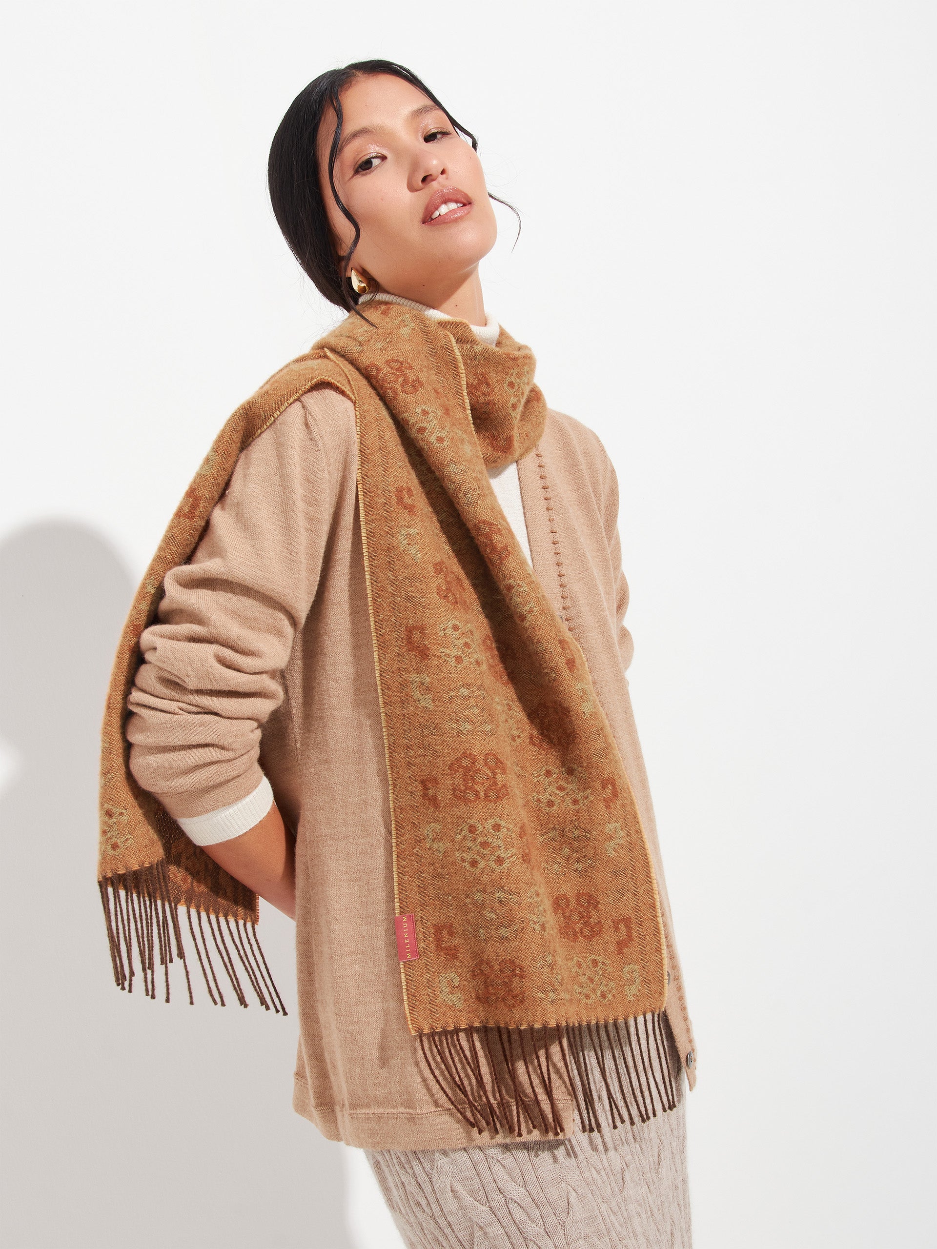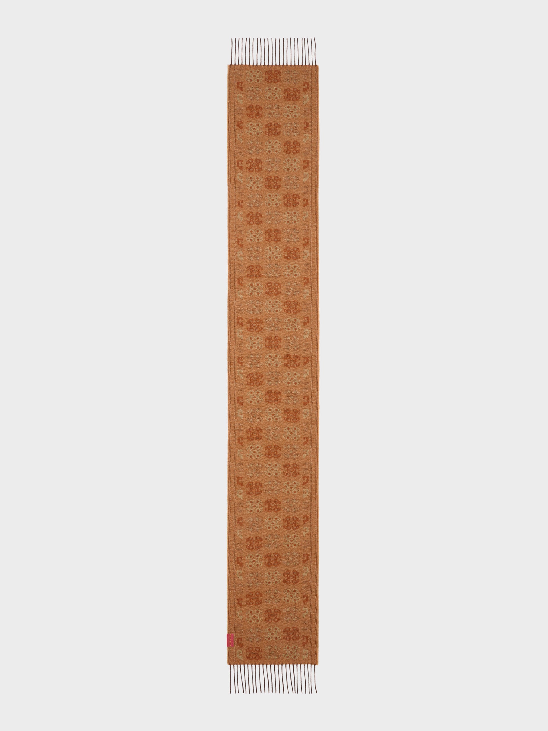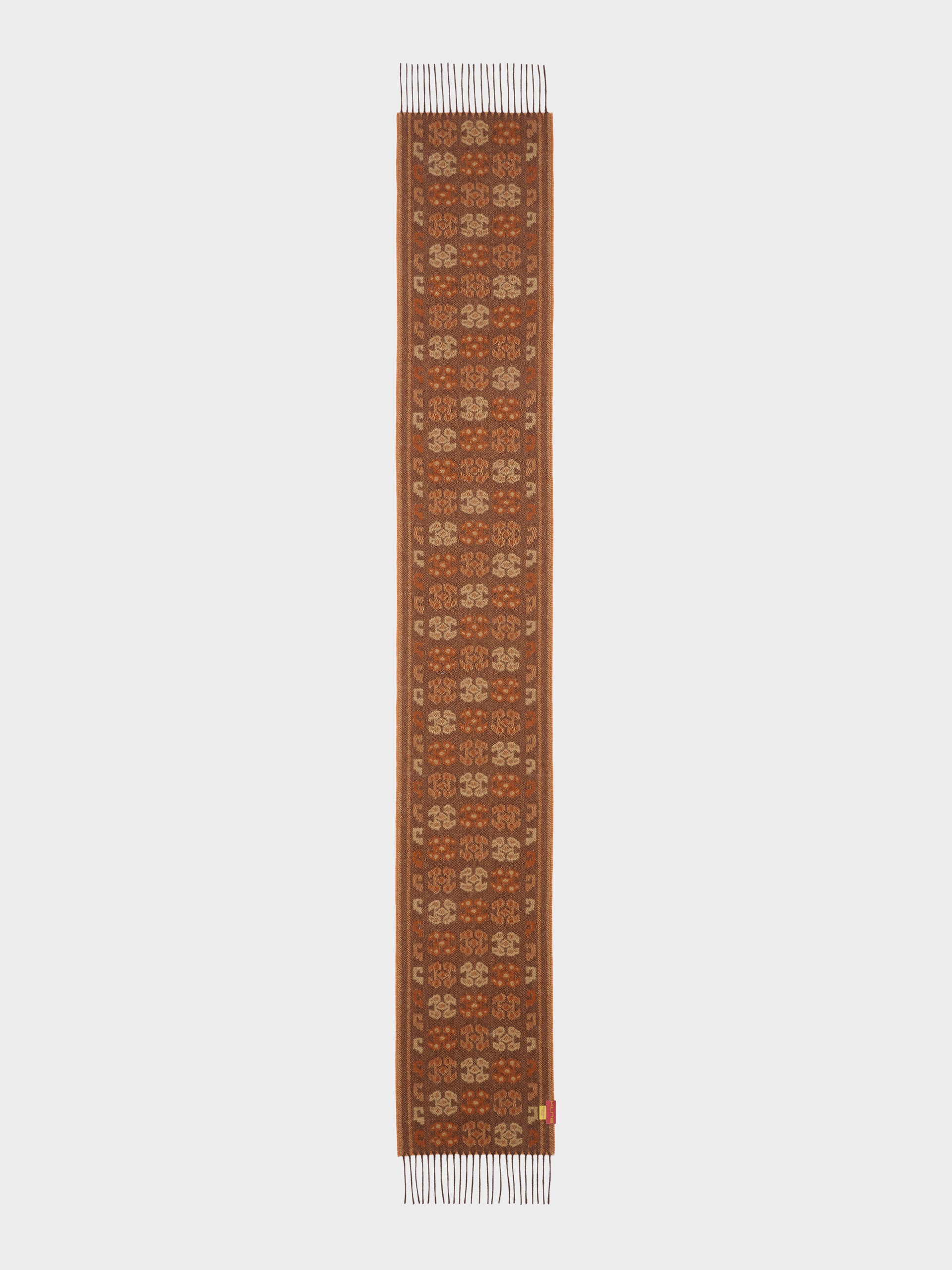 Chalina Chancay 36 en tonalidad marrón, elaborada en 100% baby alpaca con técnica Jacquard en doble cara. Con una medida de 180/164 x 25 cm, está inspirada en la Cultura Chancay. Accesorio unisex, que conecta con la memoria ancestral a través de un diseño auténticamente cultural. | Material predominante: Baby Alpaca