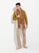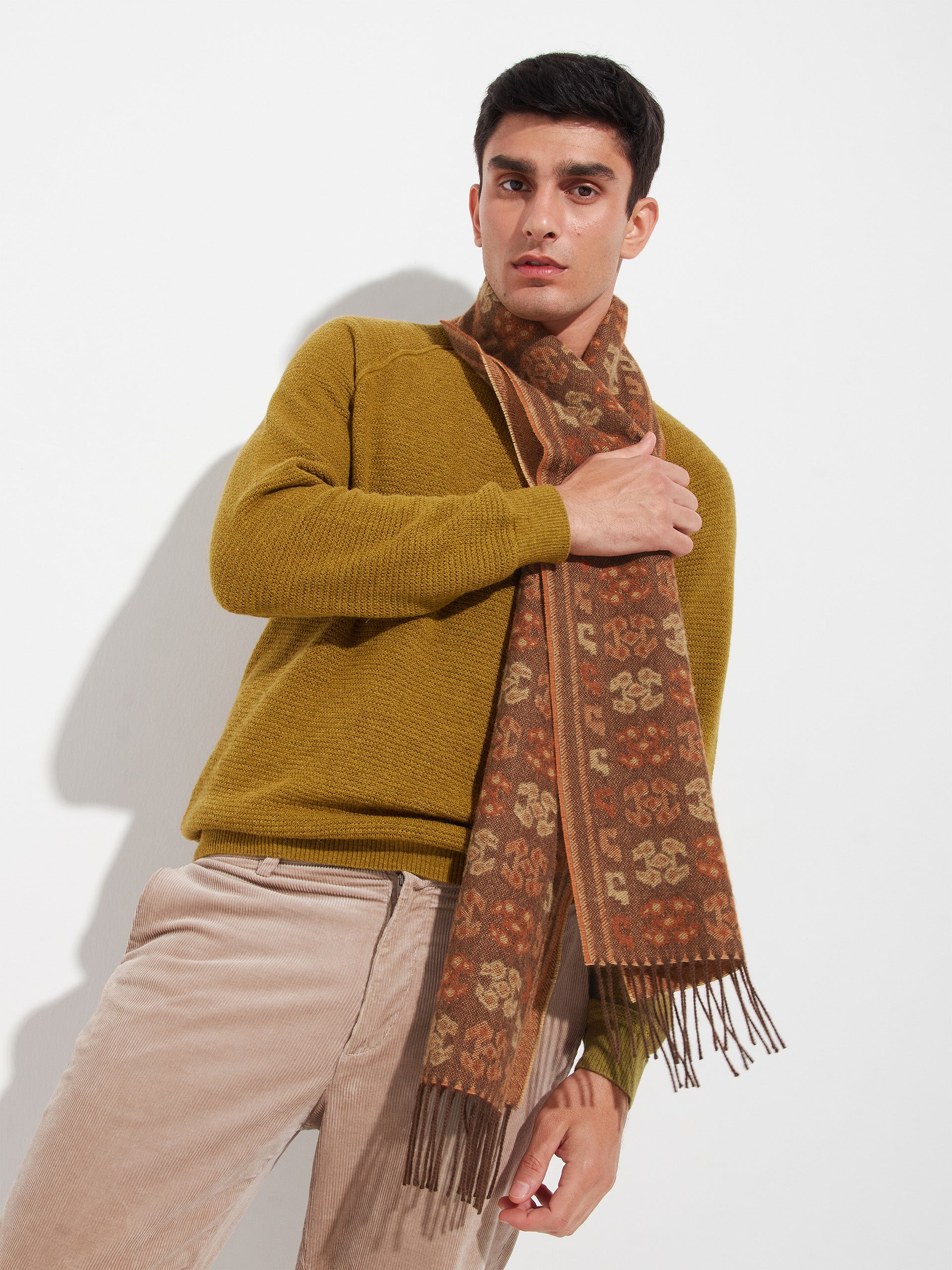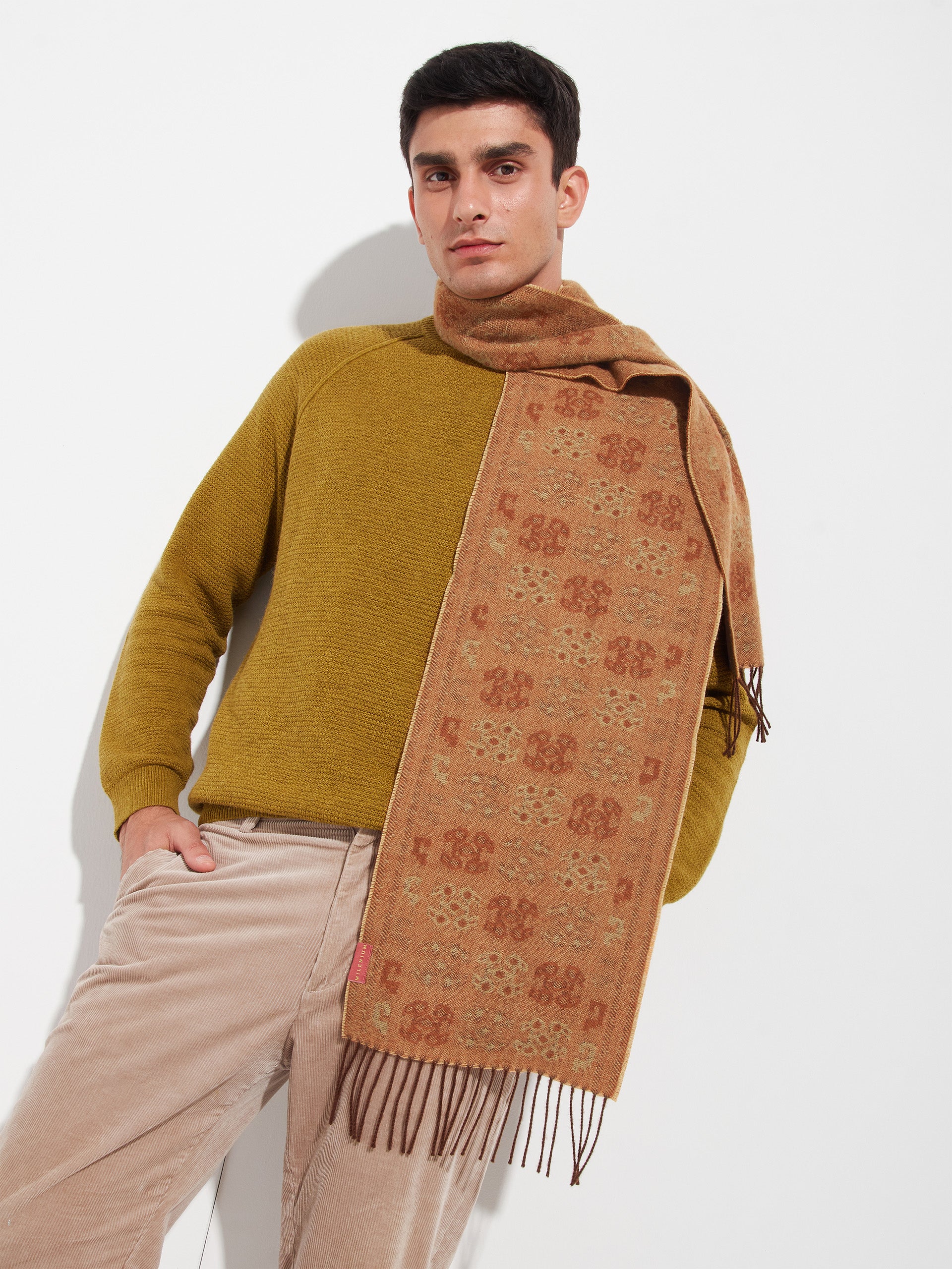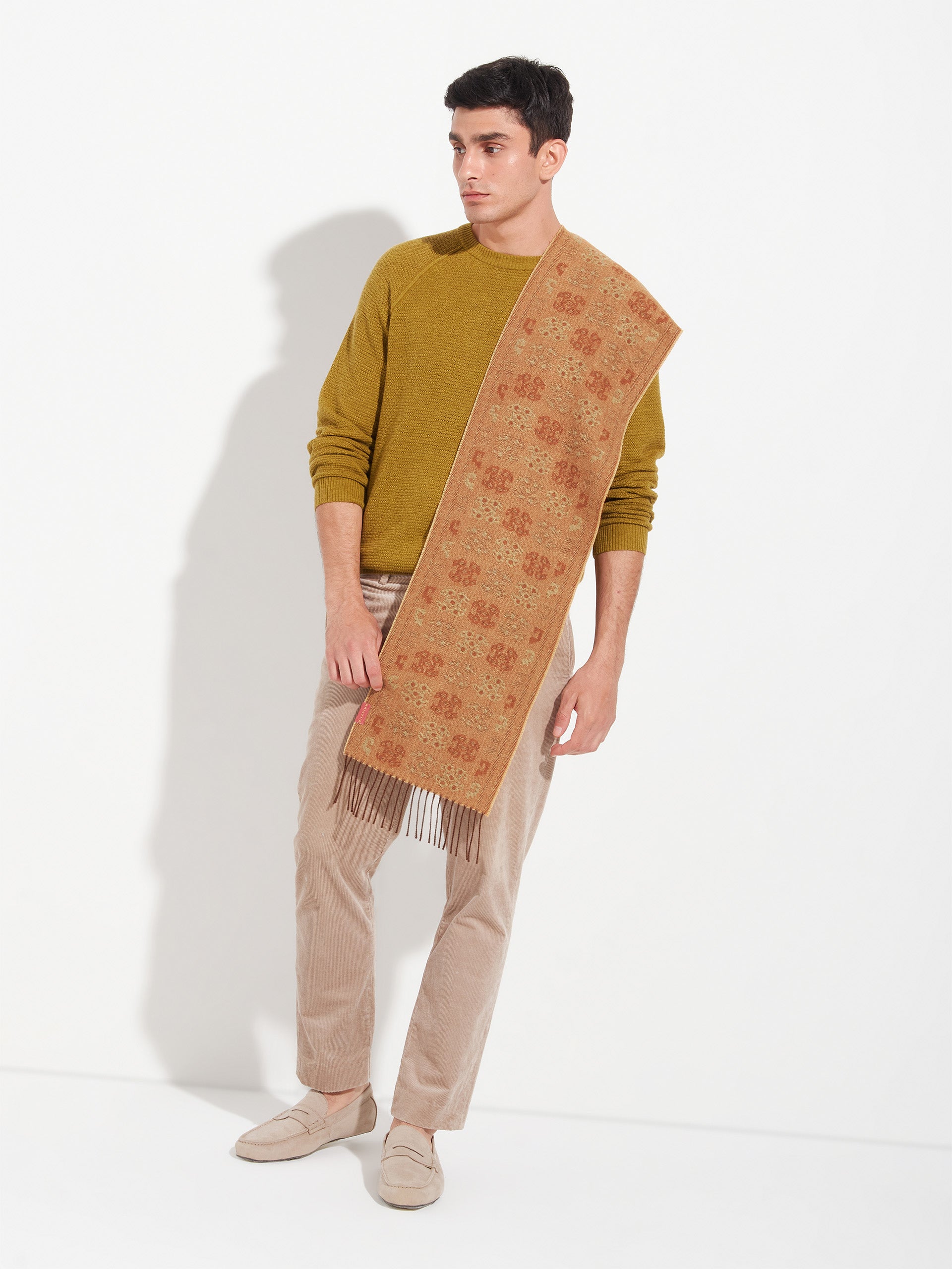 Chalina Chancay 36 en tonalidad marrón, elaborada en 100% baby alpaca con técnica Jacquard en doble cara. Con una medida de 180/164 x 25 cm, está inspirada en la Cultura Chancay. Accesorio unisex, que conecta con la memoria ancestral a través de un diseño auténticamente cultural. | Material predominante: Baby Alpaca