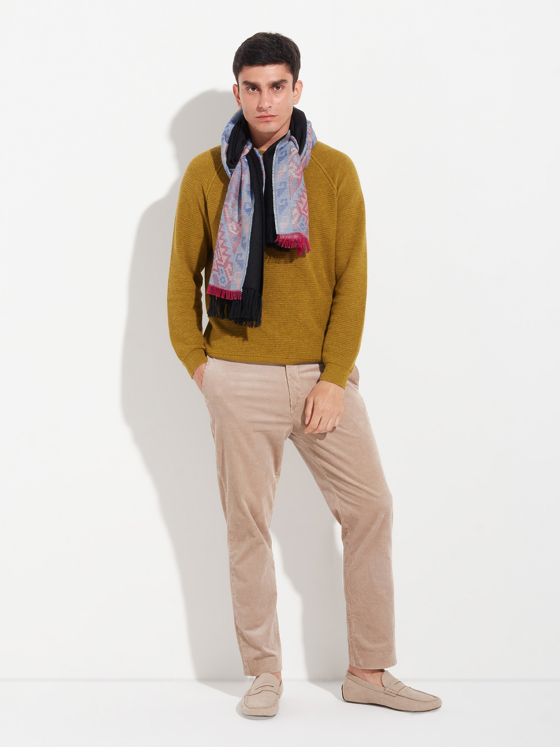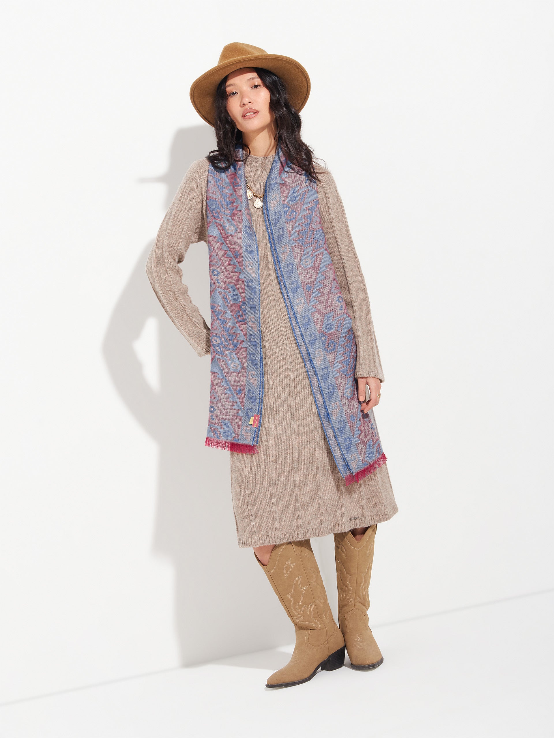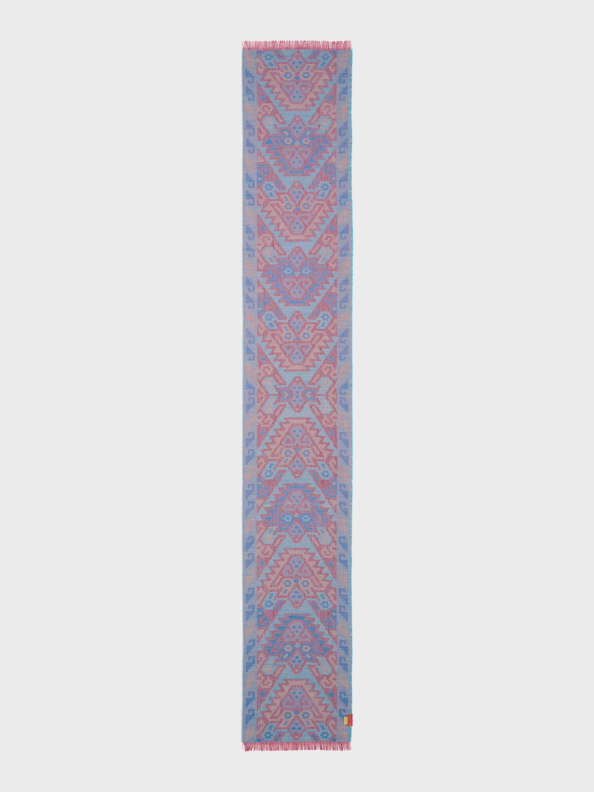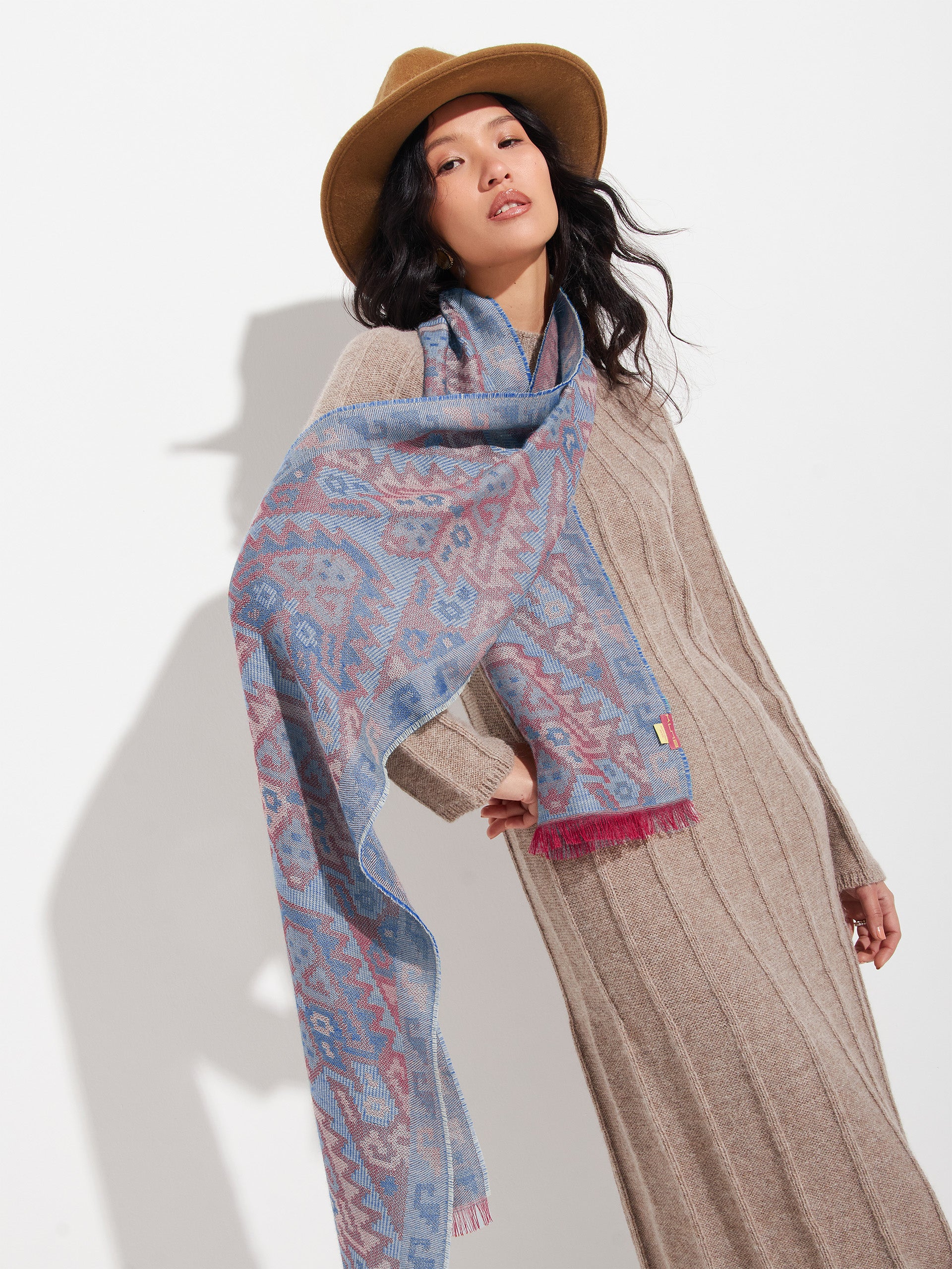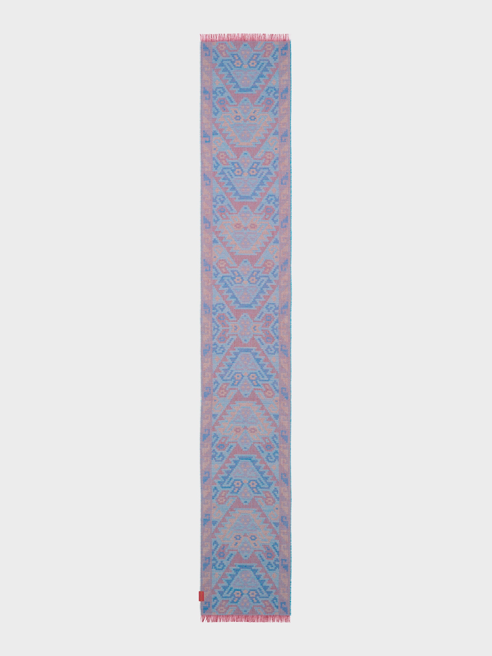 Chalina Chancay 38 en tonalidad azul, elaborada en 70% baby alpaca y 30% seda, con técnica Jacquard en doble cara. Con una medida de 200/196 x 30 cm, es un accesorio unisex y reversible, inspirado en la Cultura Chancay, que conecta con la memoria ancestral a través de un diseño auténticamente cultural. | Material predominante: Baby Alpaca