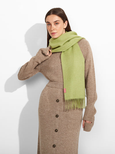 Chalina Zeta en tonalidad verde, de diseño de color entero con bordes terminados en flecos gruesos. Confeccionada en baby alpaca, brinda calidez y suavidad. | Material predominante: Baby Alpaca