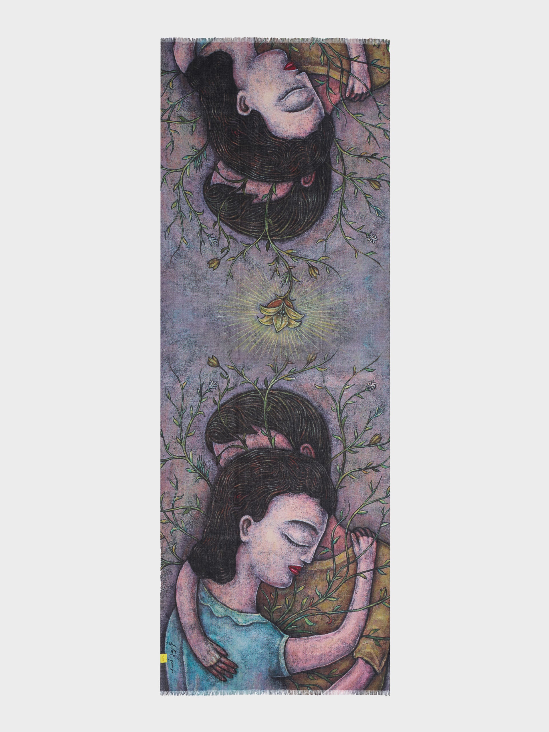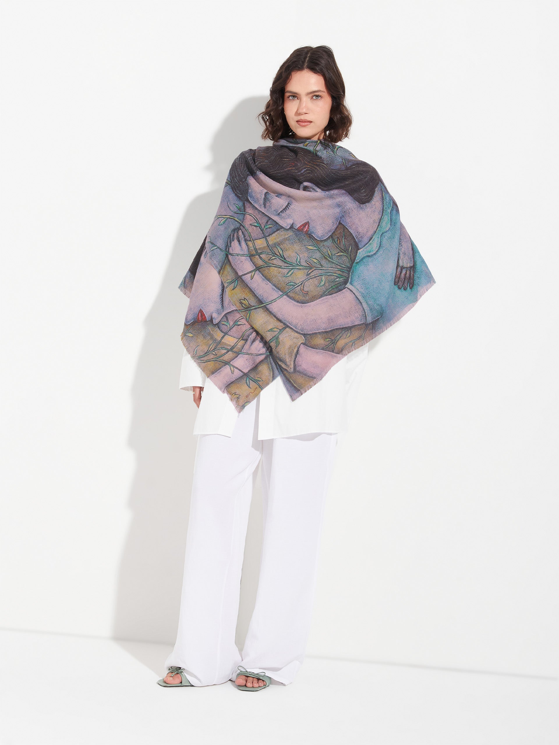 El abrazo es el lugar único donde se detiene el tiempo y en el cual la contención y el refugio se puede dar. El acto se convierte en un símbolo de comunión interior, crecimiento y pertenencia. Esta refinada estola ha sido inspiración de nuestro artista Fito Espinoza, elaborada en baby alpaca y seda. | Material predominante: Baby Alpaca