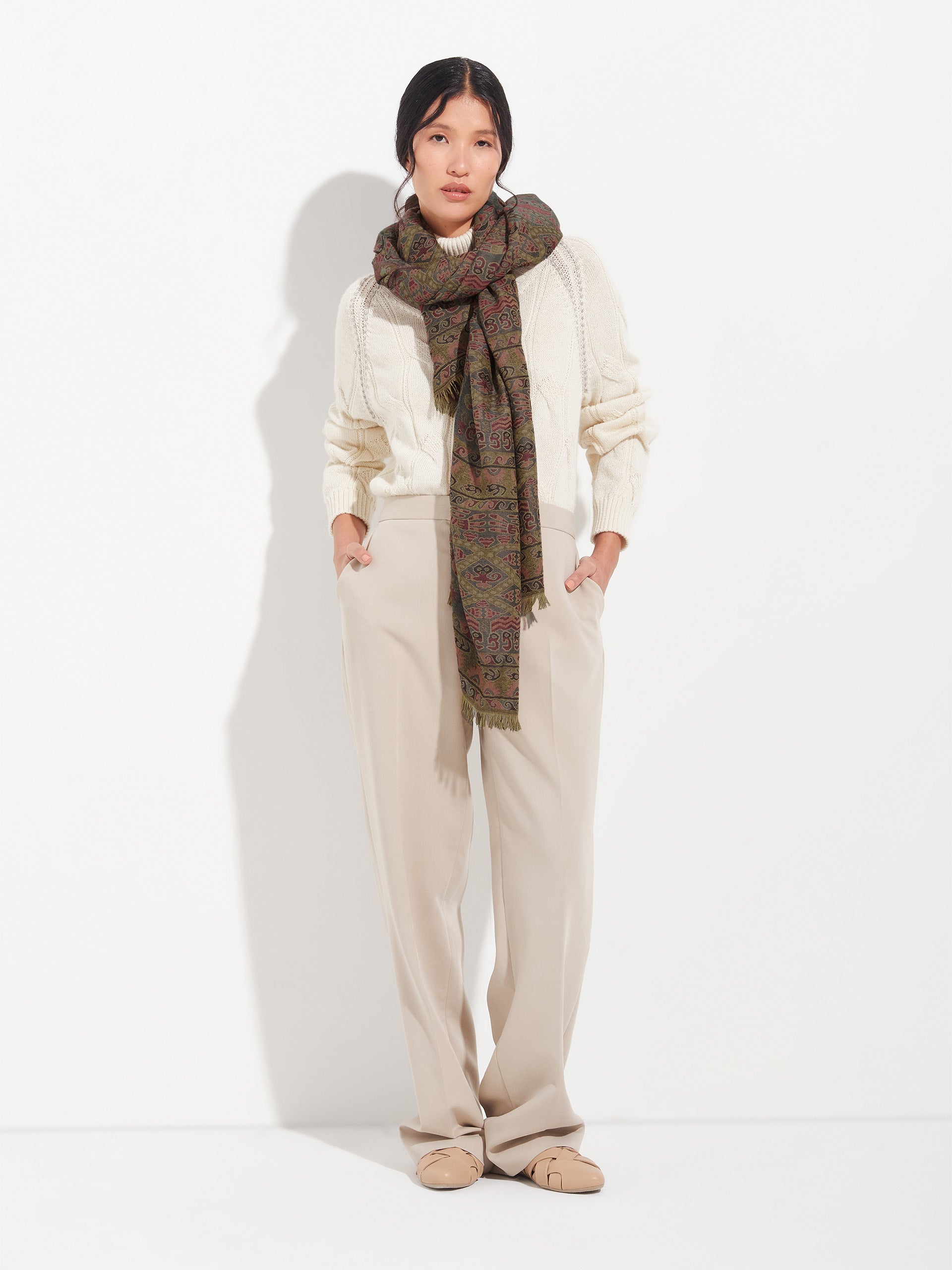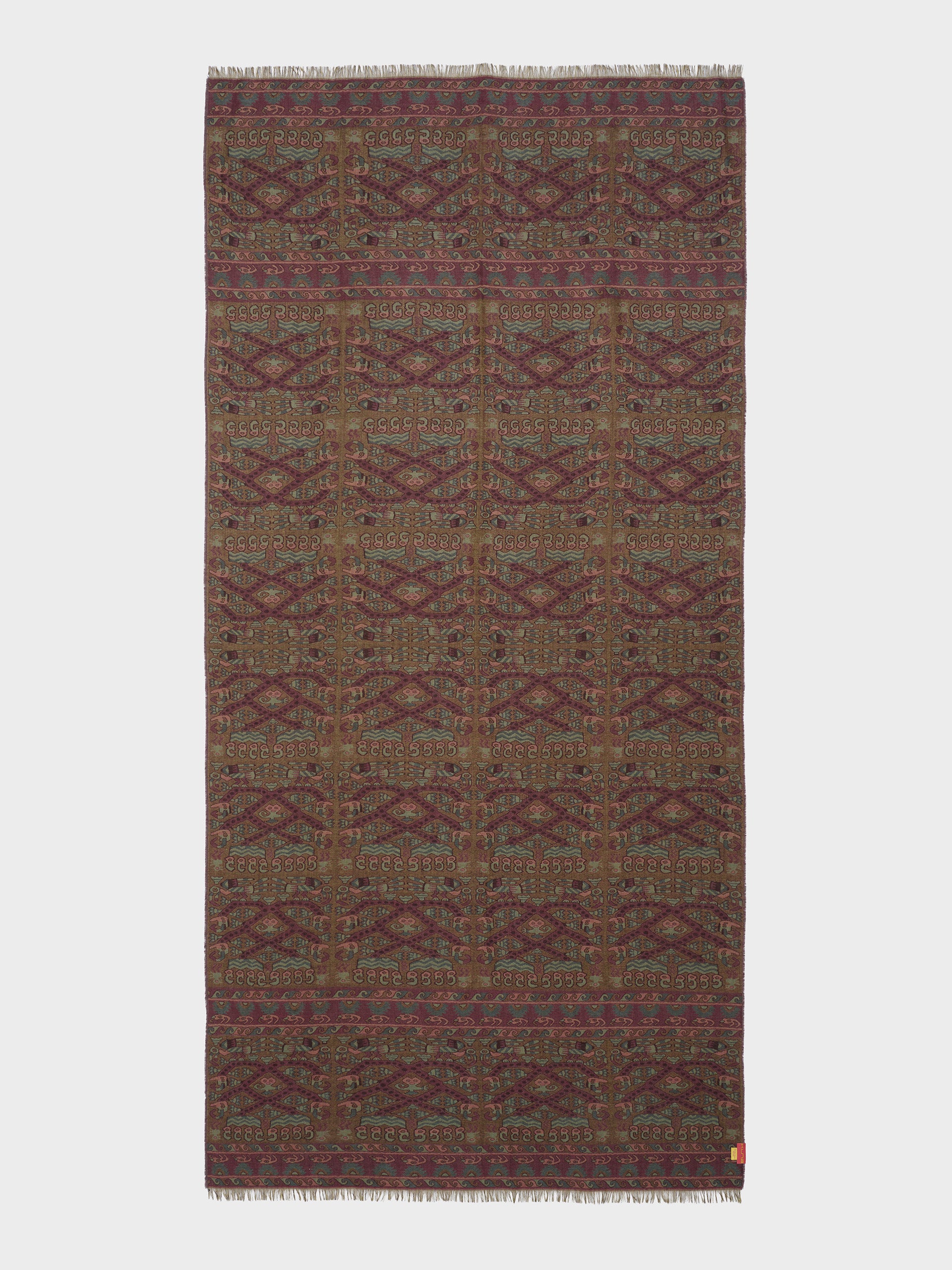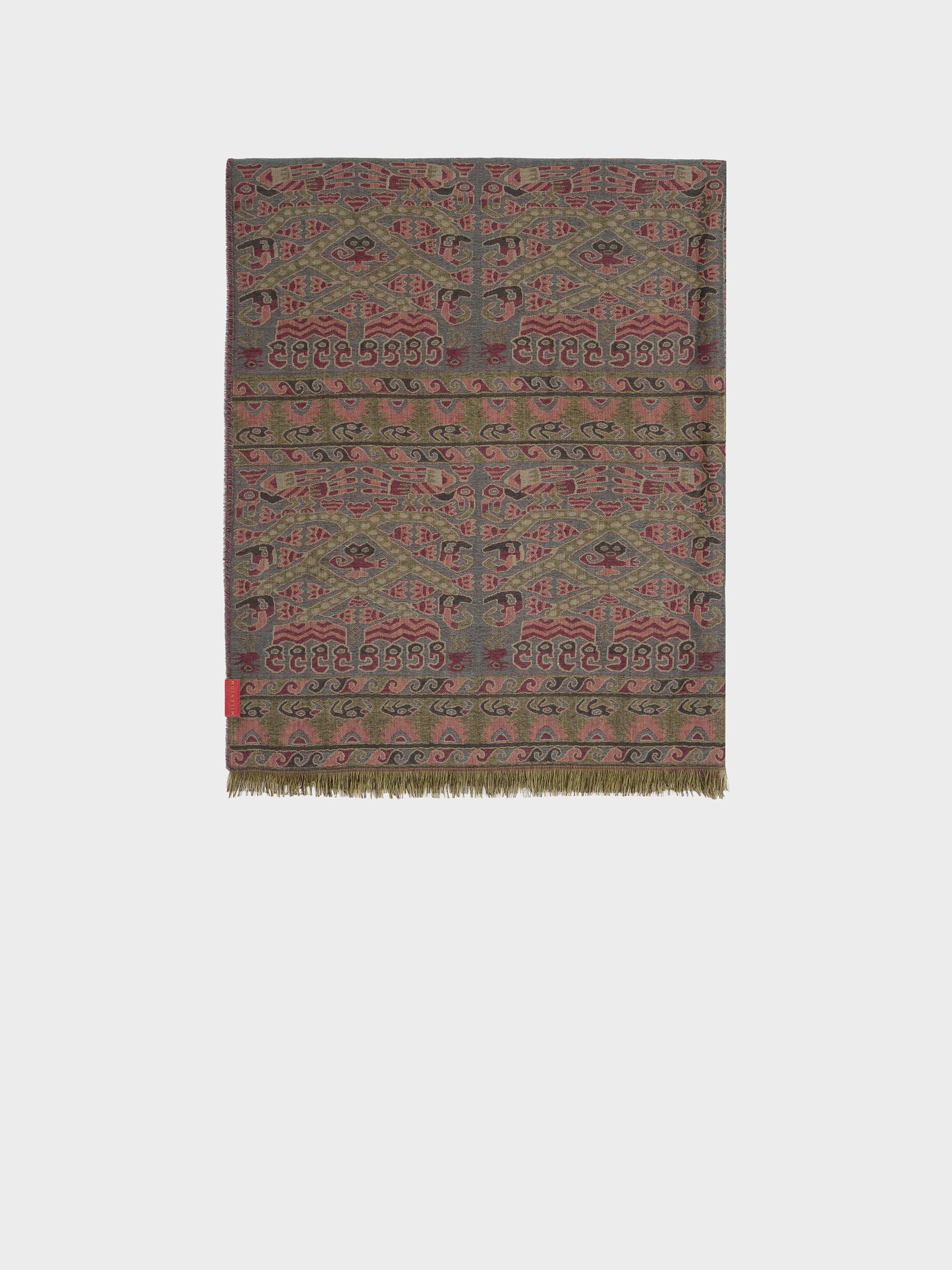 Estola Lambayeque 8 en tonalidad amarillo, elaborada en 50% Royal alpaca y 50% seda, con técnica Jacquard en doble tela e inserción de trama oculta. Con una medida de 200/196 x 93 cm, es una prenda reversible, inspirada en la Cultura Lambayeque, que mantiene viva la tradición ancestral en un diseño representativo de la identidad cultural. | Material predominante: Royal Alpaca y Seda