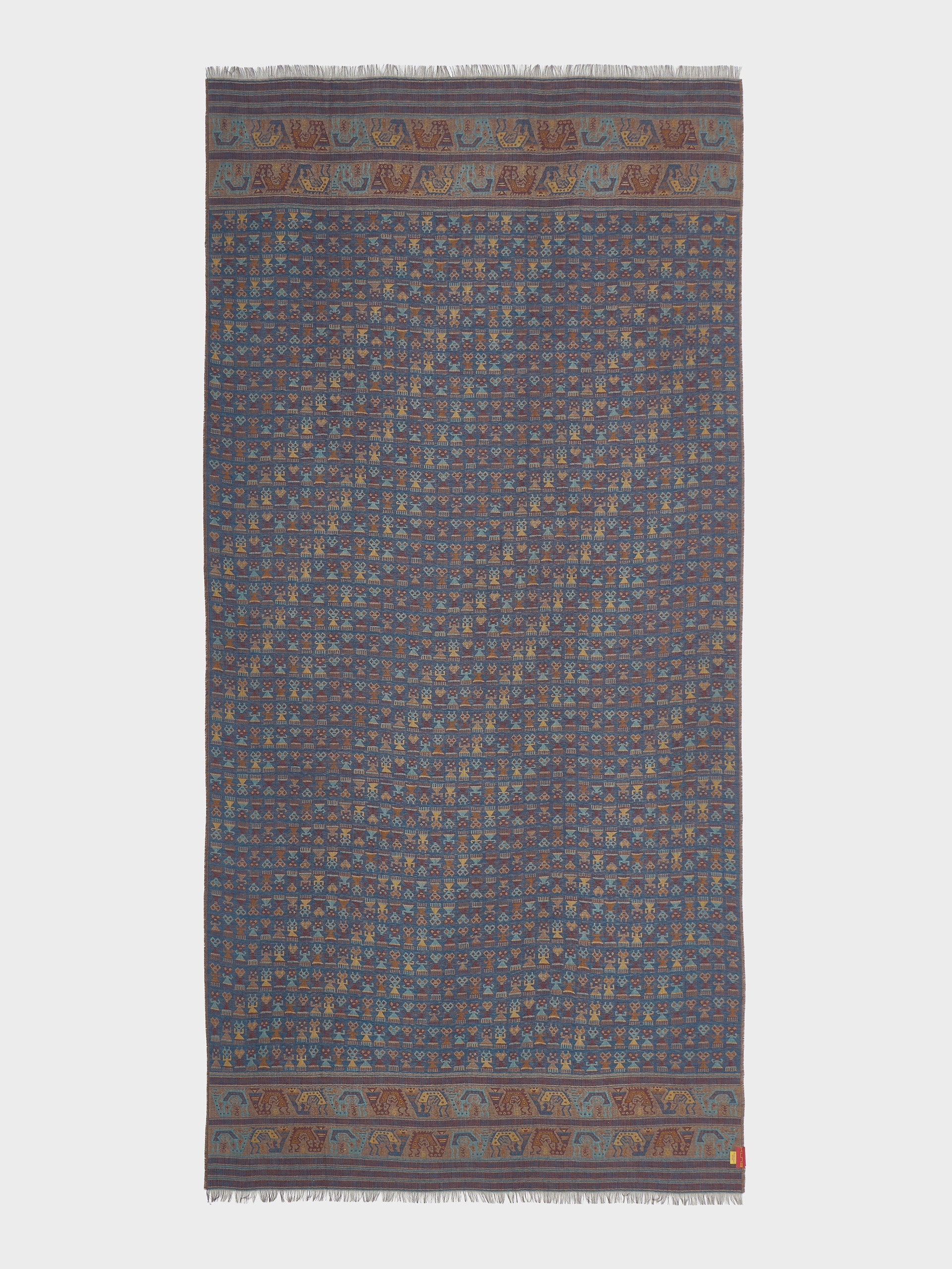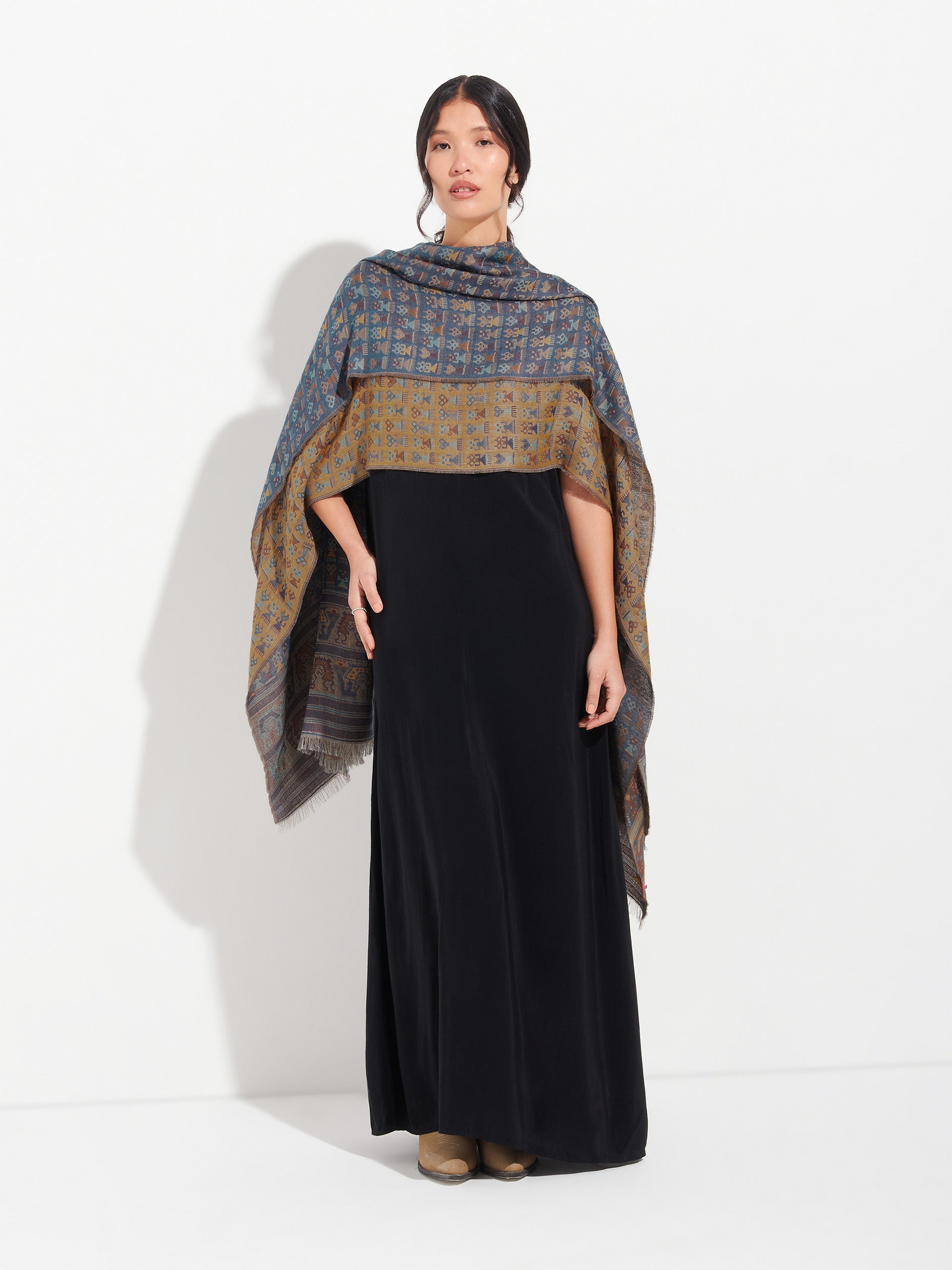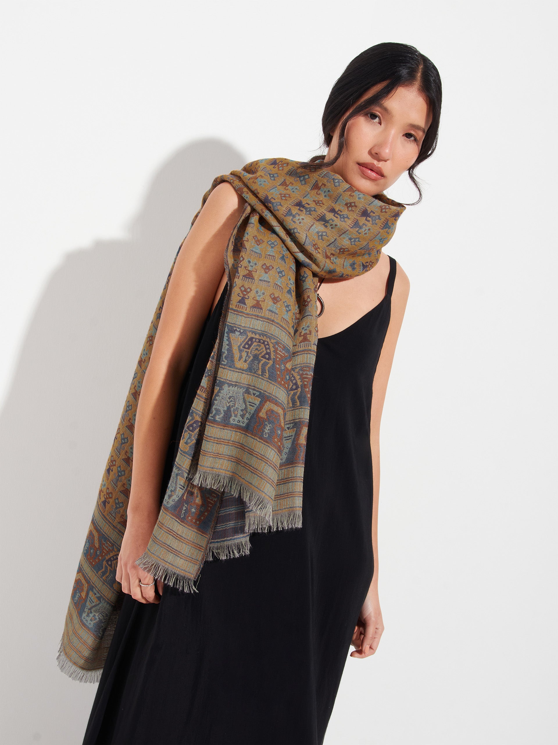 Estola Lambayeque 9 en tonalidad amarillo, elaborada en 50% Royal alpaca y 50% seda, con técnica Jacquard en doble tela e inserción de trama oculta. Con una medida de 200/196 x 93 cm, es una prenda reversible, inspirada en la Cultura Lambayeque, que reinterpreta la tradición ancestral a través de un diseño con esencia cultural. | Material predominante: Royal Alpaca y Seda