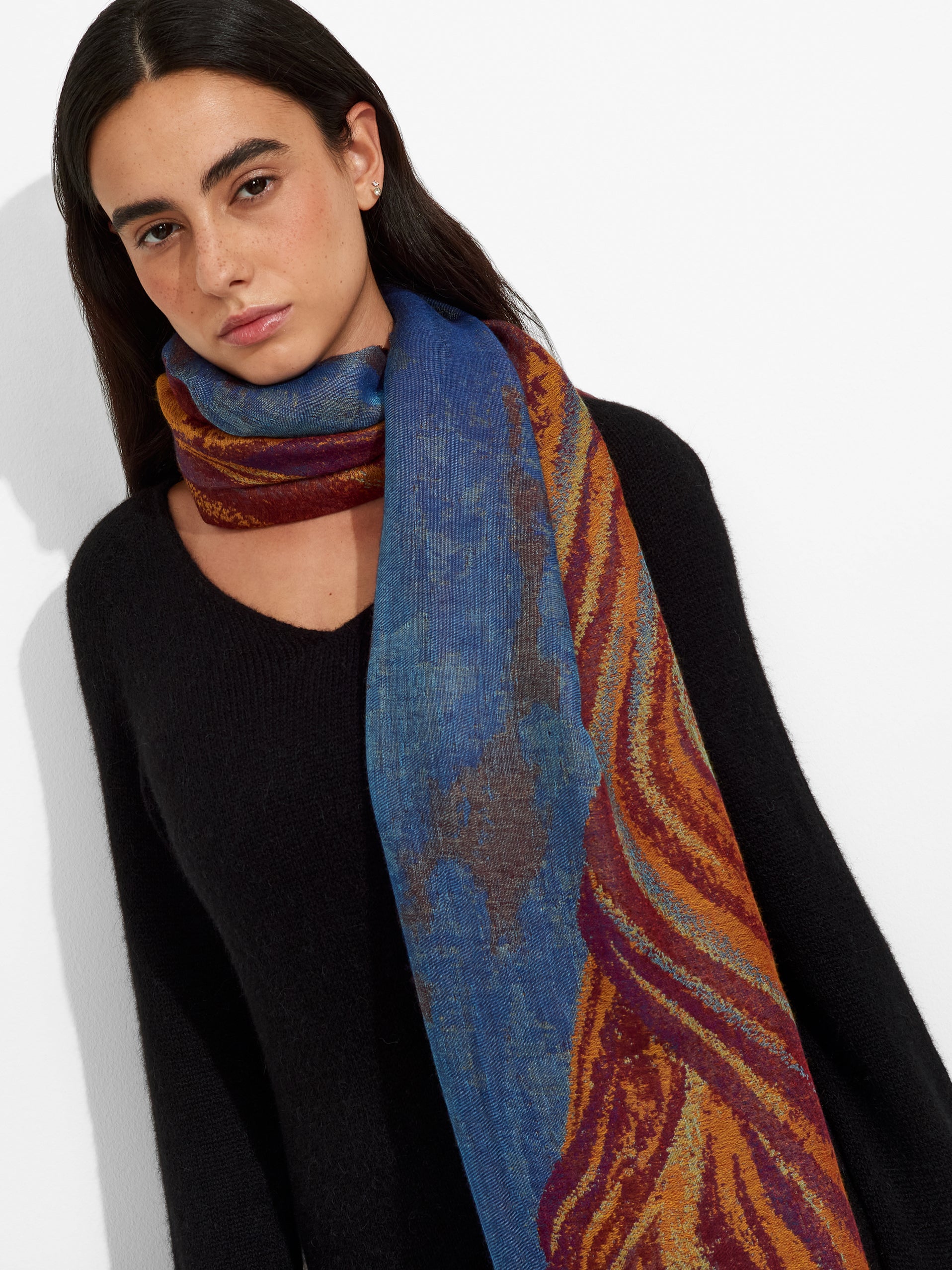 Entre las mágicas montañas de la altiplanicie peruana, emerge imponente una deidad extraviada en la serranía, elevándose sobre la cordillera de los Andes. Vinicunca, la majestuosa y encantadora montaña de siete colores, en sus entrañas protege la sabiduría ancestral de matices que estremecen el ambiente con mágicas tonalidades. | Material predominante: Royal Alpaca y Seda