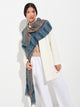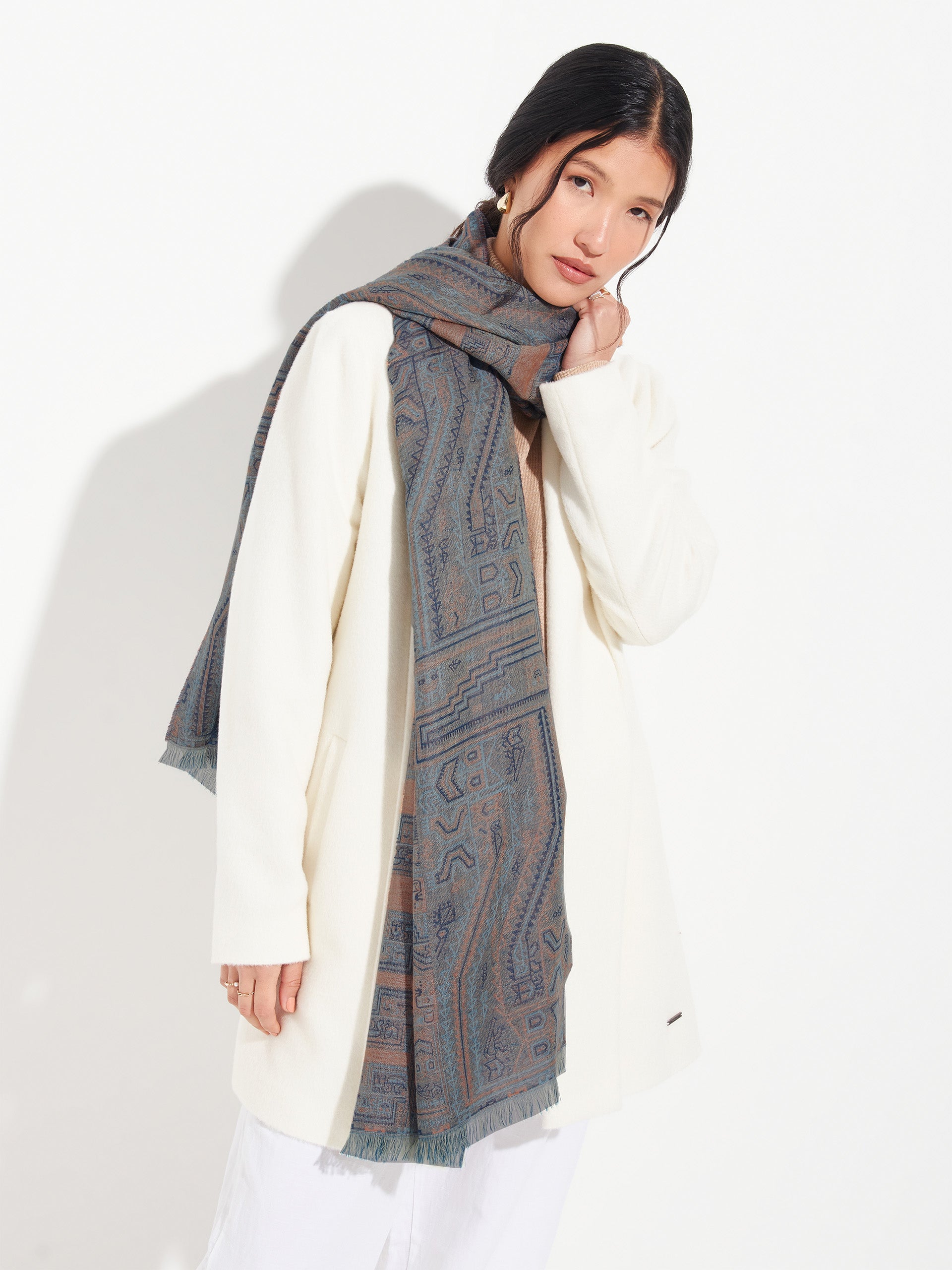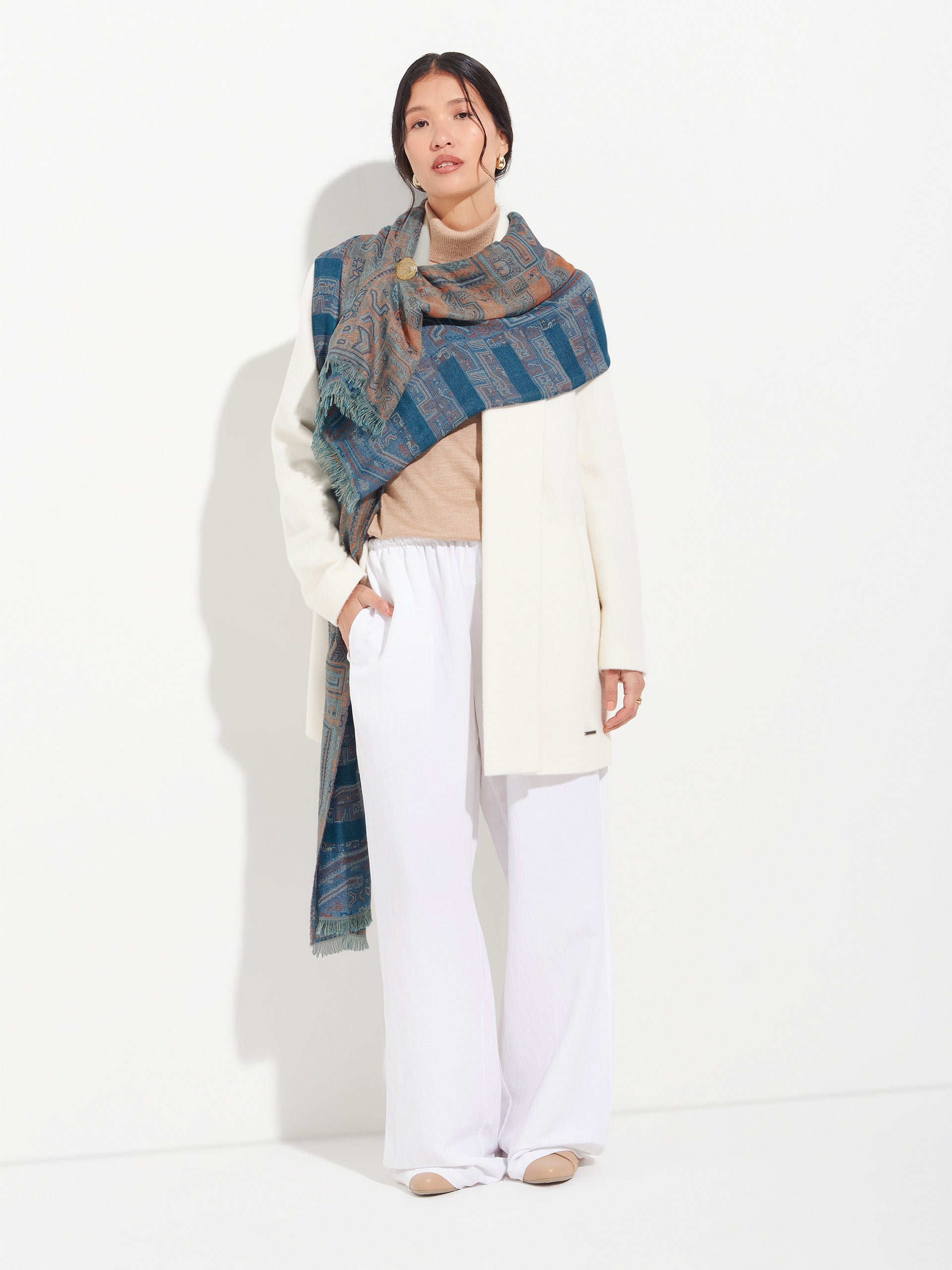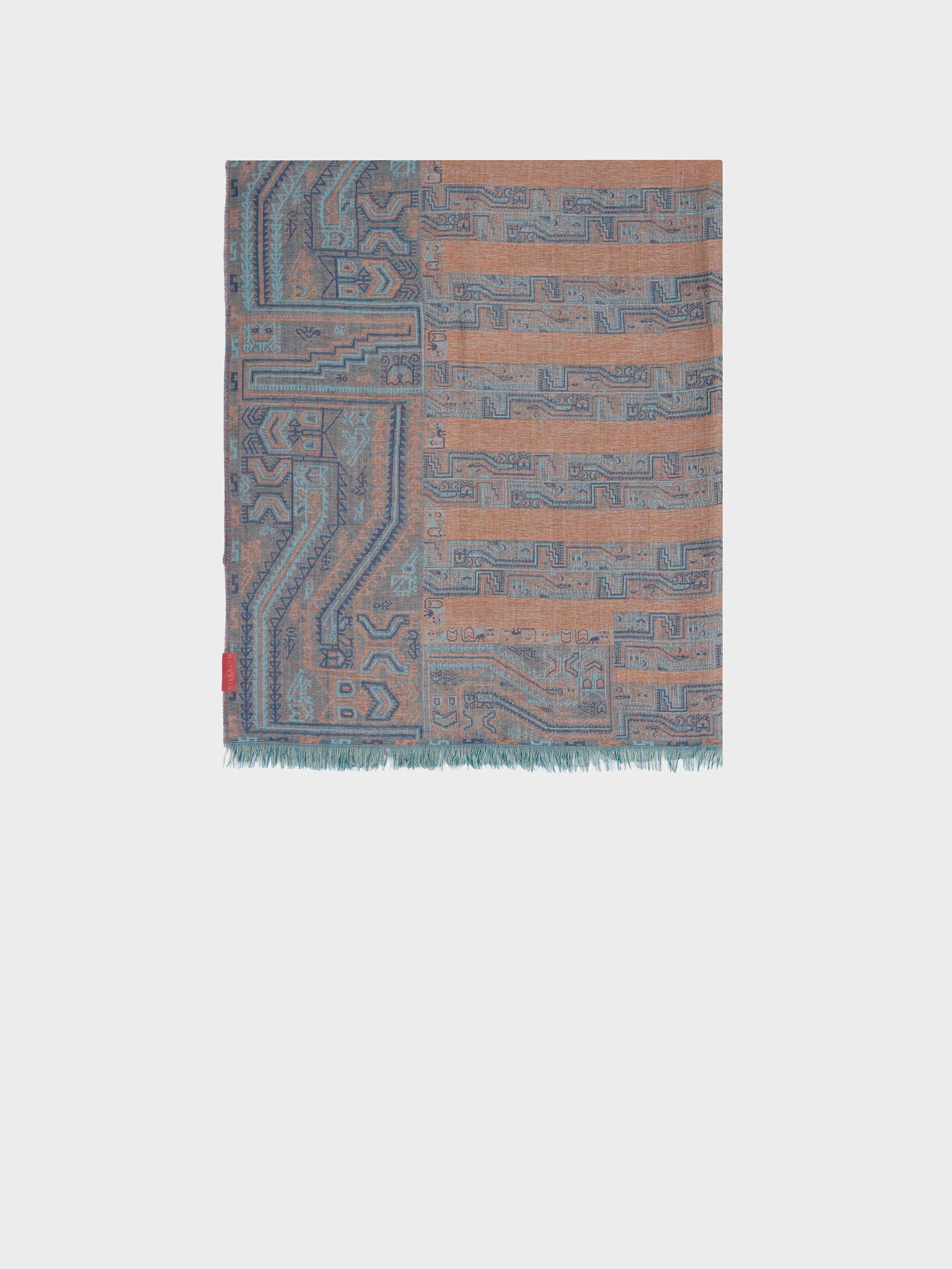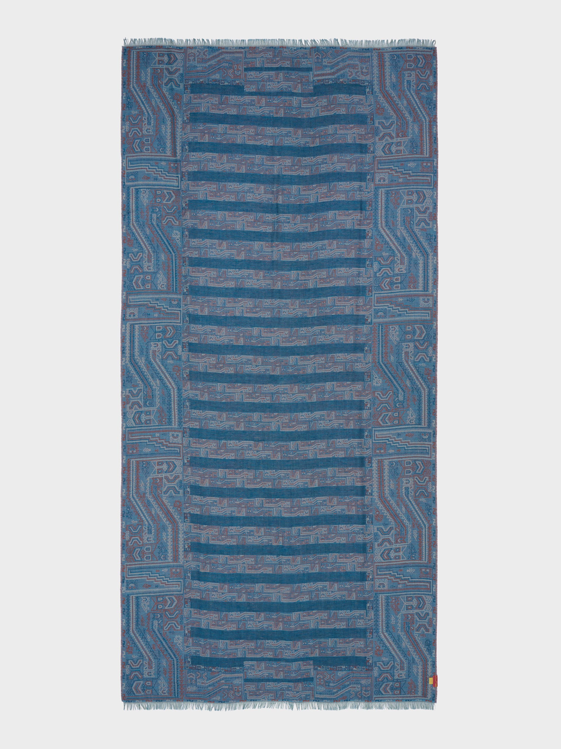 Estola Paracas 19 en tonalidad azul, elaborada en 50% Royal alpaca y 50% seda, con técnica Jacquard en doble tela e inserción de trama oculta. Con una medida de 200/196 x 93 cm, es una prenda reversible, inspirada en la Cultura Paracas, que transmite la herencia ancestral mediante un diseño con profundo significado cultural. | Material predominante: Royal Alpaca y Seda