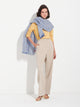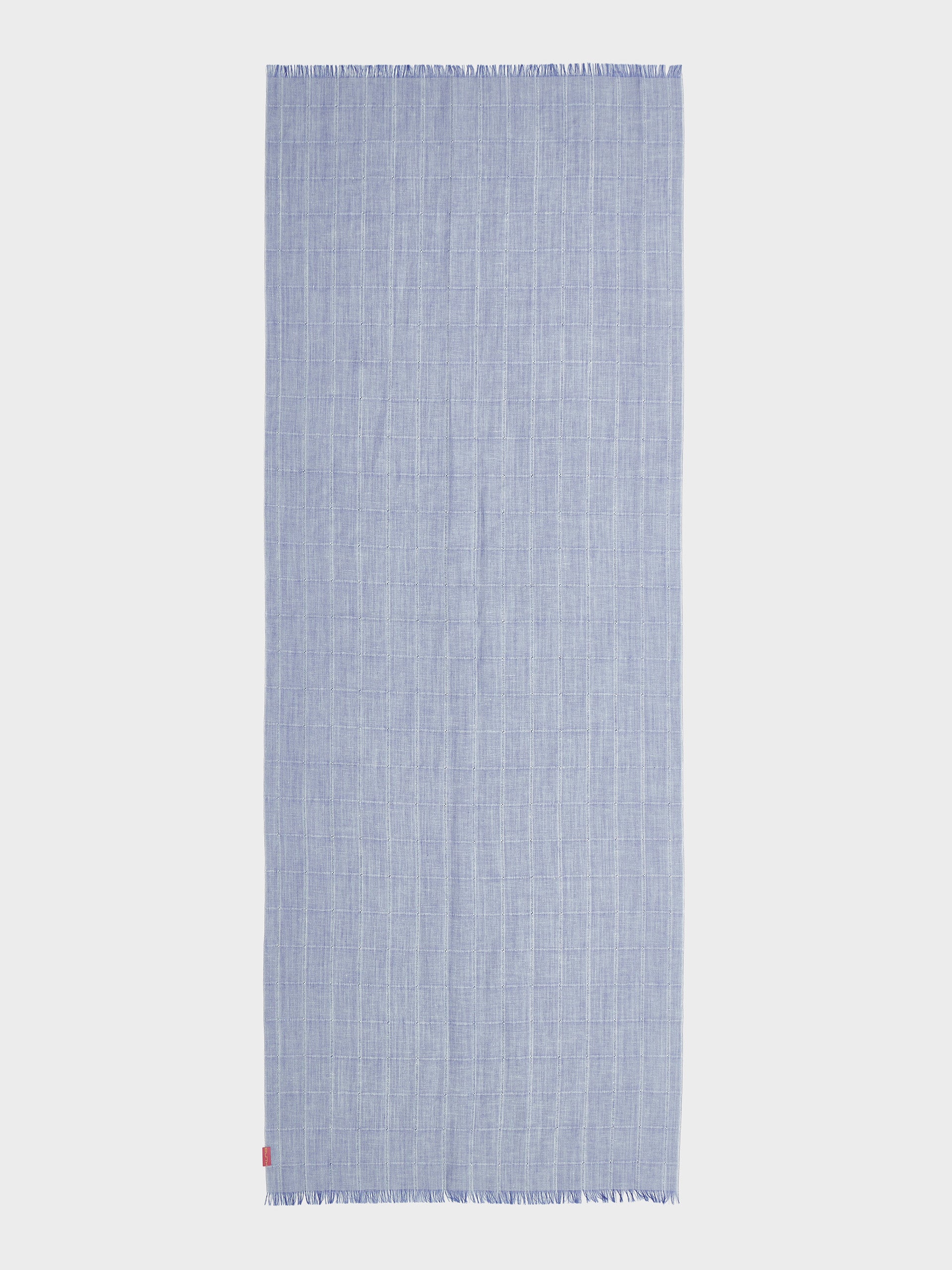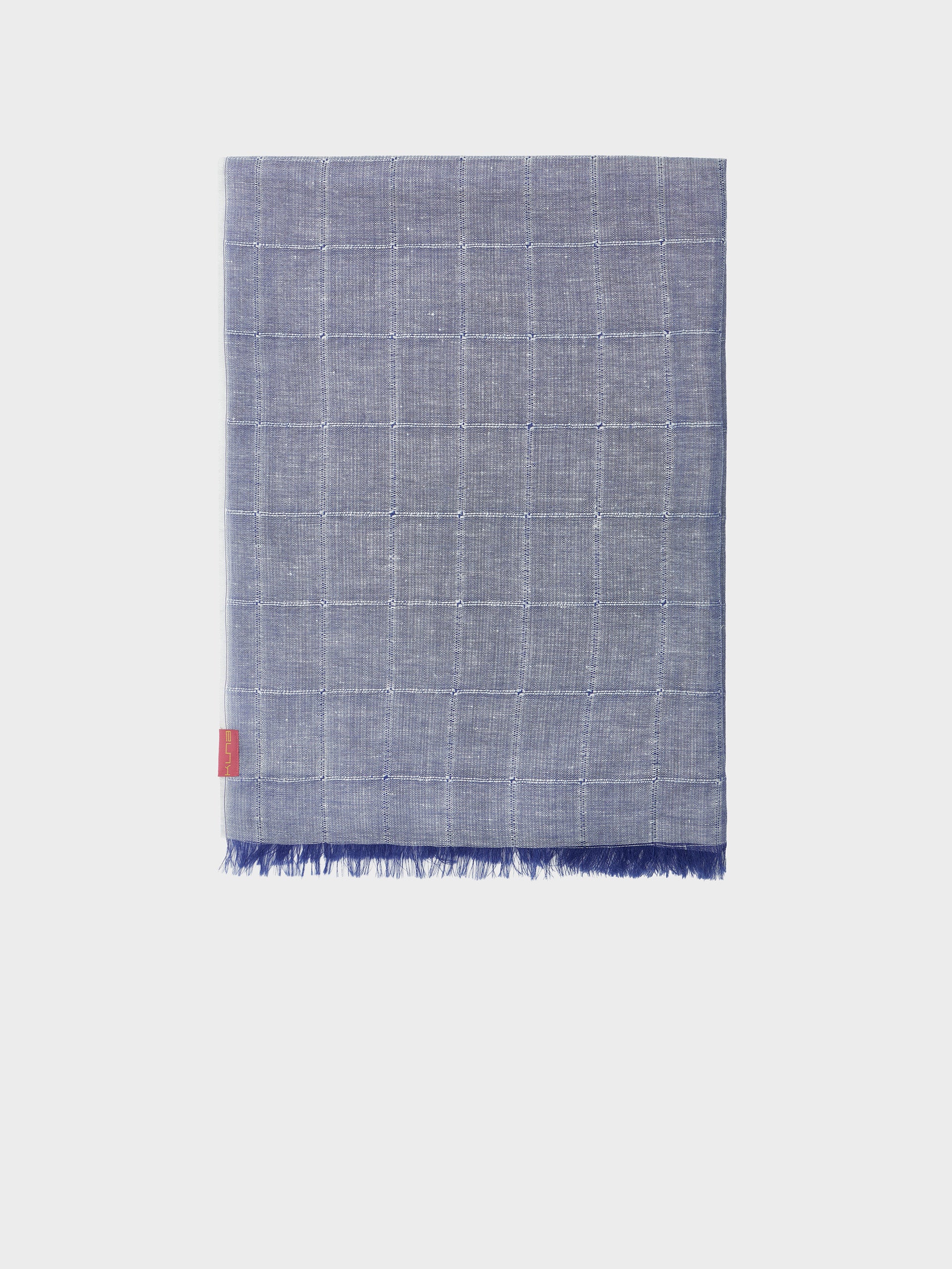 Estola Zoda en tonalidad azul, elaborada en una mezcla de baby alpaca, seda y lino. Presenta un diseño a cuadros en panamá y tafetán con acabado desflecado, que combina ligereza, frescura y estilo artesanal. | Material predominante: Baby Alpaca