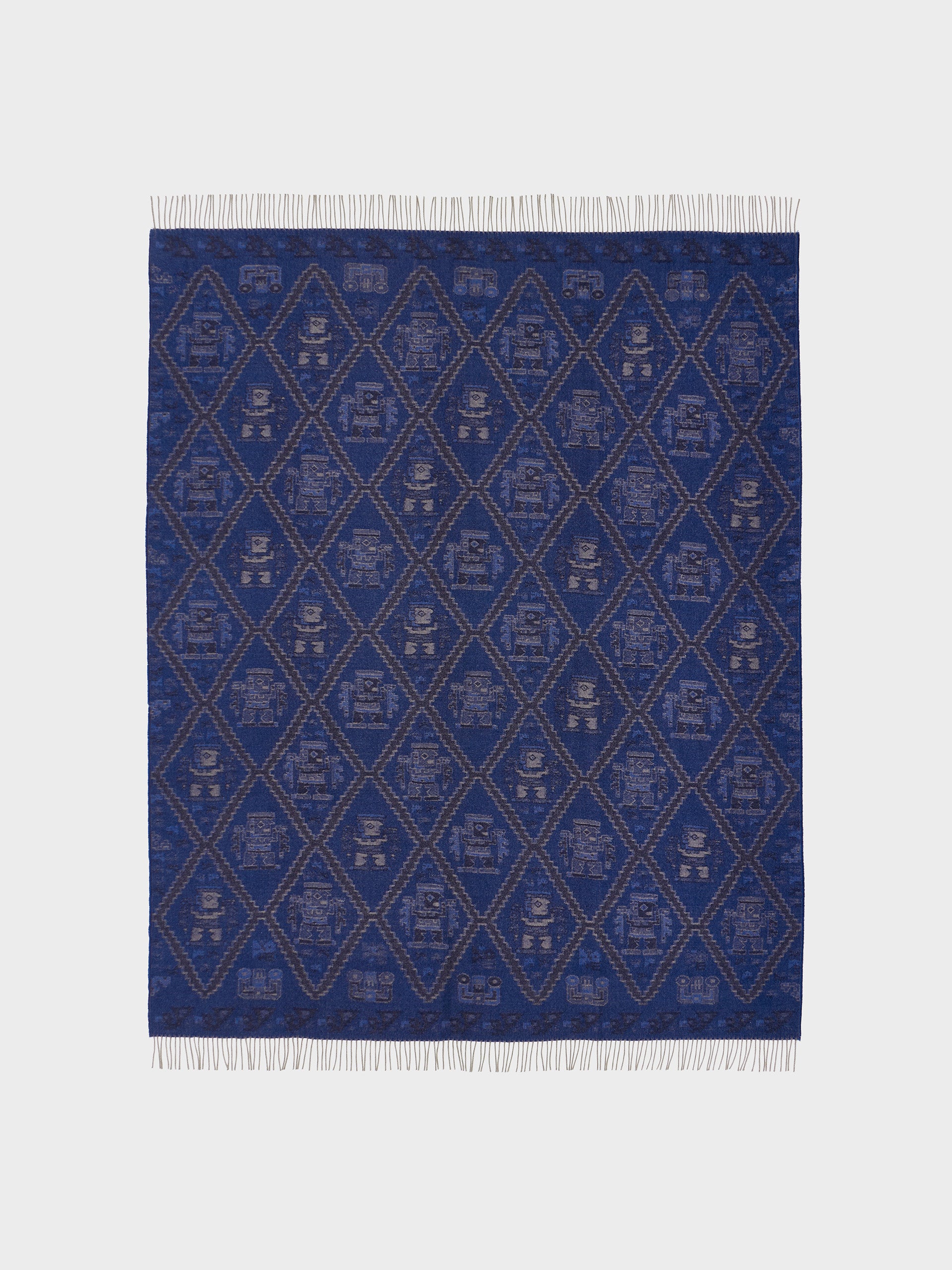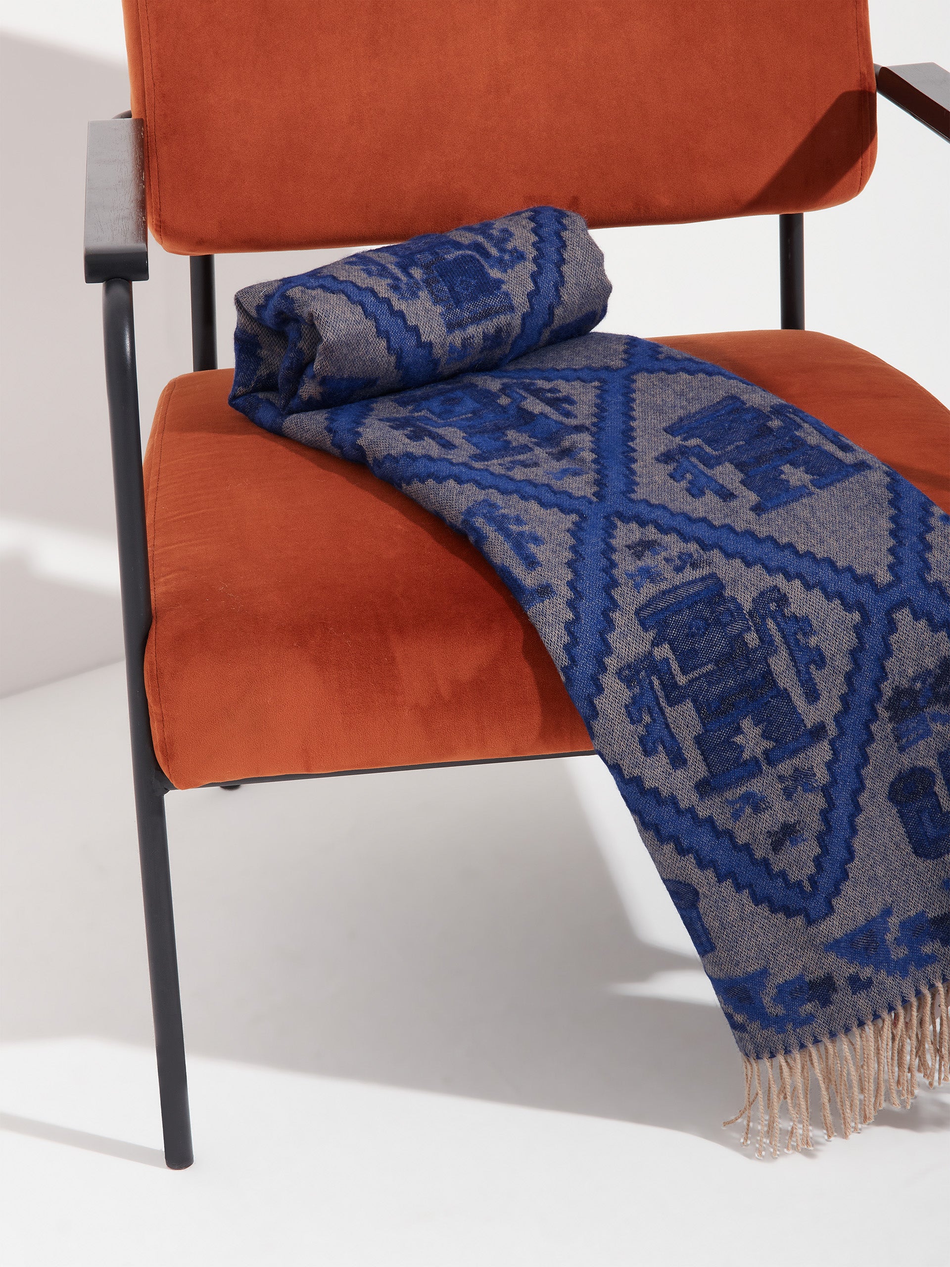 Manta Mochica 2 en tonalidad azul, elaborada en 100% baby alpaca con técnica Jacquard en doble cara. Con una medida de 200/184 x 145 cm, está inspirada en la Cultura Mochica, que reinterpreta el legado ancestral en un diseño inspirado en la cultura originaria. | Material predominante: Baby Alpaca