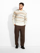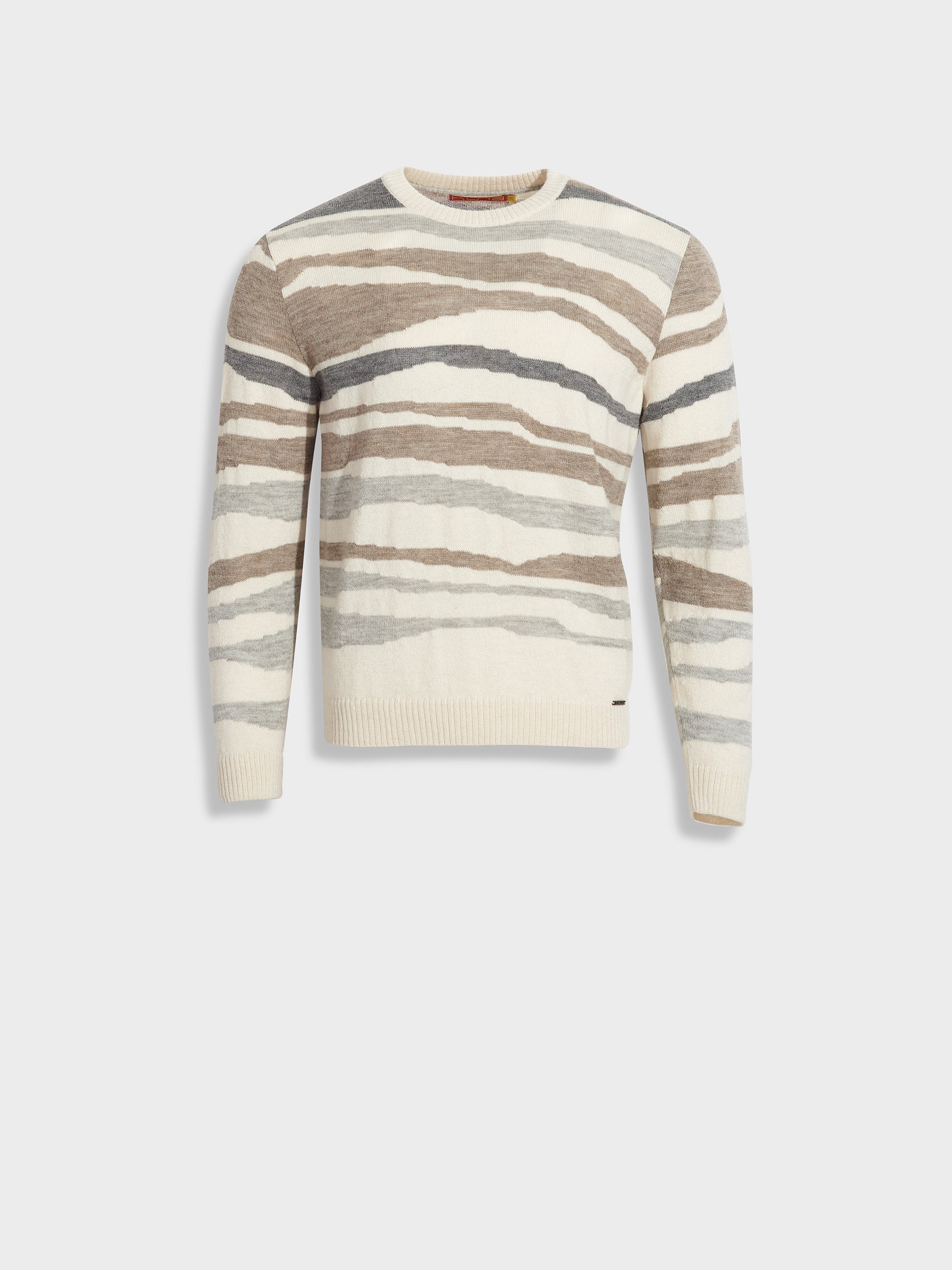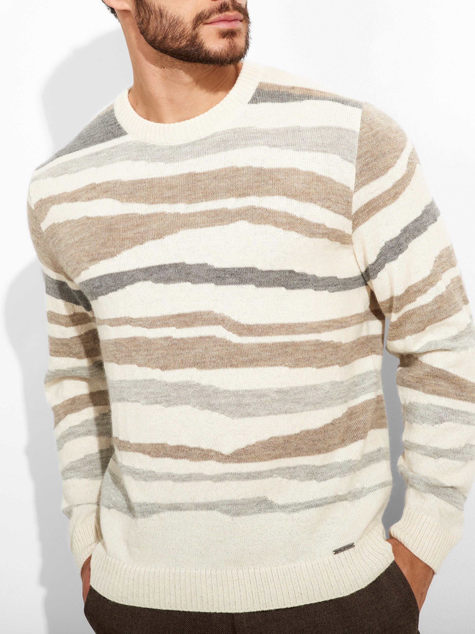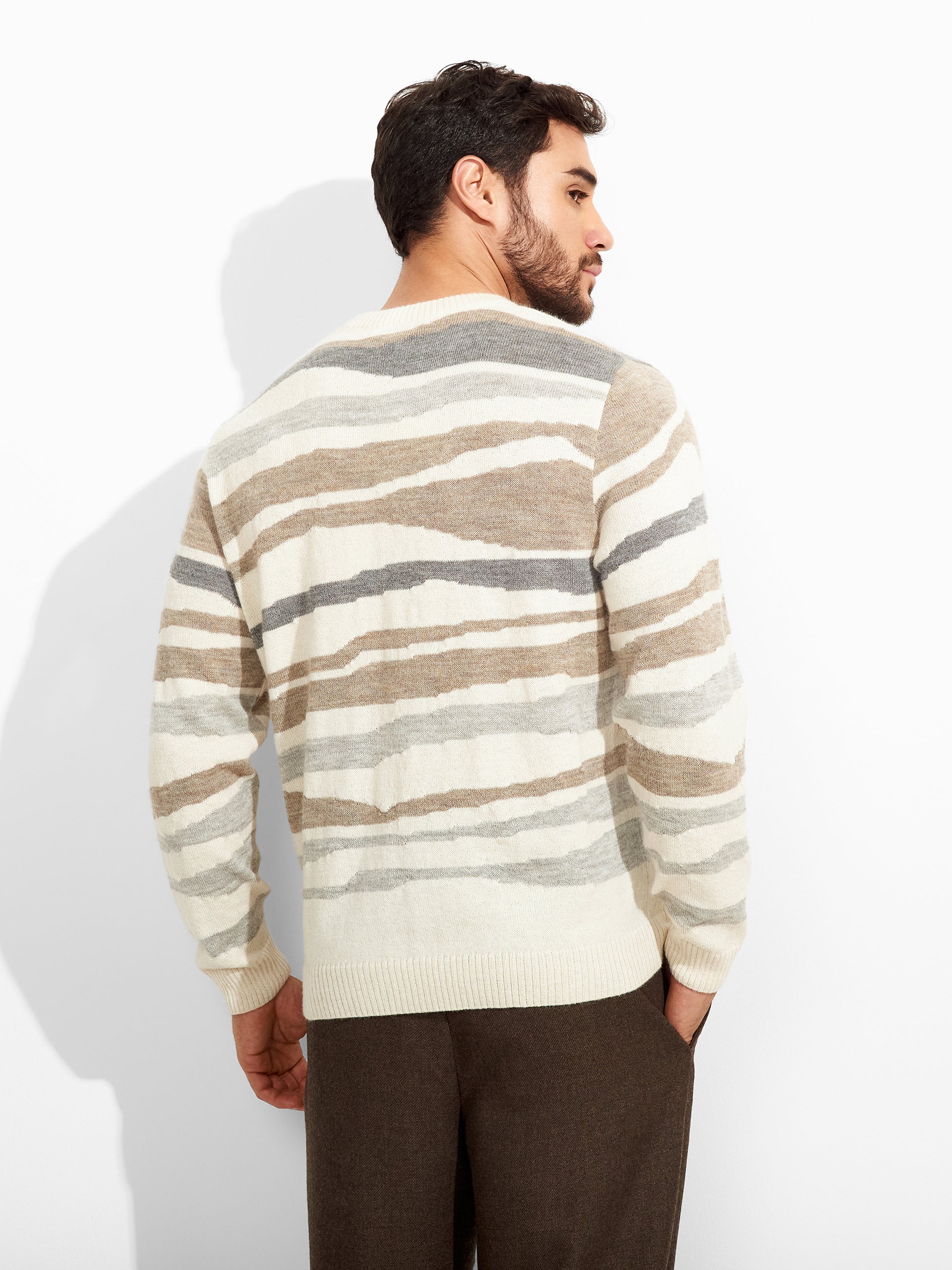 Suéter Zar en tonalidad beige, con diseño de líneas irregulares y cuello redondo. Presenta puños y pretina en rib que refuerzan su estructura. Confeccionado en baby alpaca, brinda calidez y suavidad. | Material predominante: Baby Alpaca