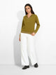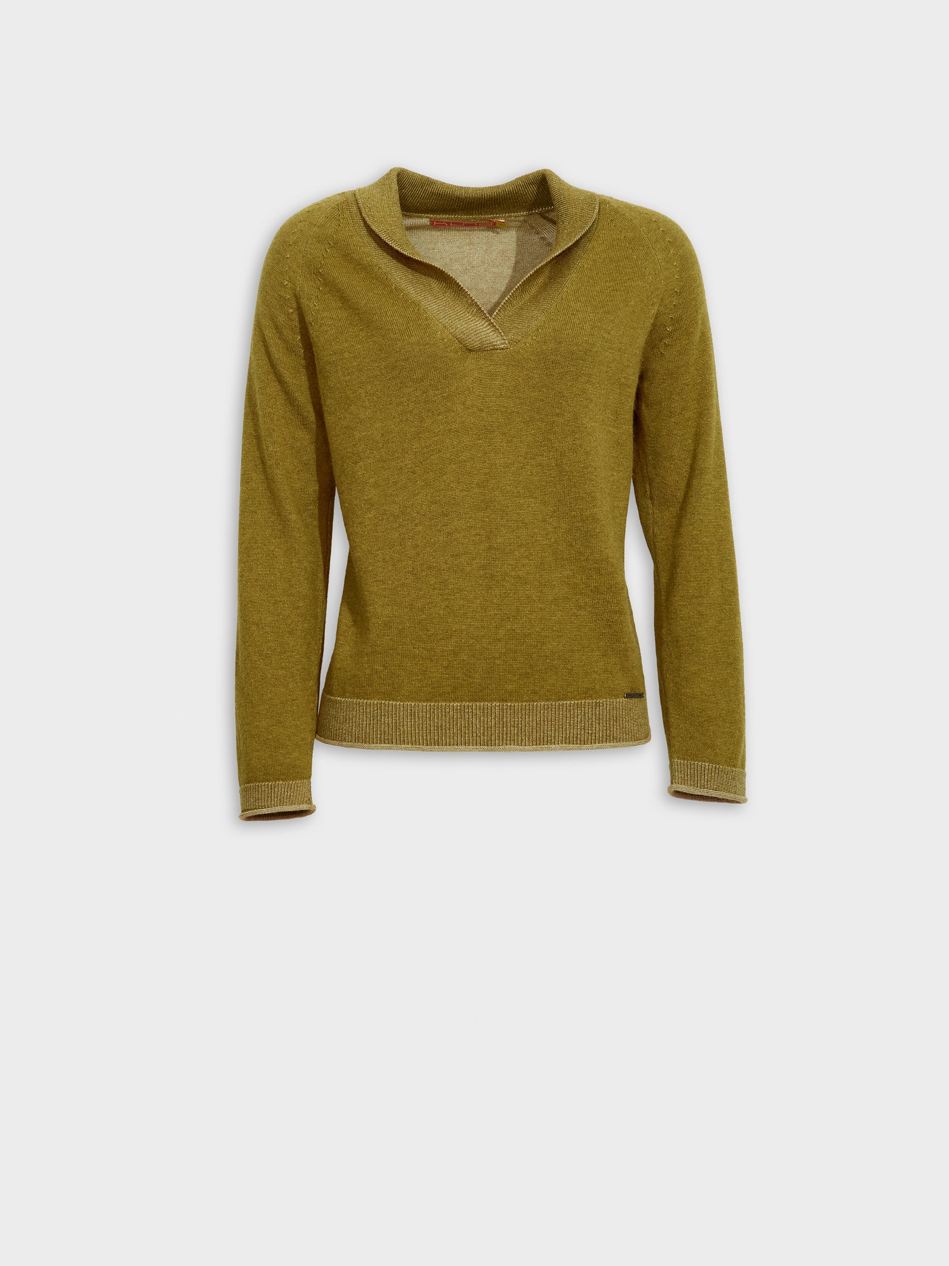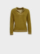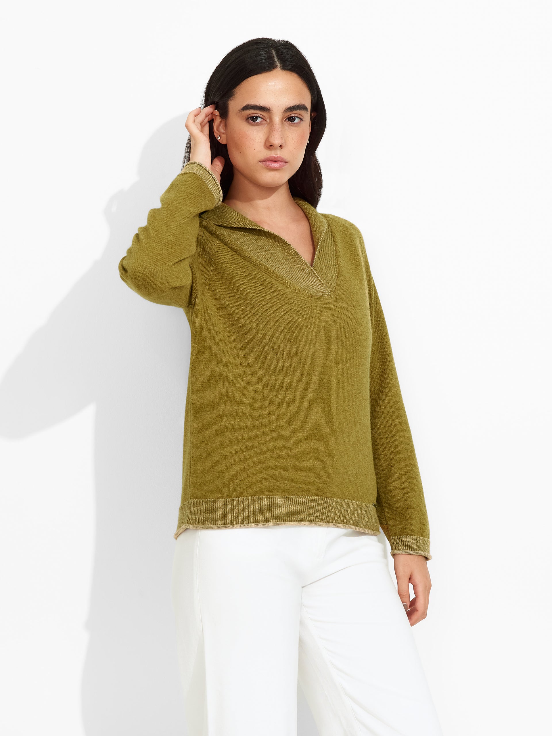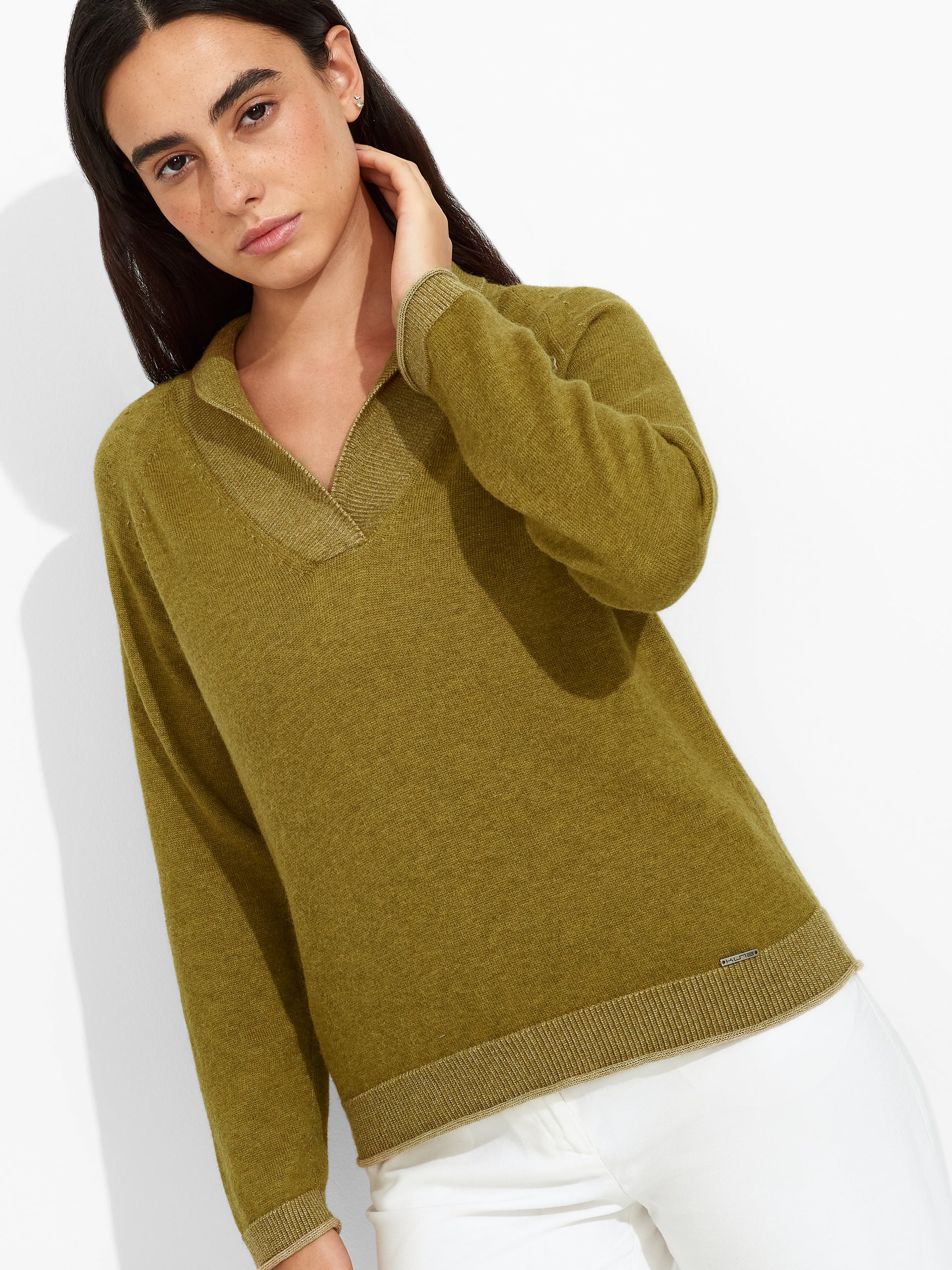 Suéter Zolena en tonalidad verde, con escote de rib en forma de "V". Confeccionado en una mezcla de algodón y baby alpaca que aporta suavidad y comodidad. | Material predominante: Algodon